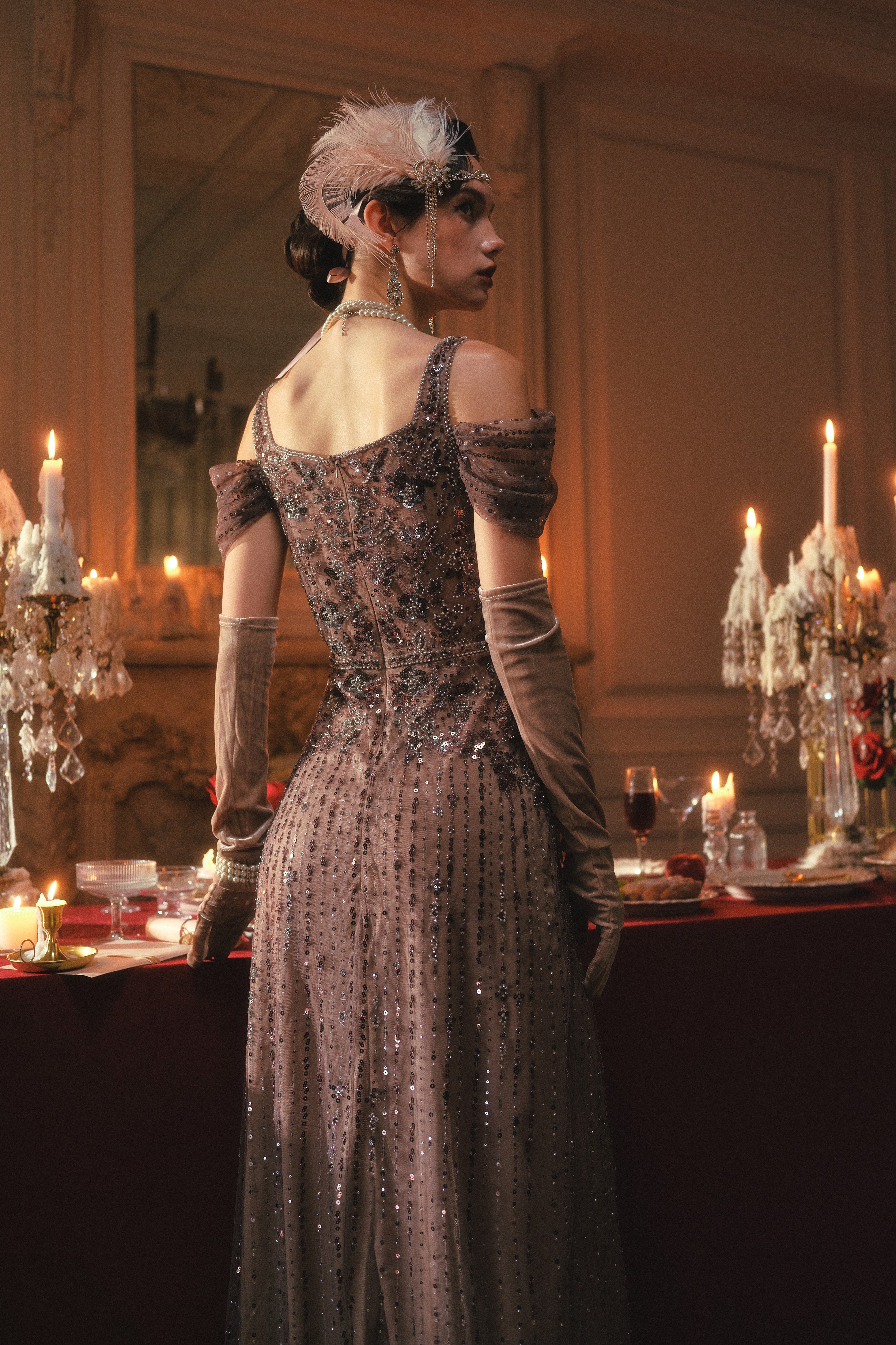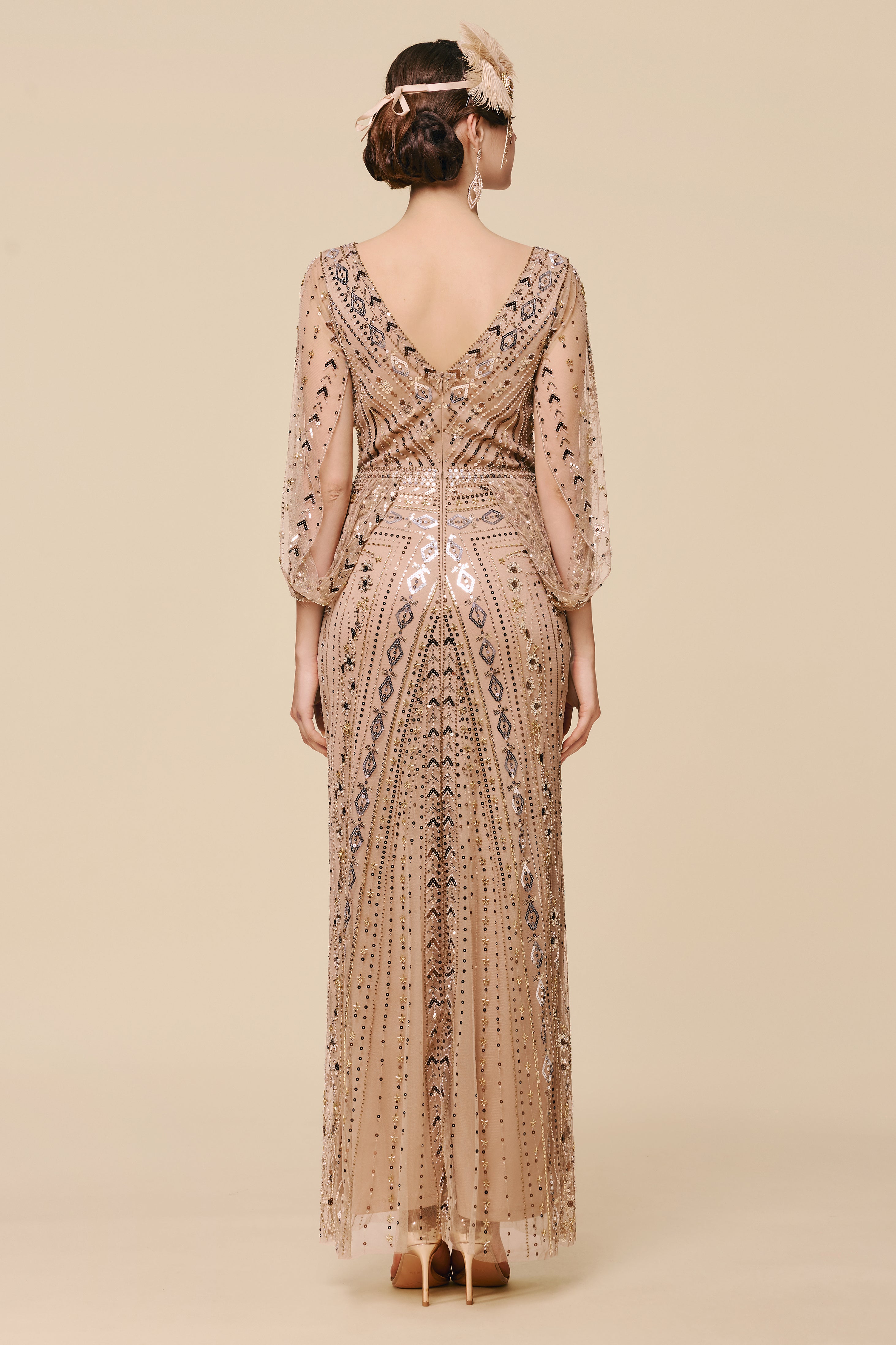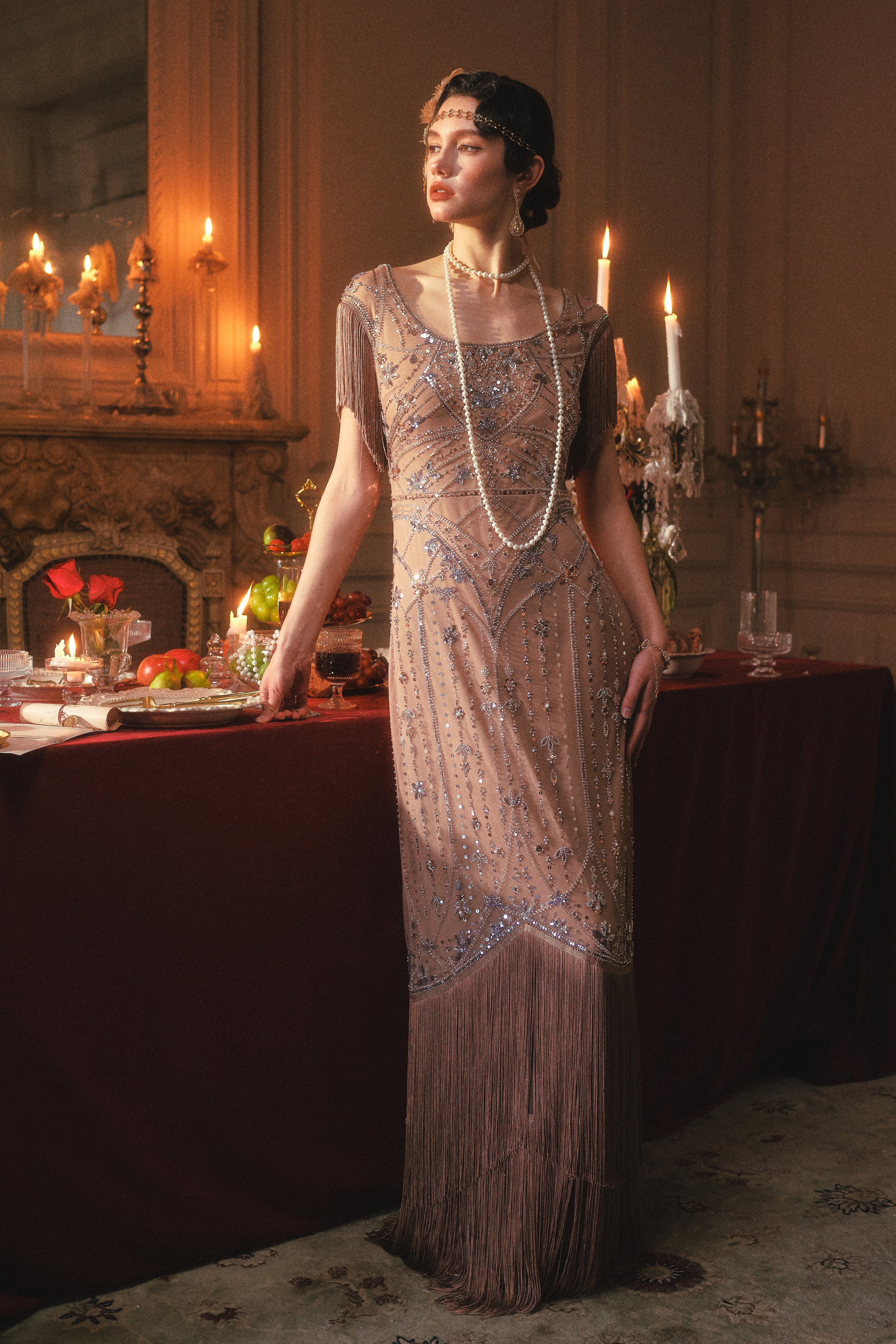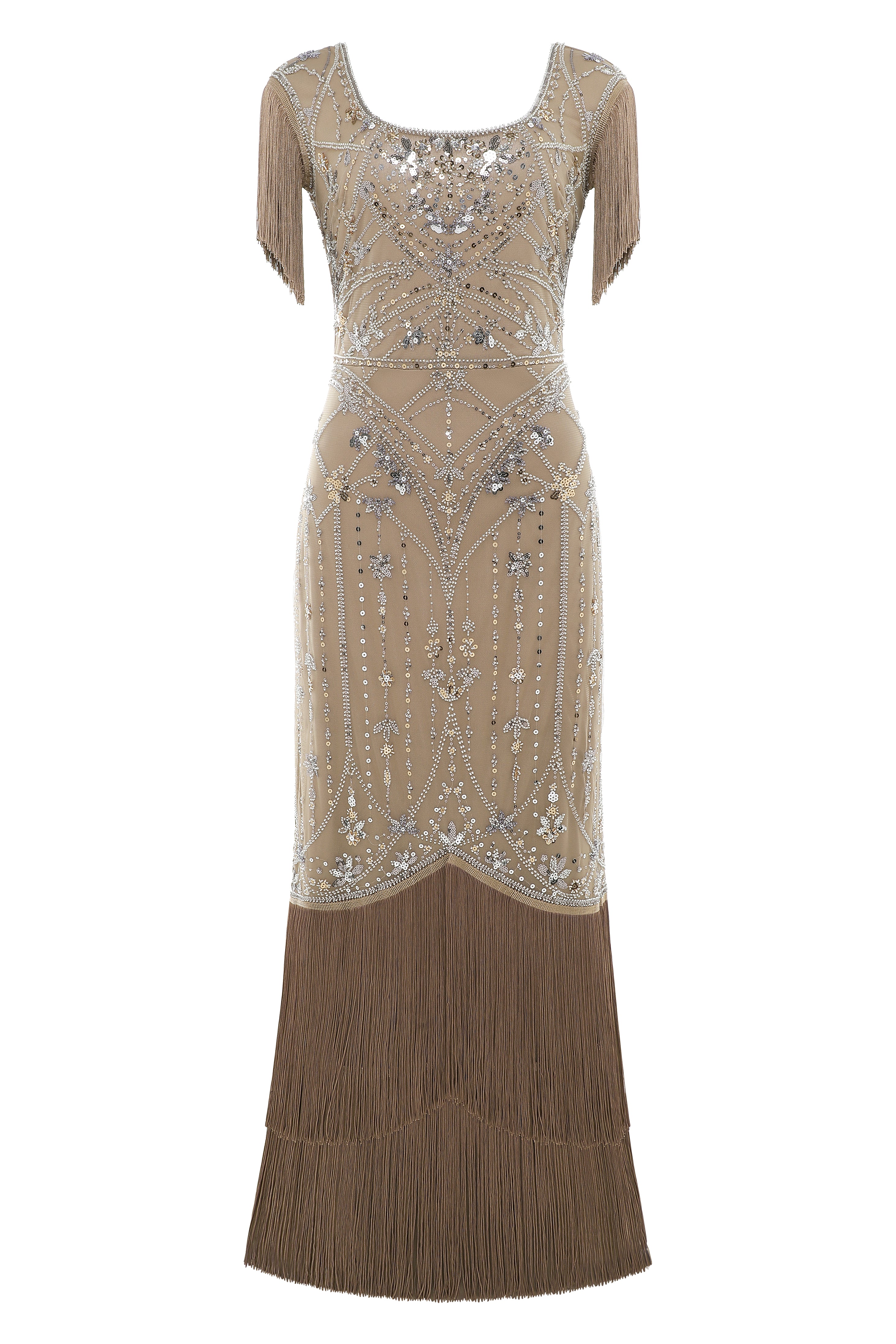Warm Brown Art Deco Beaded Fringed Evening Gown