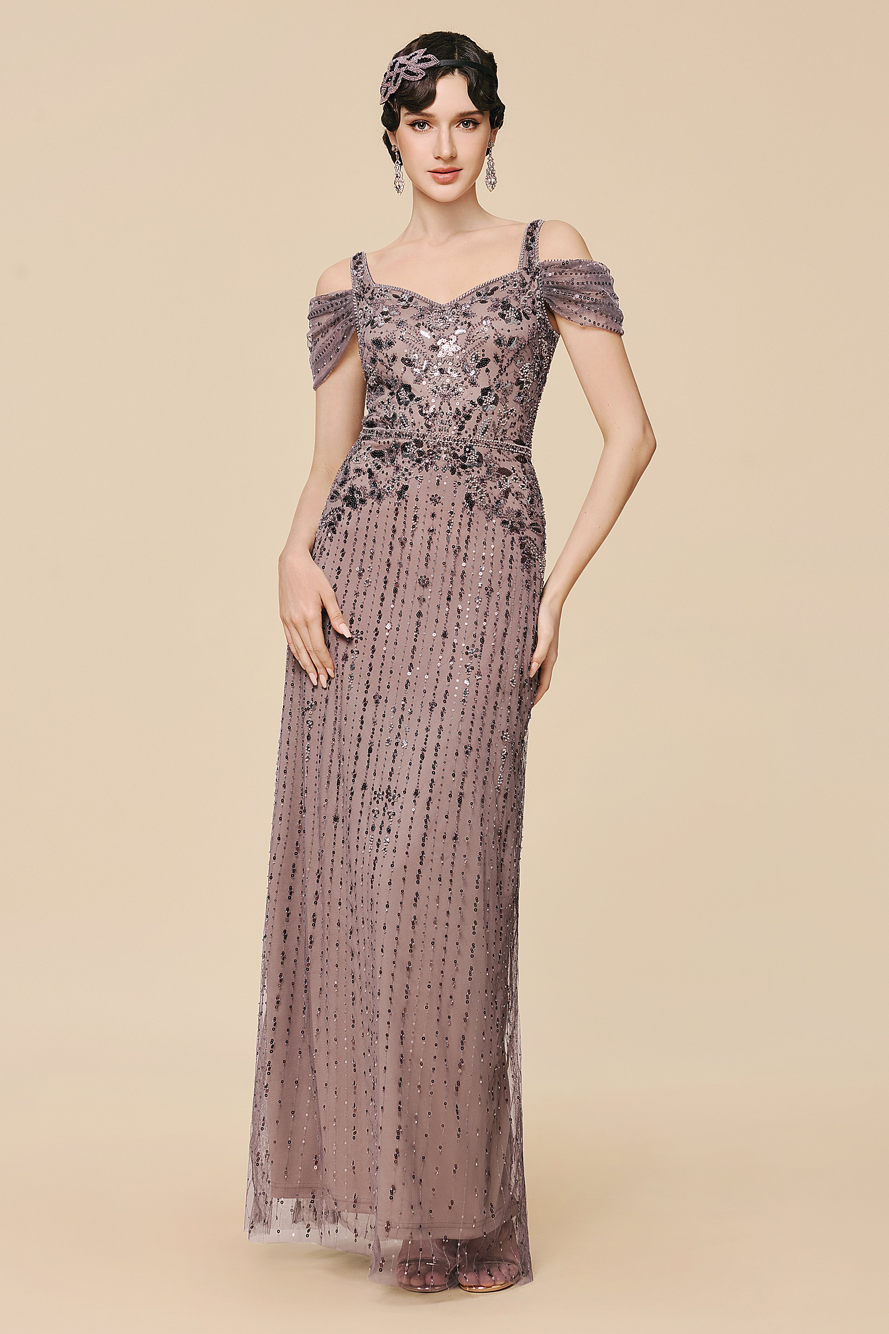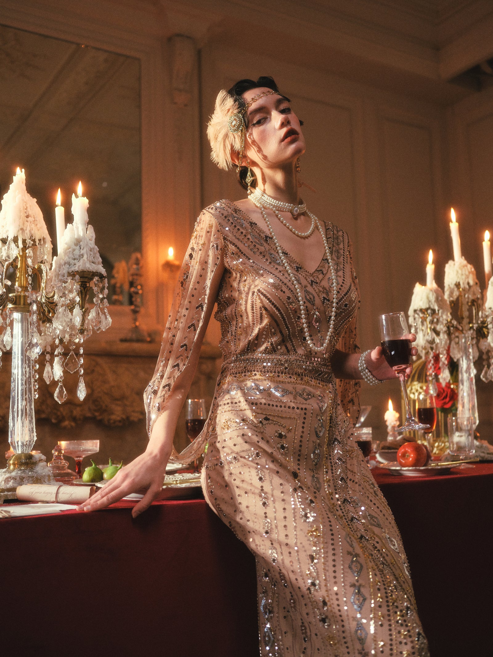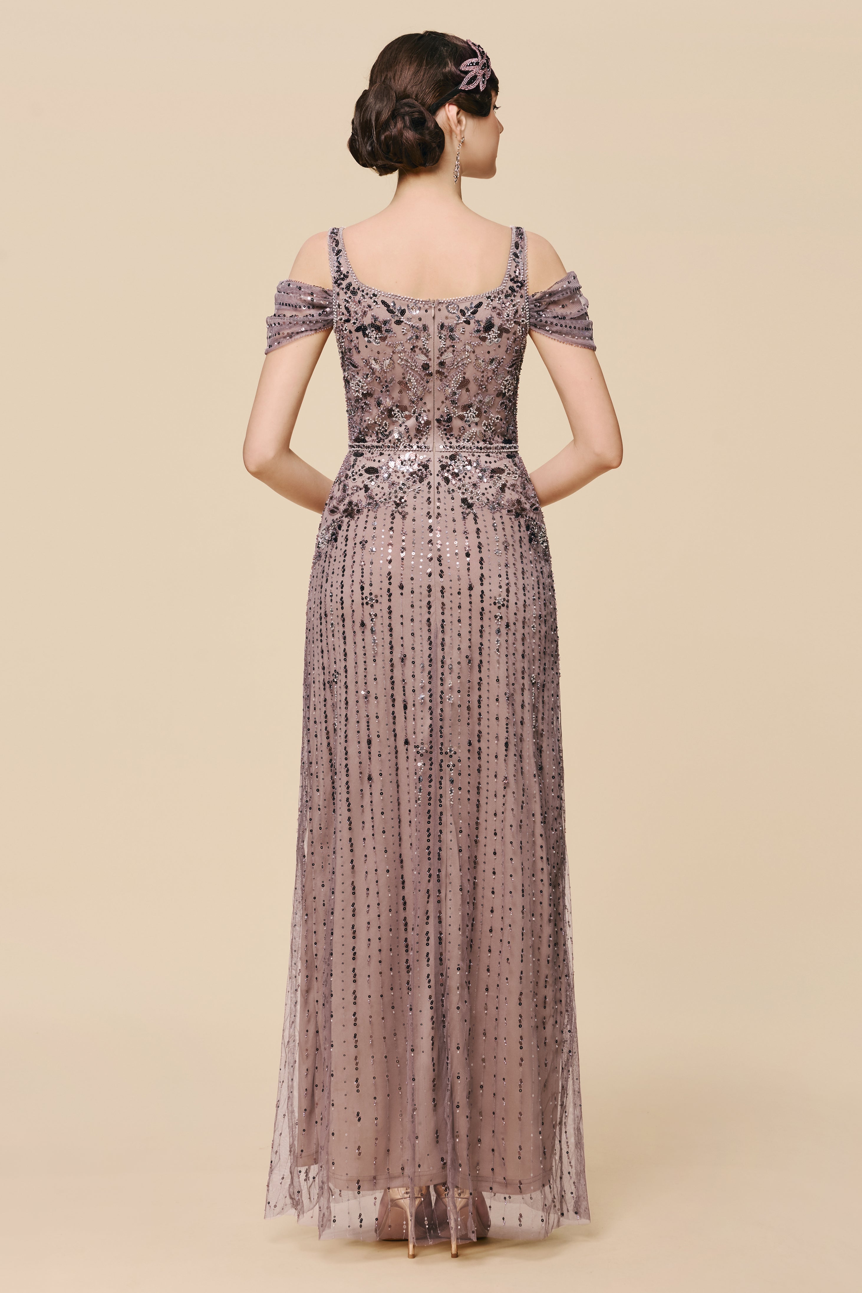 Warm Brown Art Deco Beaded Fringed Evening Gown