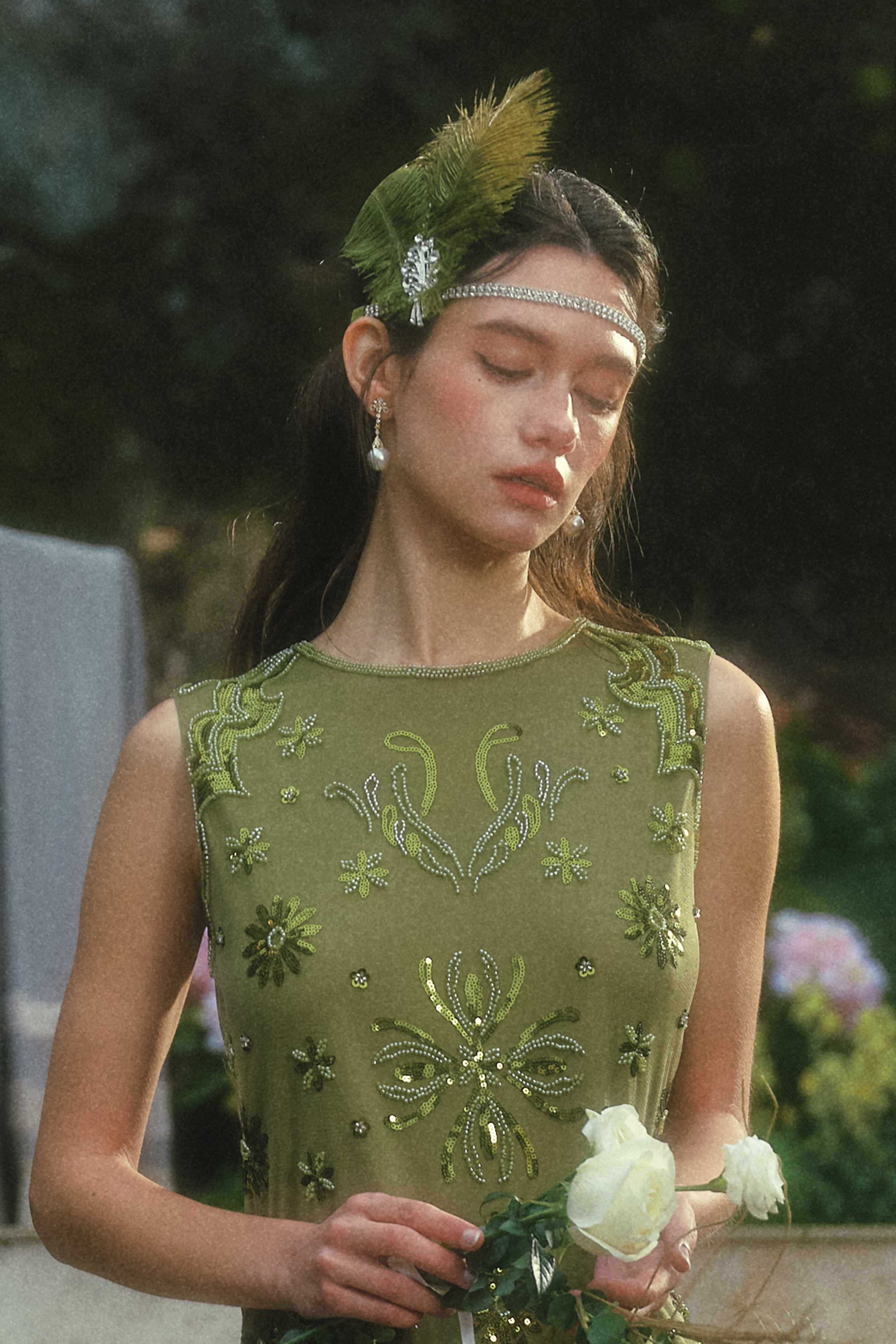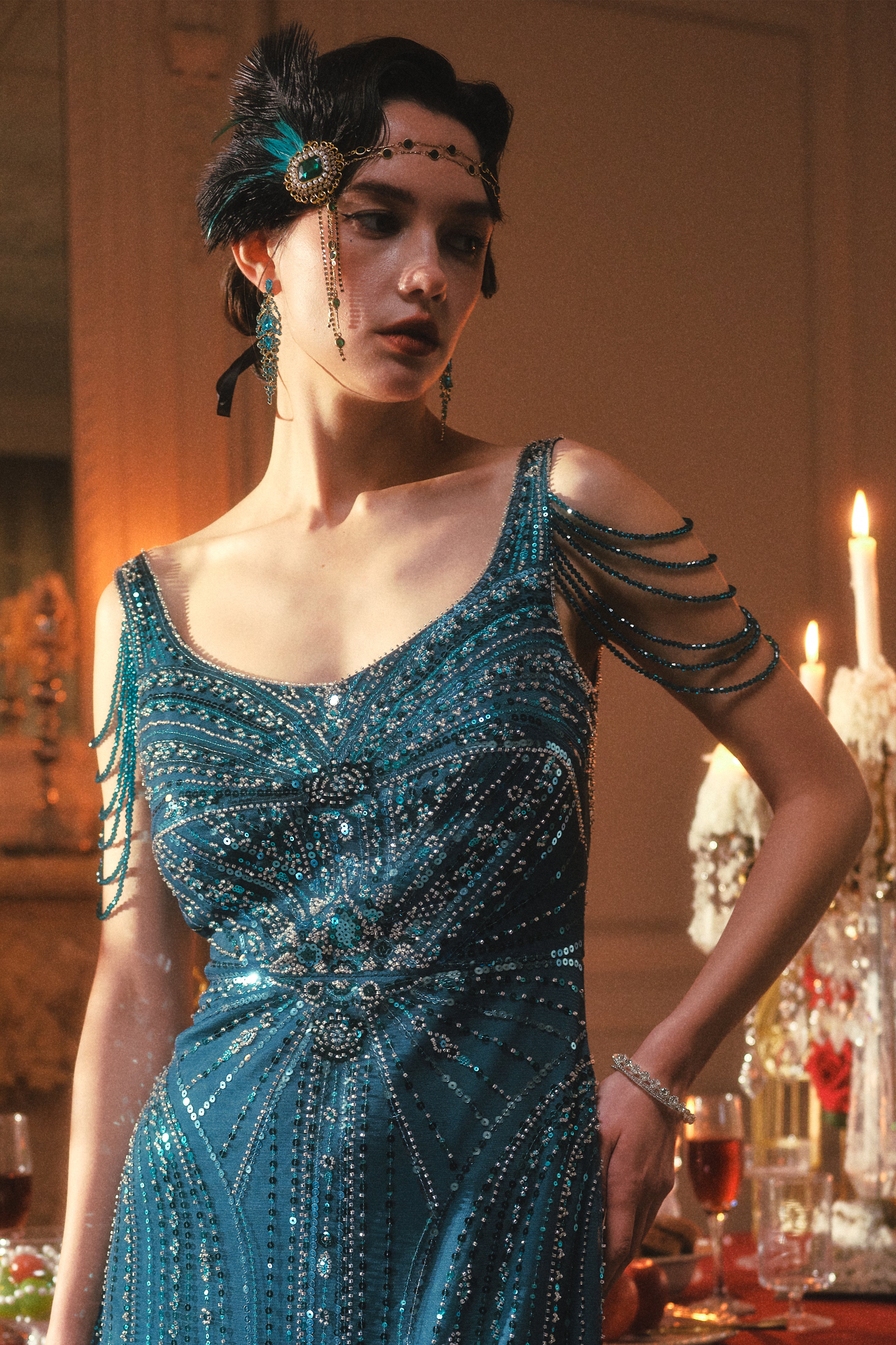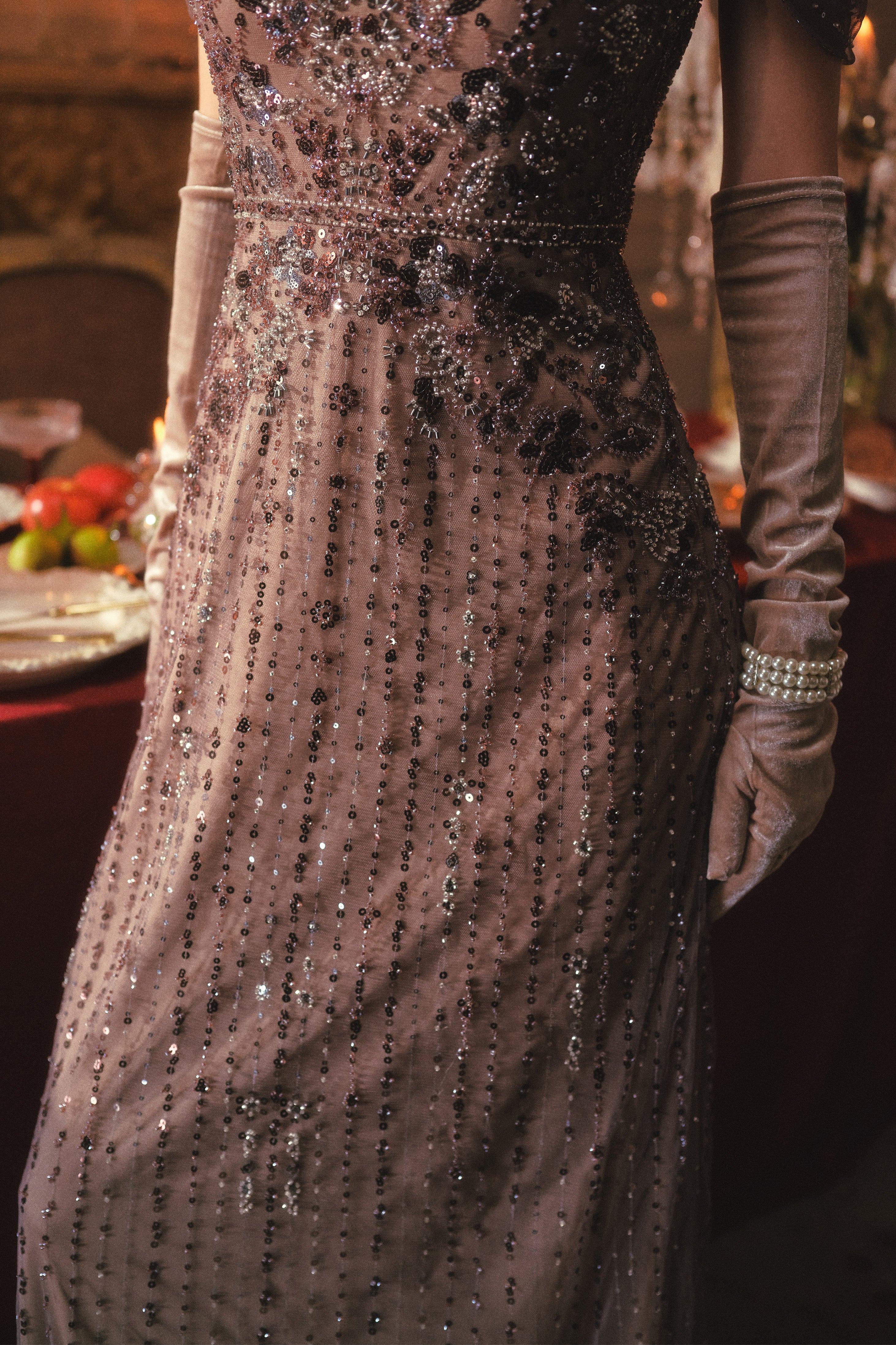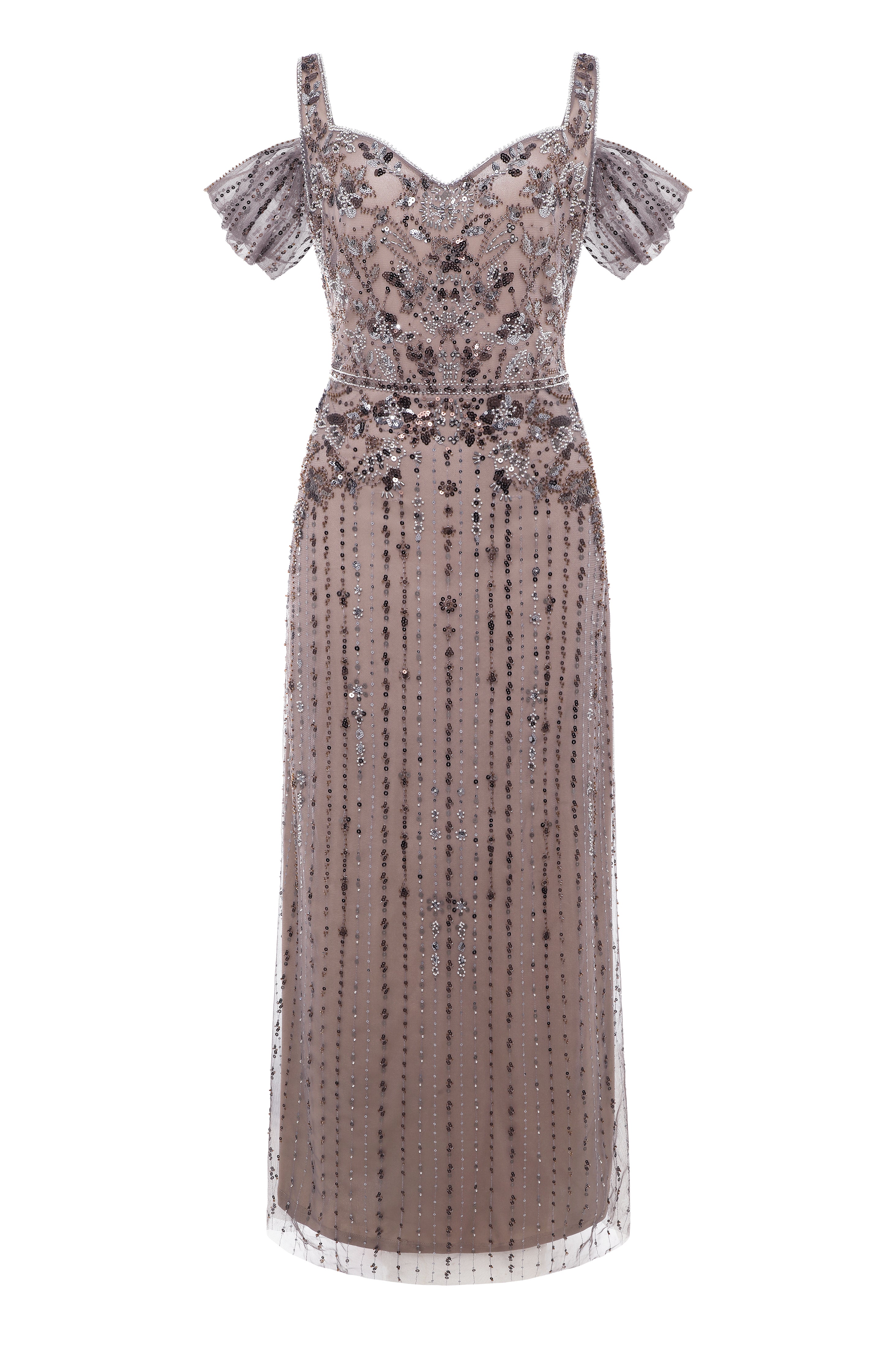 Warm Brown Art Deco Beaded Fringed Evening Gown