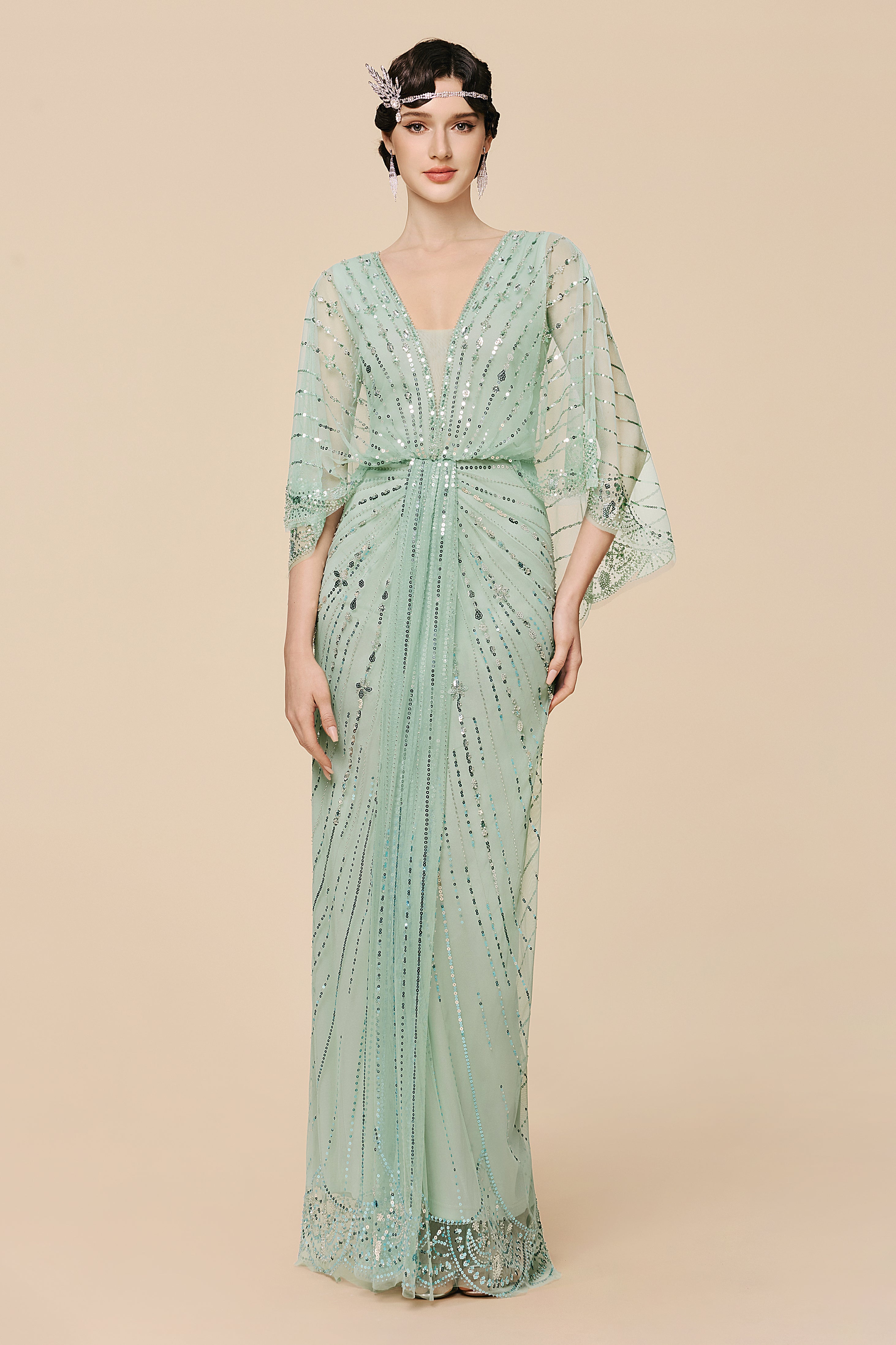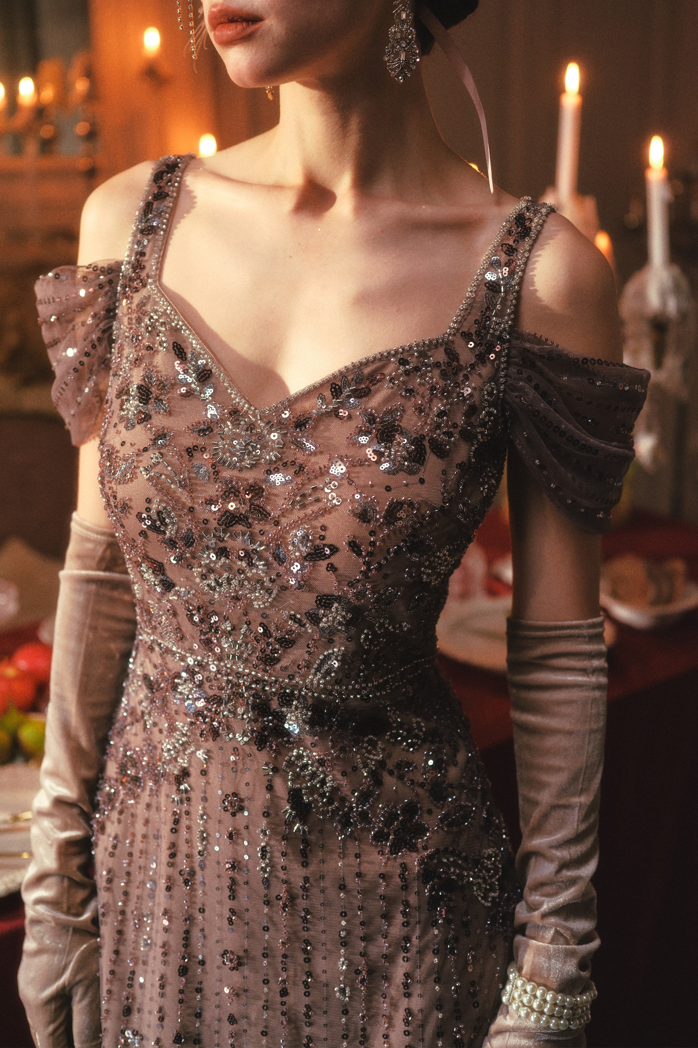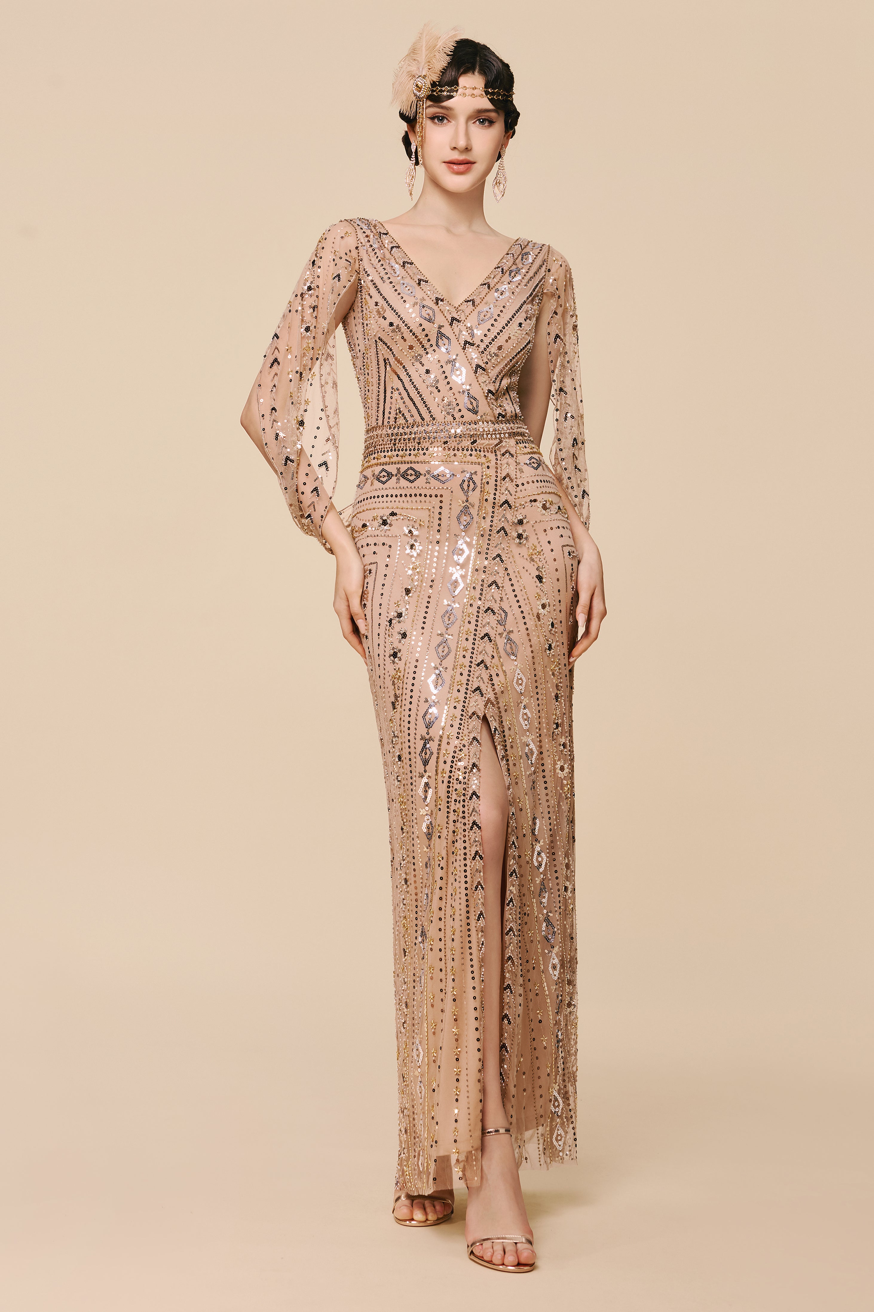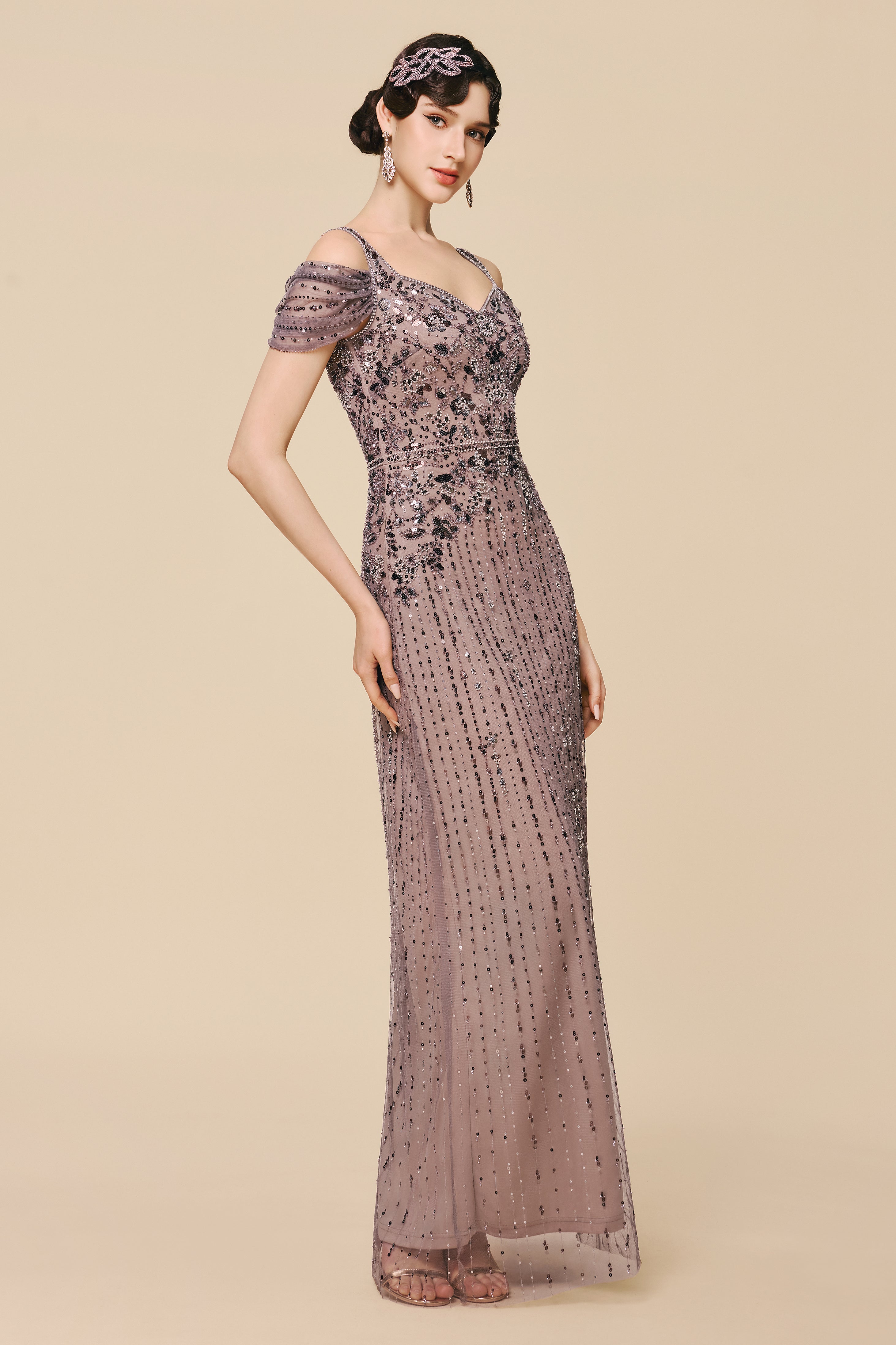 Glittering Sheer-Sleeve Sequined Evening Gown