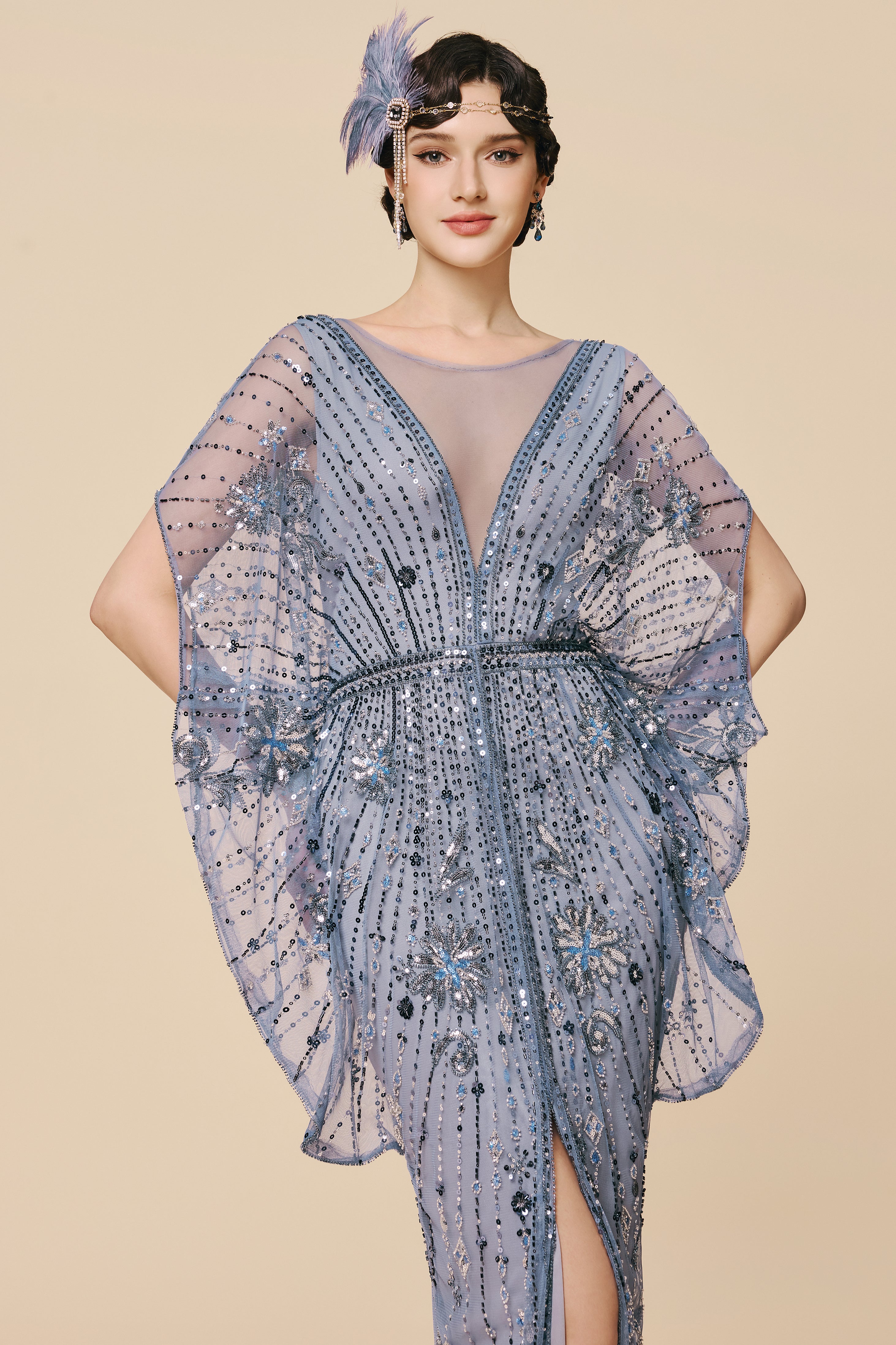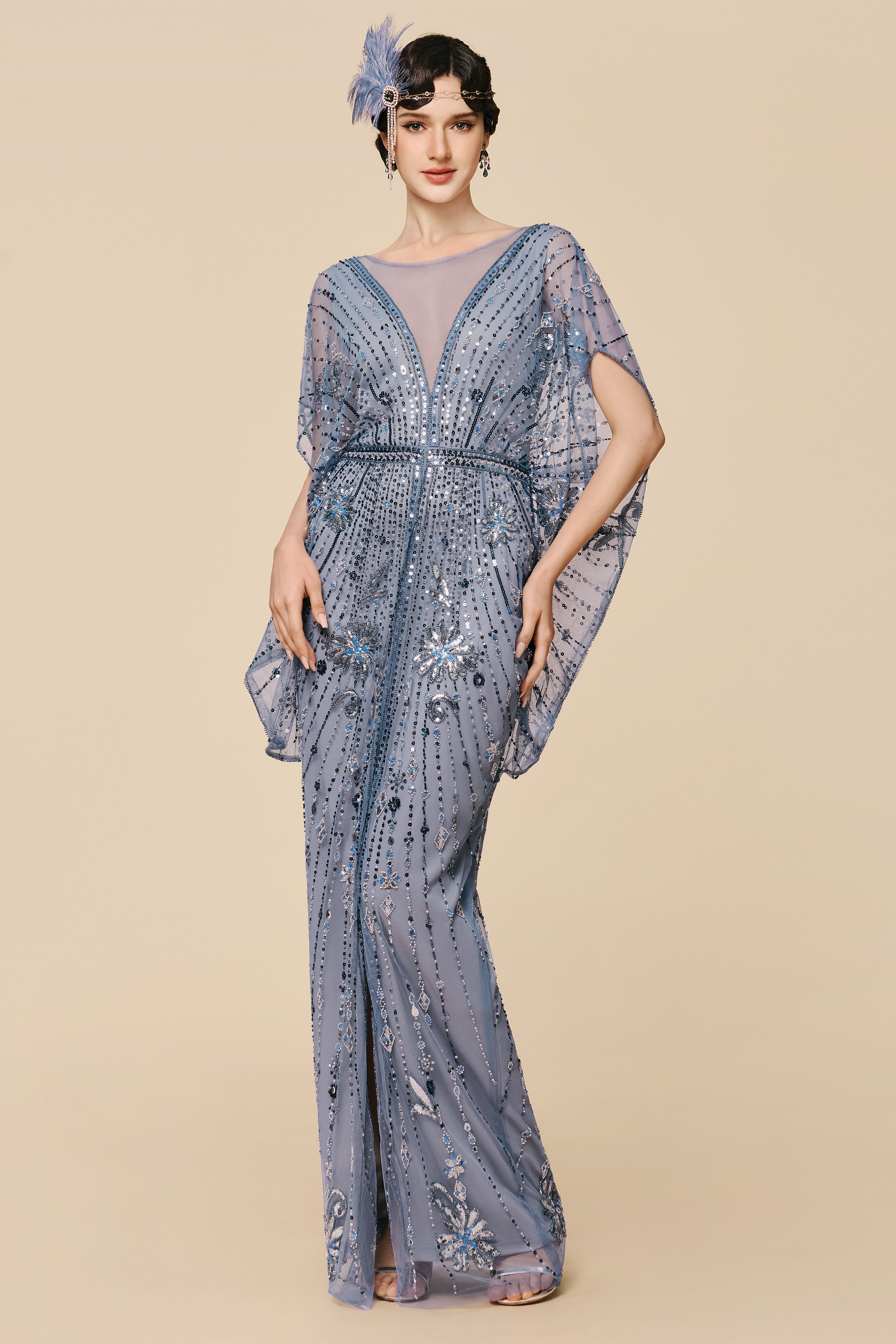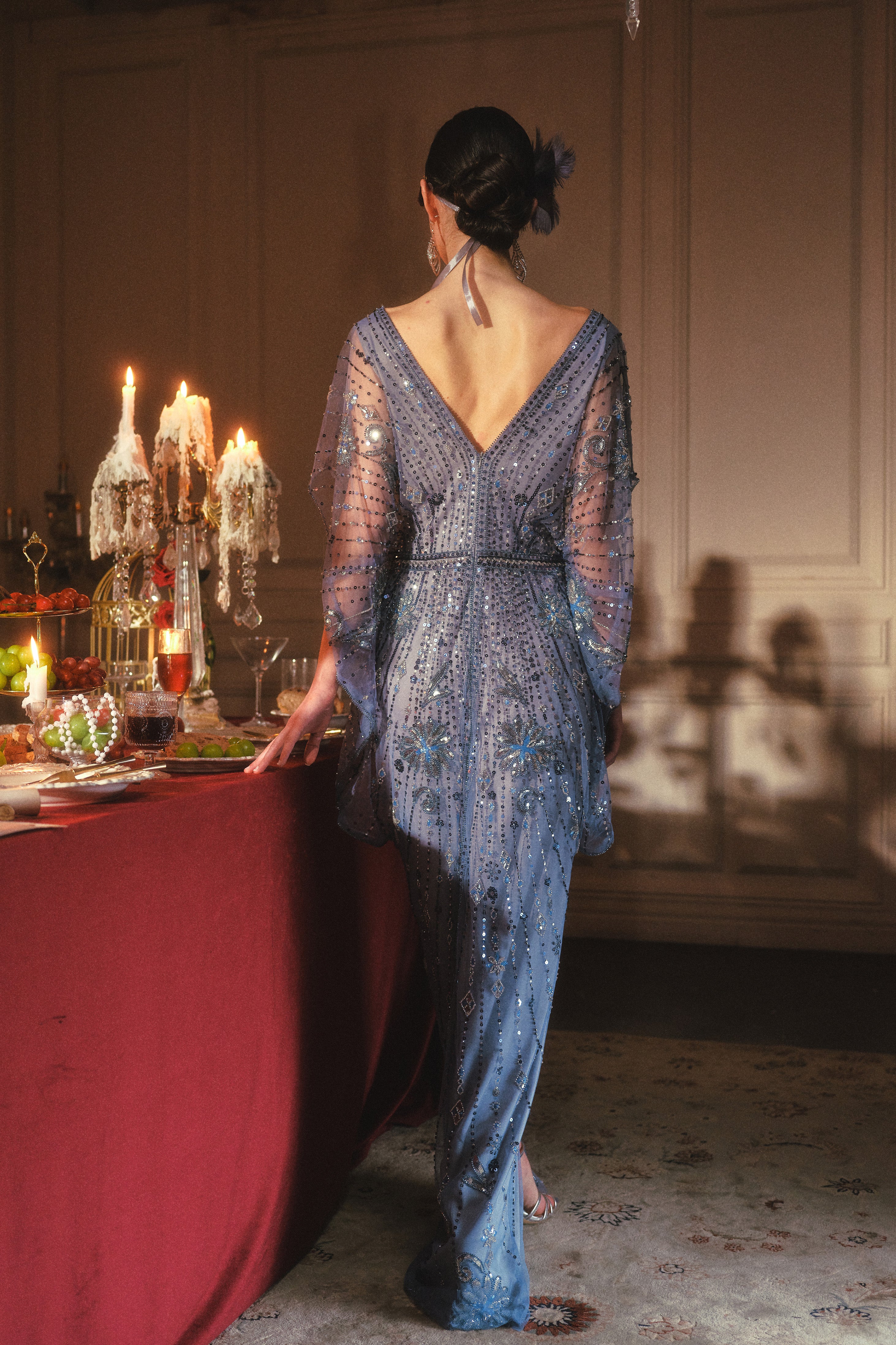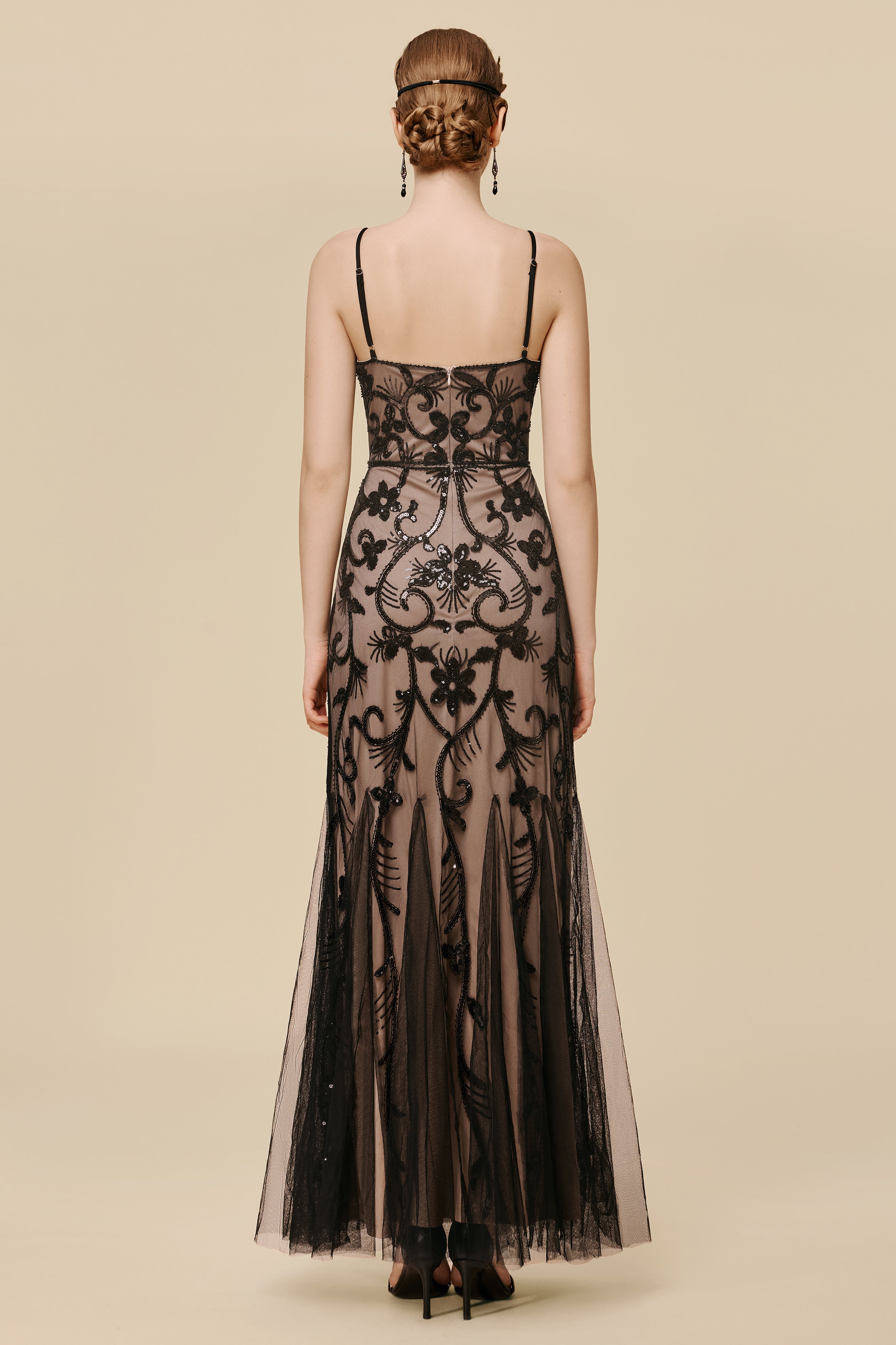Glittering Sheer-Sleeve Sequined Evening Gown