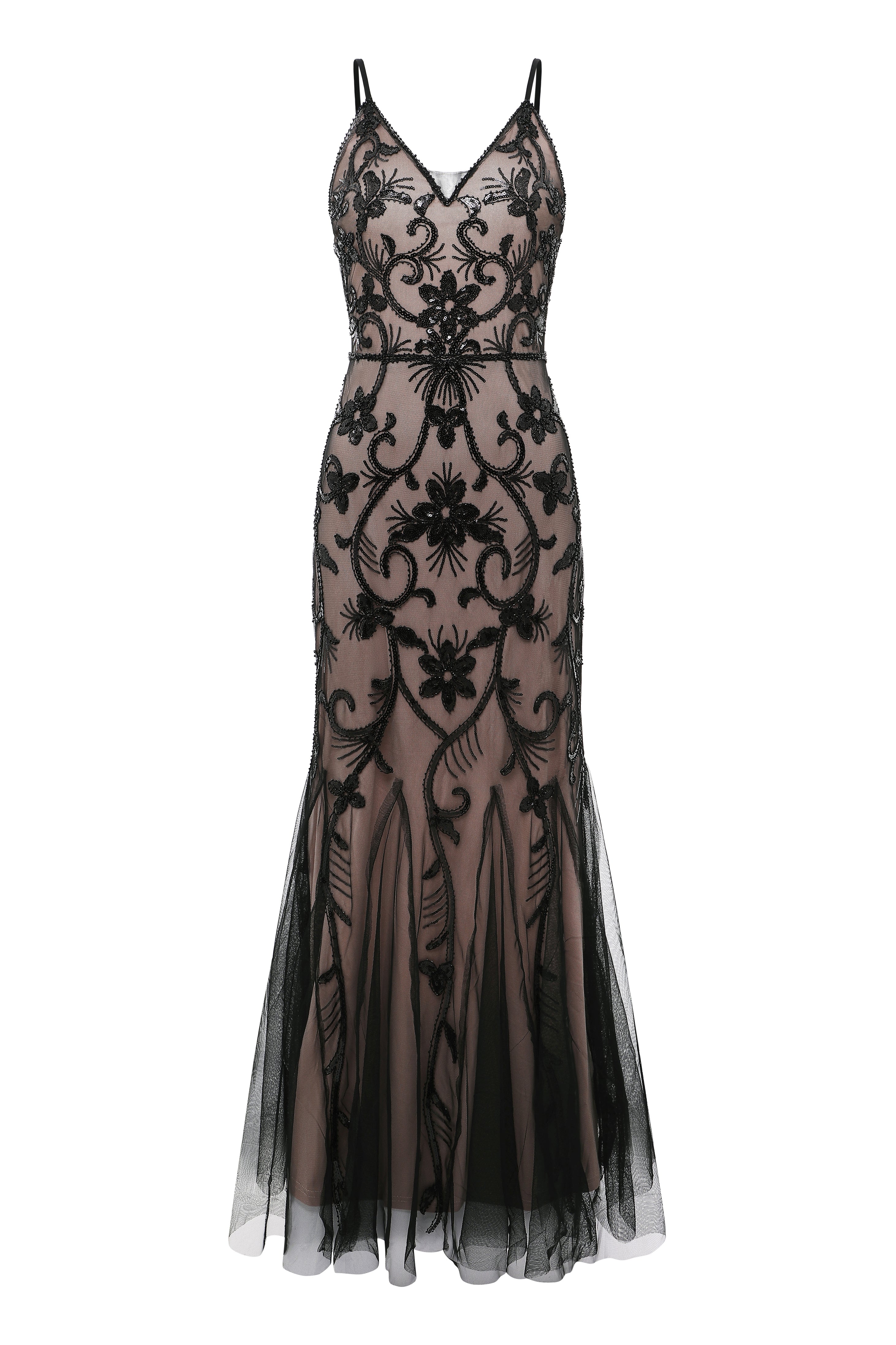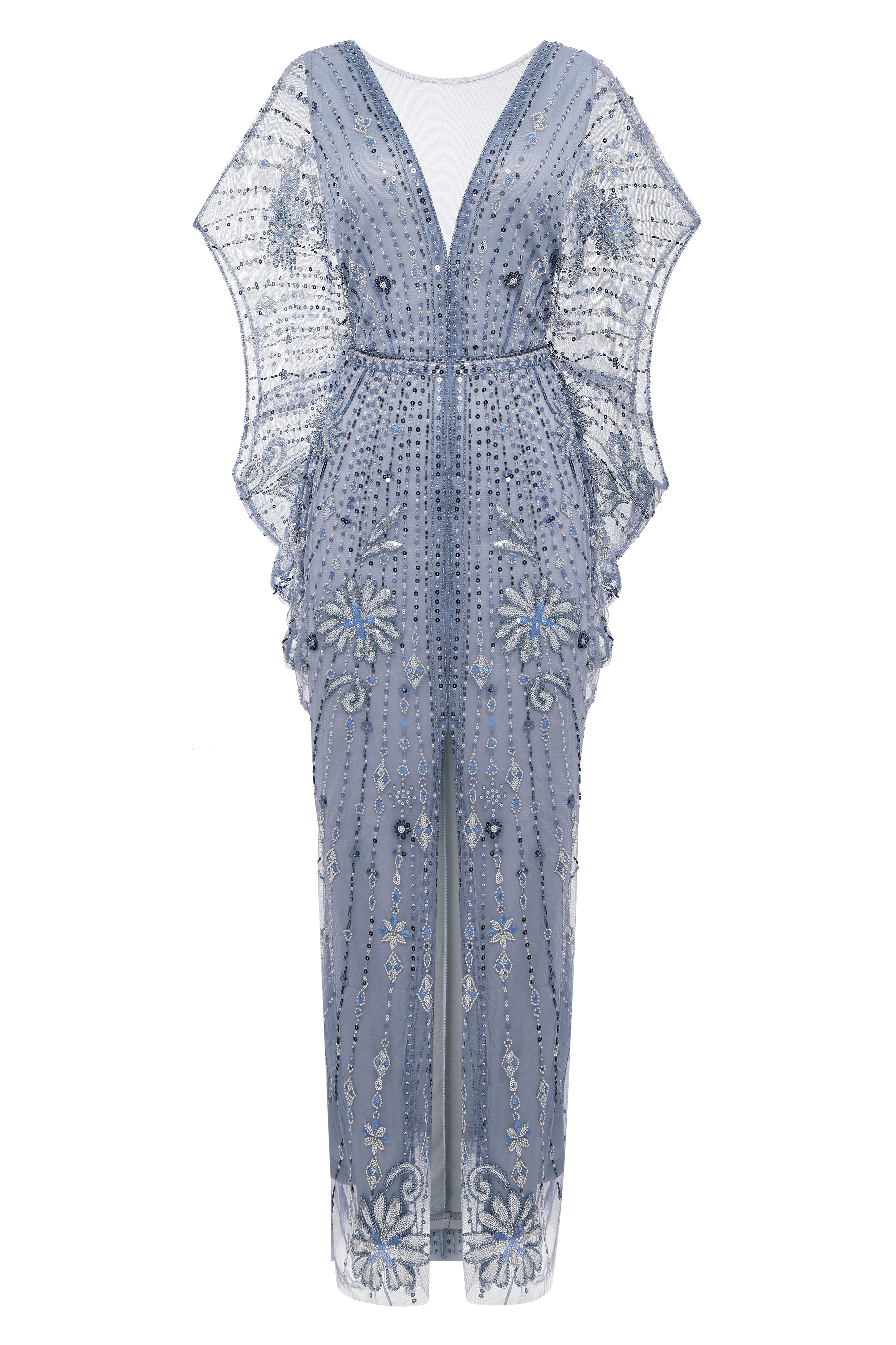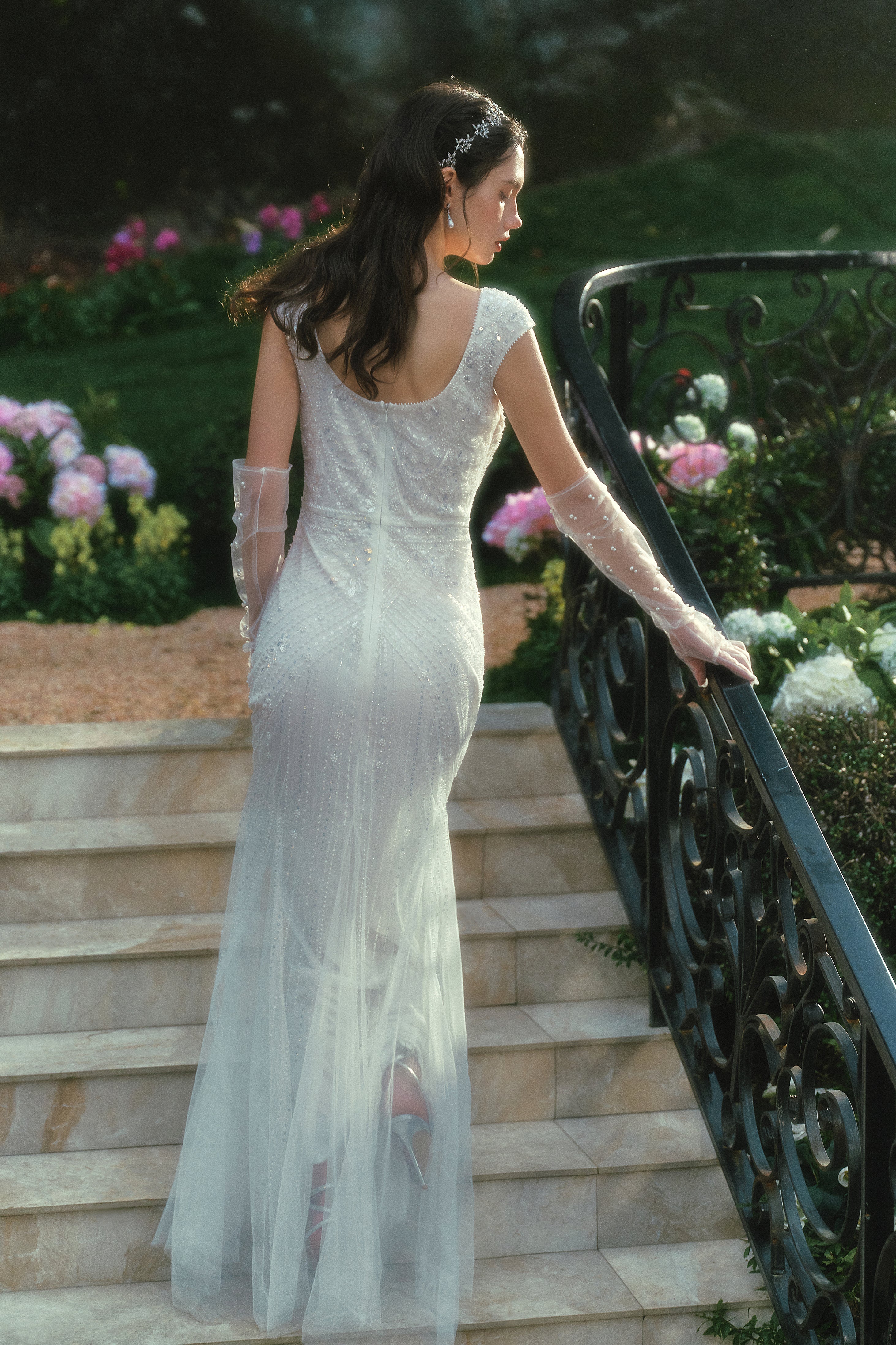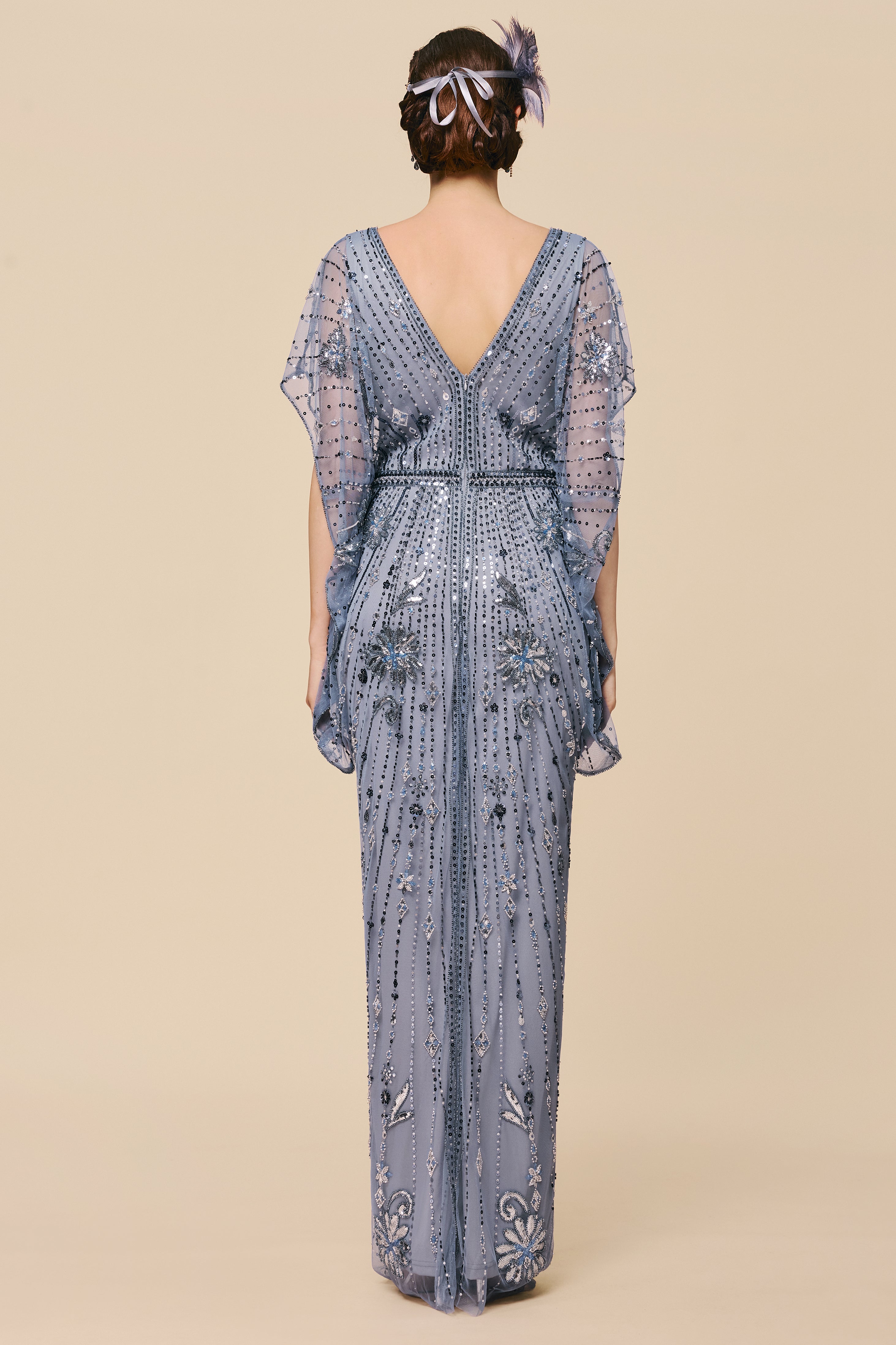 Glittering Sheer-Sleeve Sequined Evening Gown