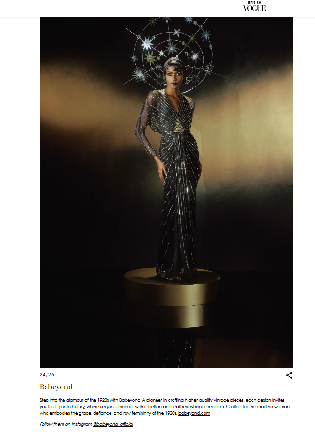 True elegance doesn’t shout - it shimmers. That quiet allure, born from another era, is what drew British Vogue to BABEYOND. Inspired by the unapologetic glamour of the 1920s, we revive an age when sequins, fringe, and pearls spoke louder than words - when confidence was an art form, and beauty was meant to last. In a world chasing the next trend, BABEYOND remains timeless, crafting modern grace through vintage soul. Vogue didn’t just find a brand; they found a way of seeing elegance reborn - the BABEYOND way.