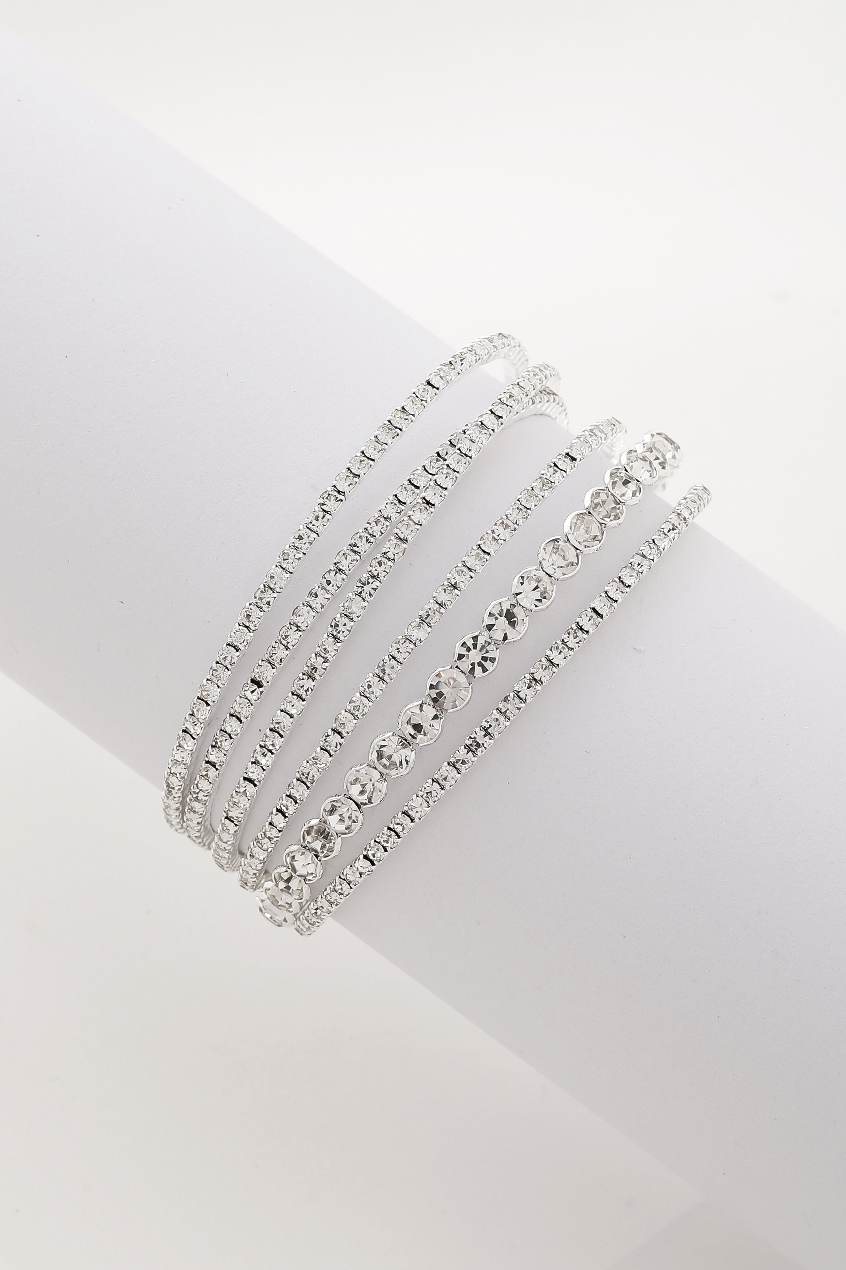 Crafted with six rows of shimmering rhinestones in alternating sizes, this bracelet blends structured sparkle with graceful fluidity. The open-back cuff design allows for easy wear and a flexible fit, hugging the wrist with bold yet refined glamour.