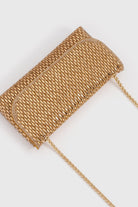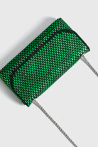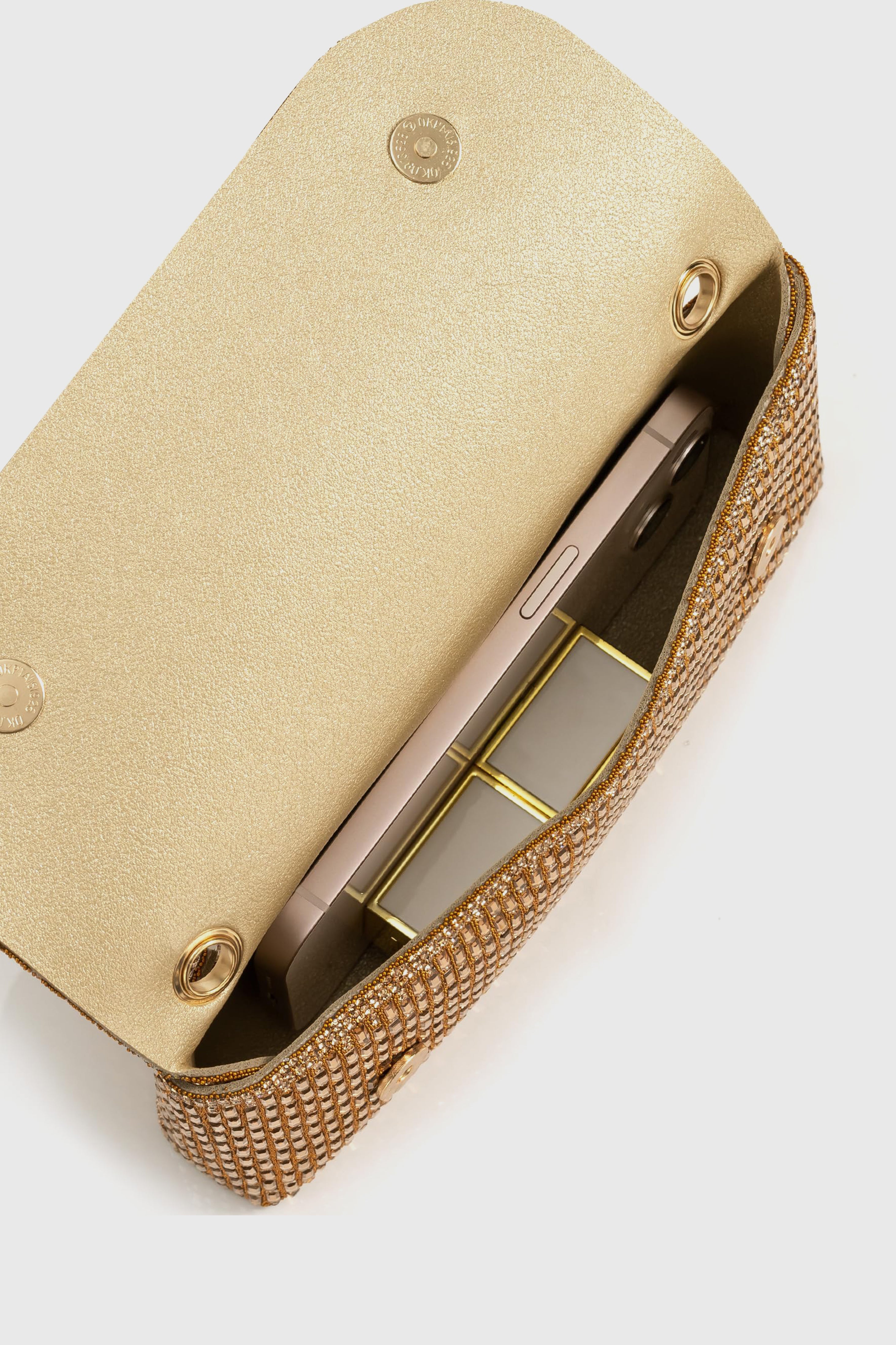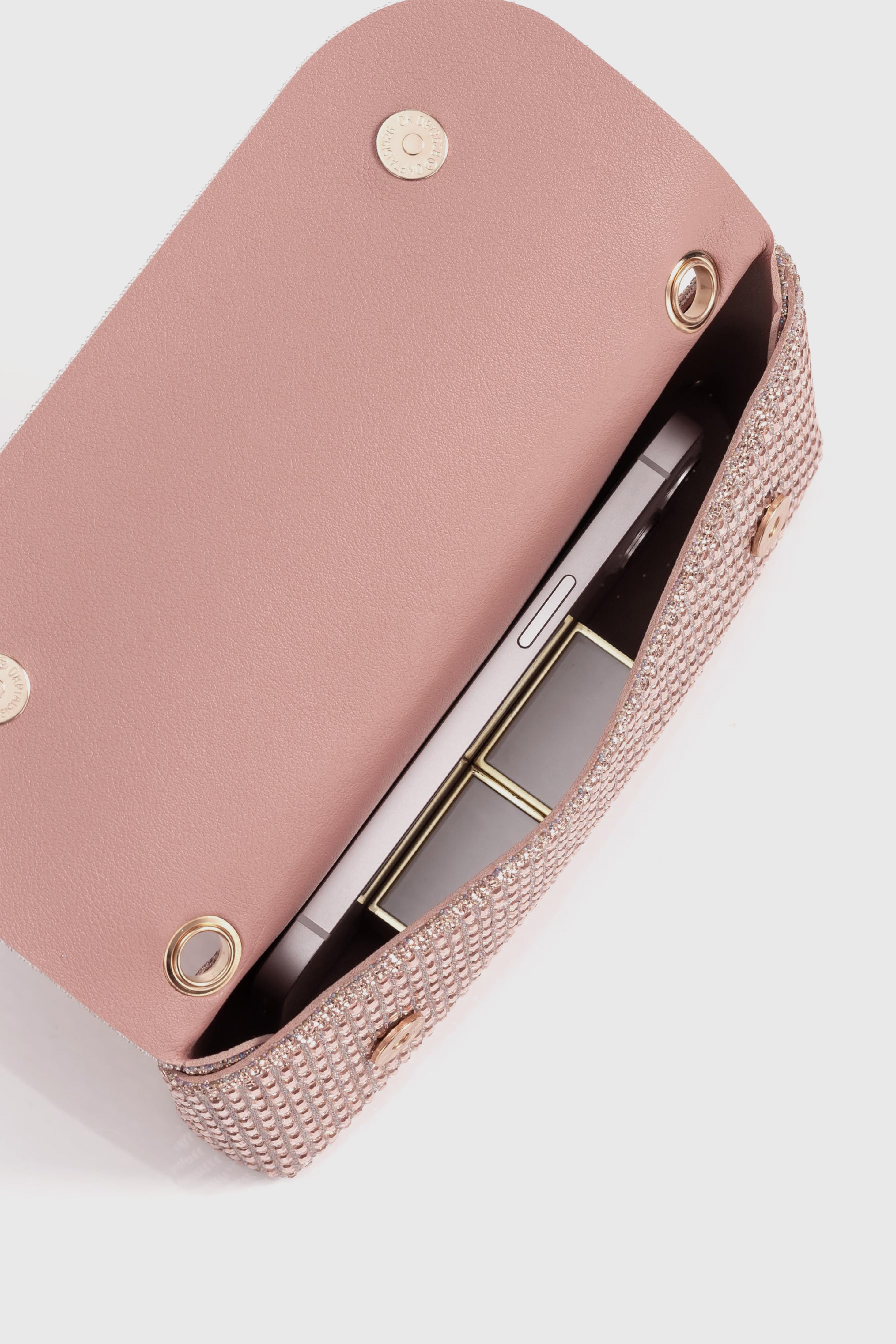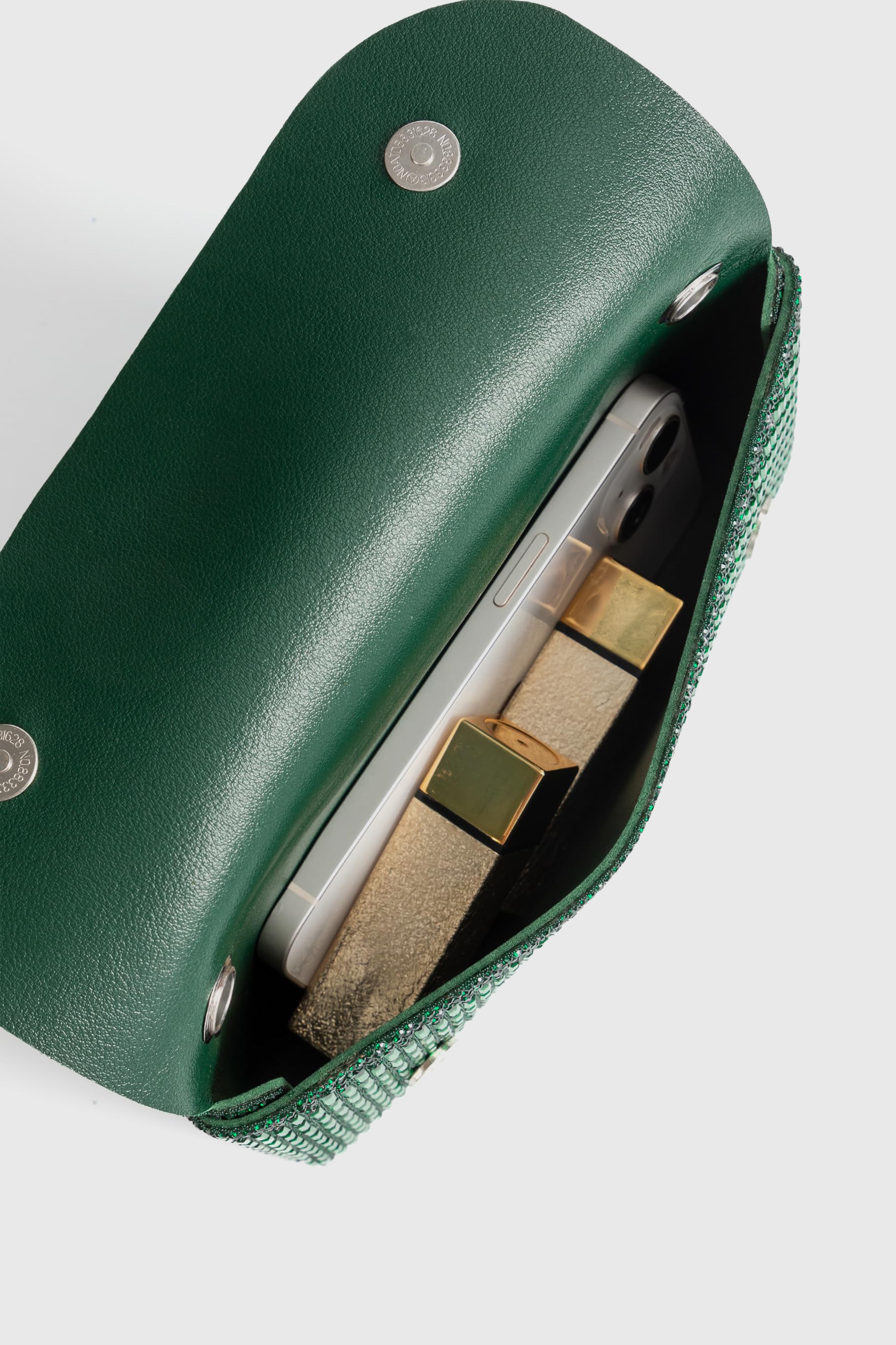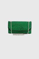 Elegant evening clutch crafted from faux leather and sparkling rhinestones. Features a refined fold-over silhouette with subtle shine, designed to be carried by hand or worn with the detachable chain.