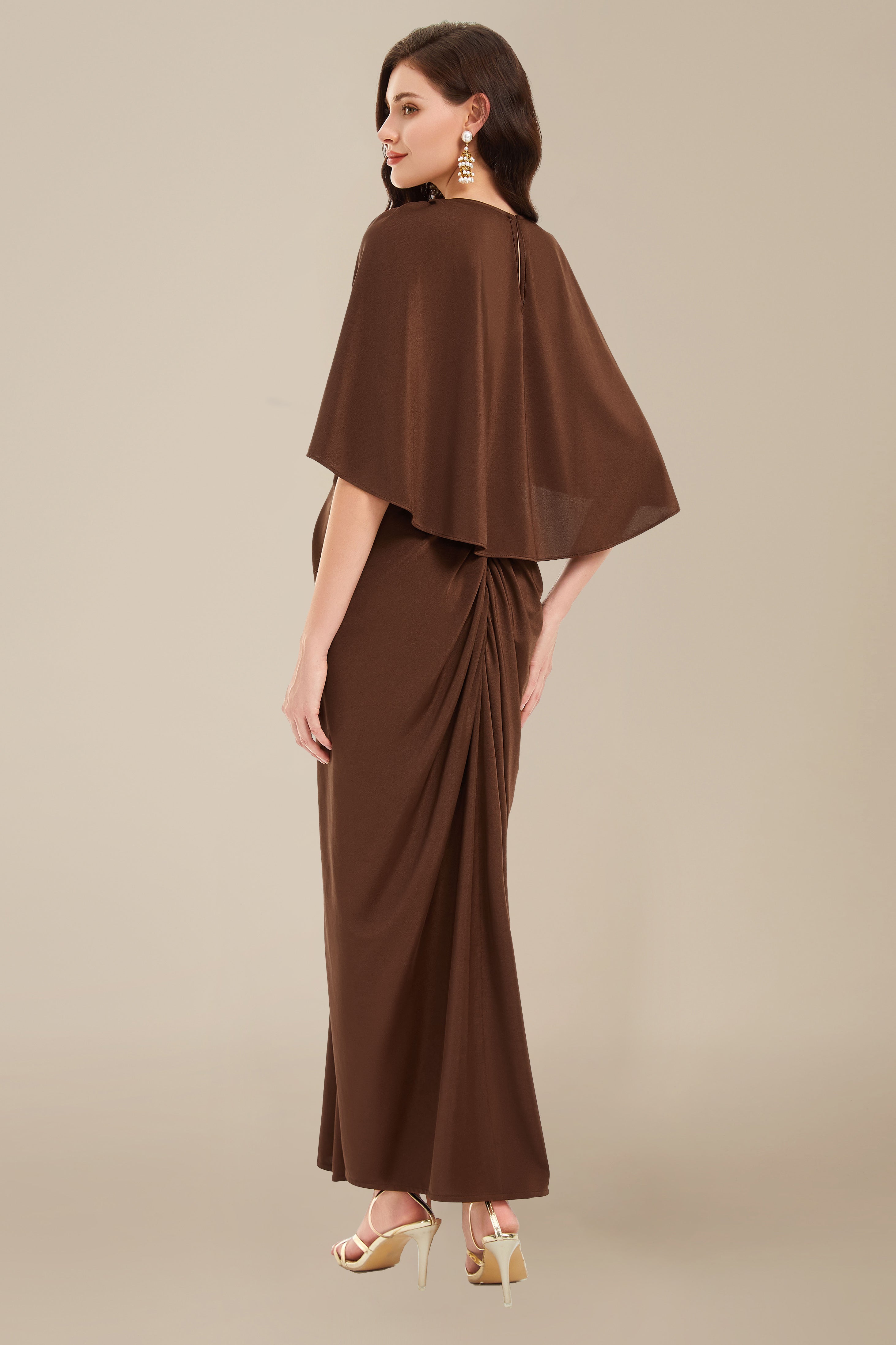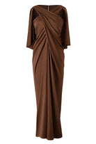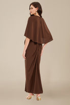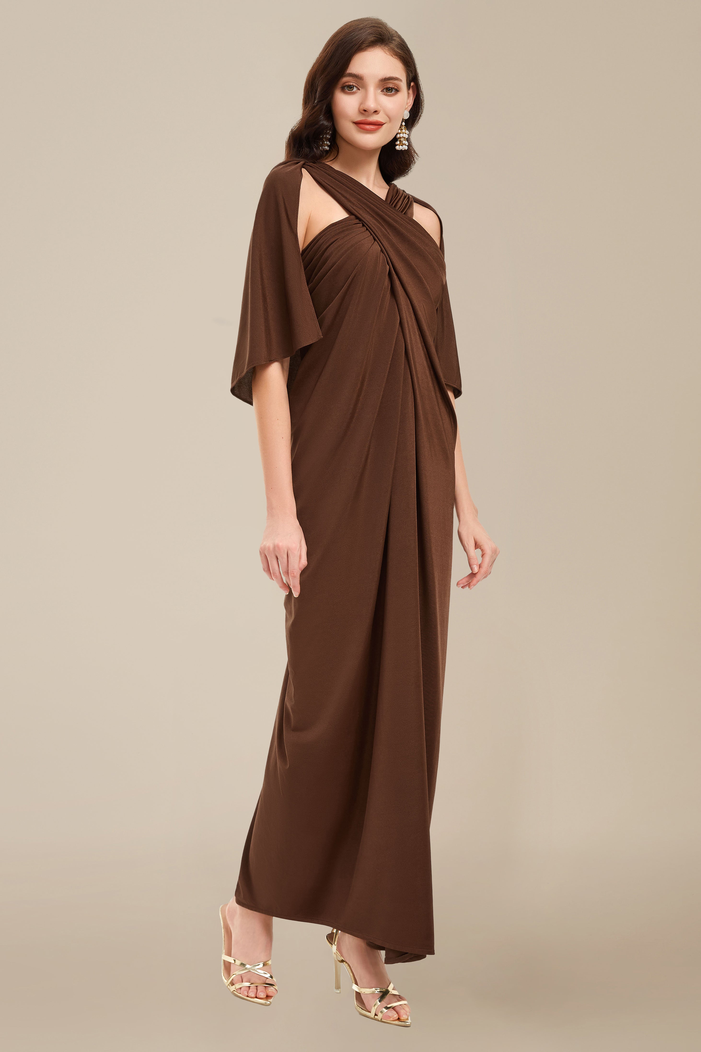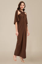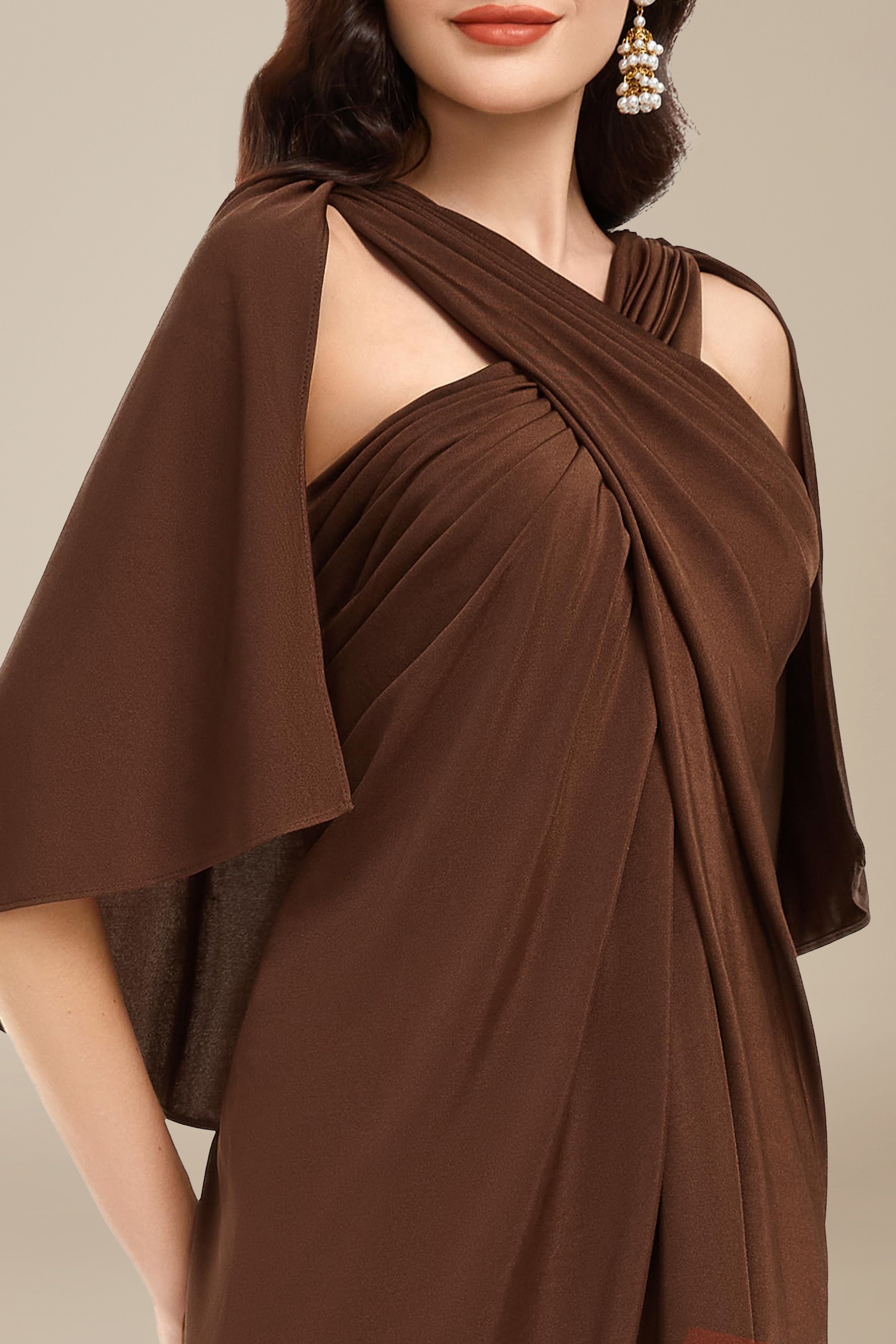 Gracefully blending drama and elegance, this brown evening gown features a stunning crisscross draped neckline that cascades into a fluid, floor-length silhouette. The subtle cape-style flutter sleeves and soft pleating enhance its goddess-like charm, while the shoulder cutouts lend a hint of modern allure.