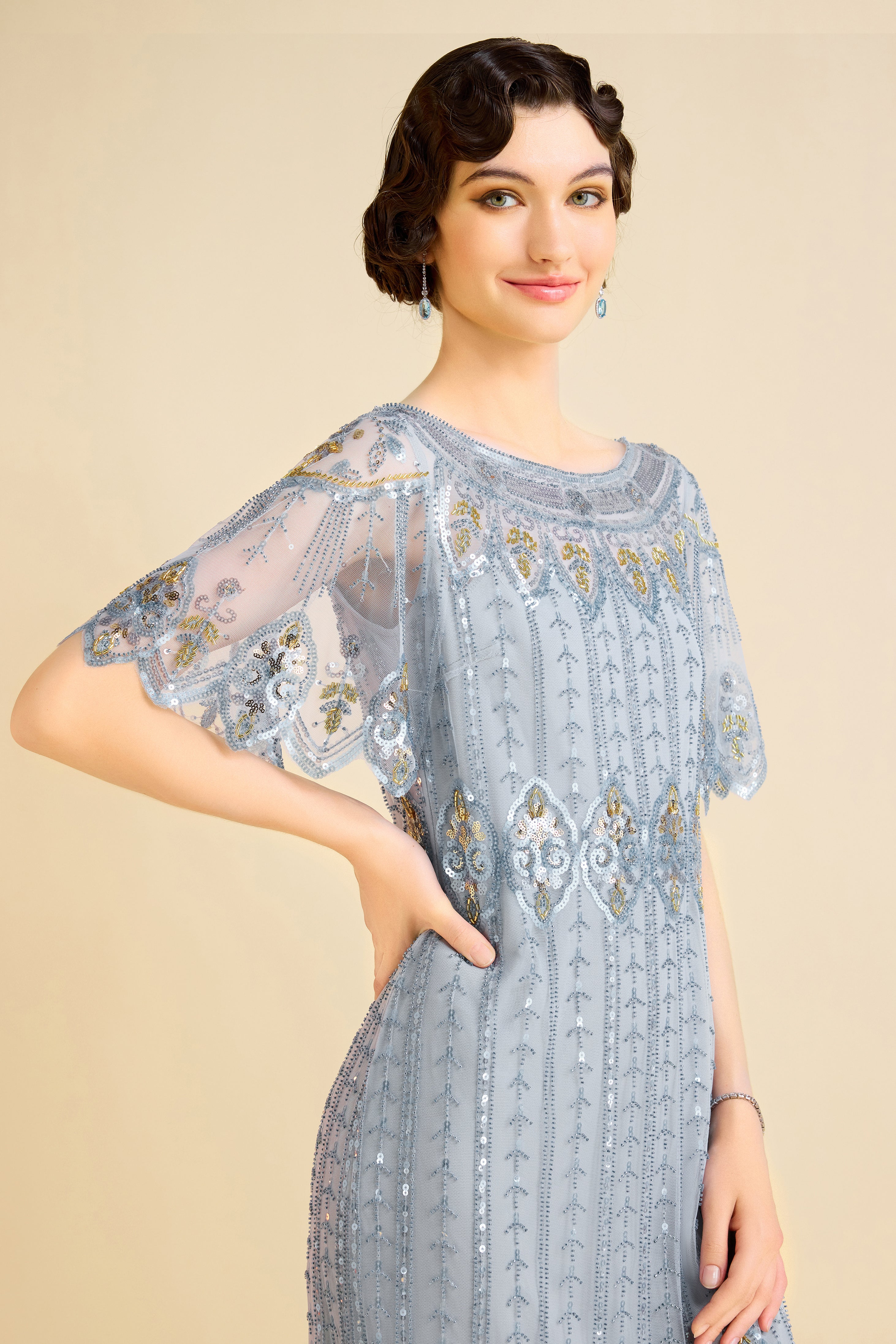 The vibrant blue hue is perfectly complemented by a striking color-block pattern, creating a visually arresting contrast that draws the eye. The intricately detailed cut-out neckline adds an element of sophistication and allure, capturing the essence of vintage elegance. Transparent sleeves provide a modern, airy touch, enhancing the dress's light and graceful feel.