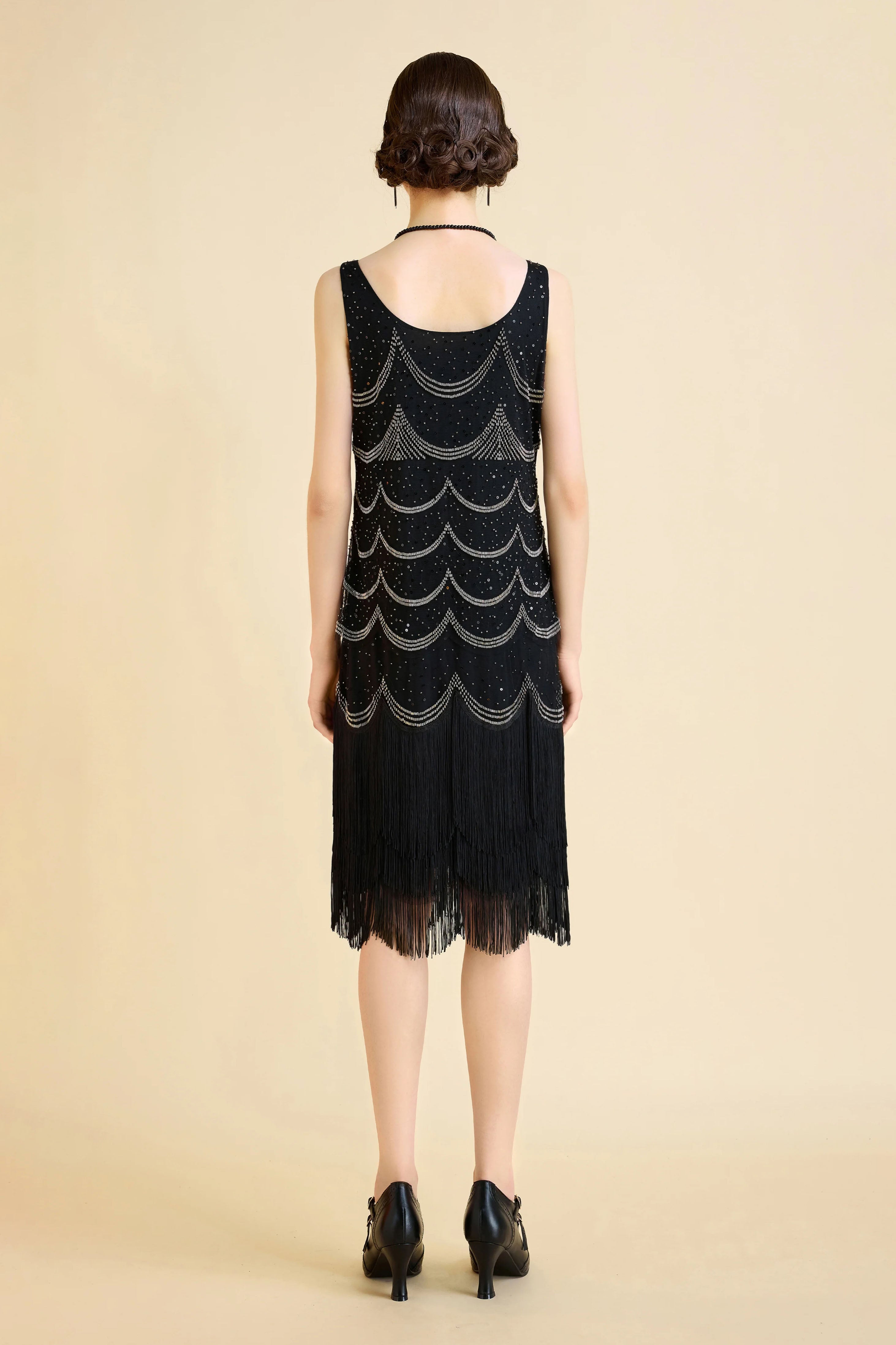 Picture yourself at a glamorous Gatsby-inspired soiree, the air filled with excitement and jazz melodies. The dress's U-shaped neckline exudes sophistication, while its H-line silhouette ensures comfort and style as you dance the night away. The geometric patterns infuse a contemporary flair into this timeless design, ensuring it stands out elegantly for those with a passion for vintage fashion.