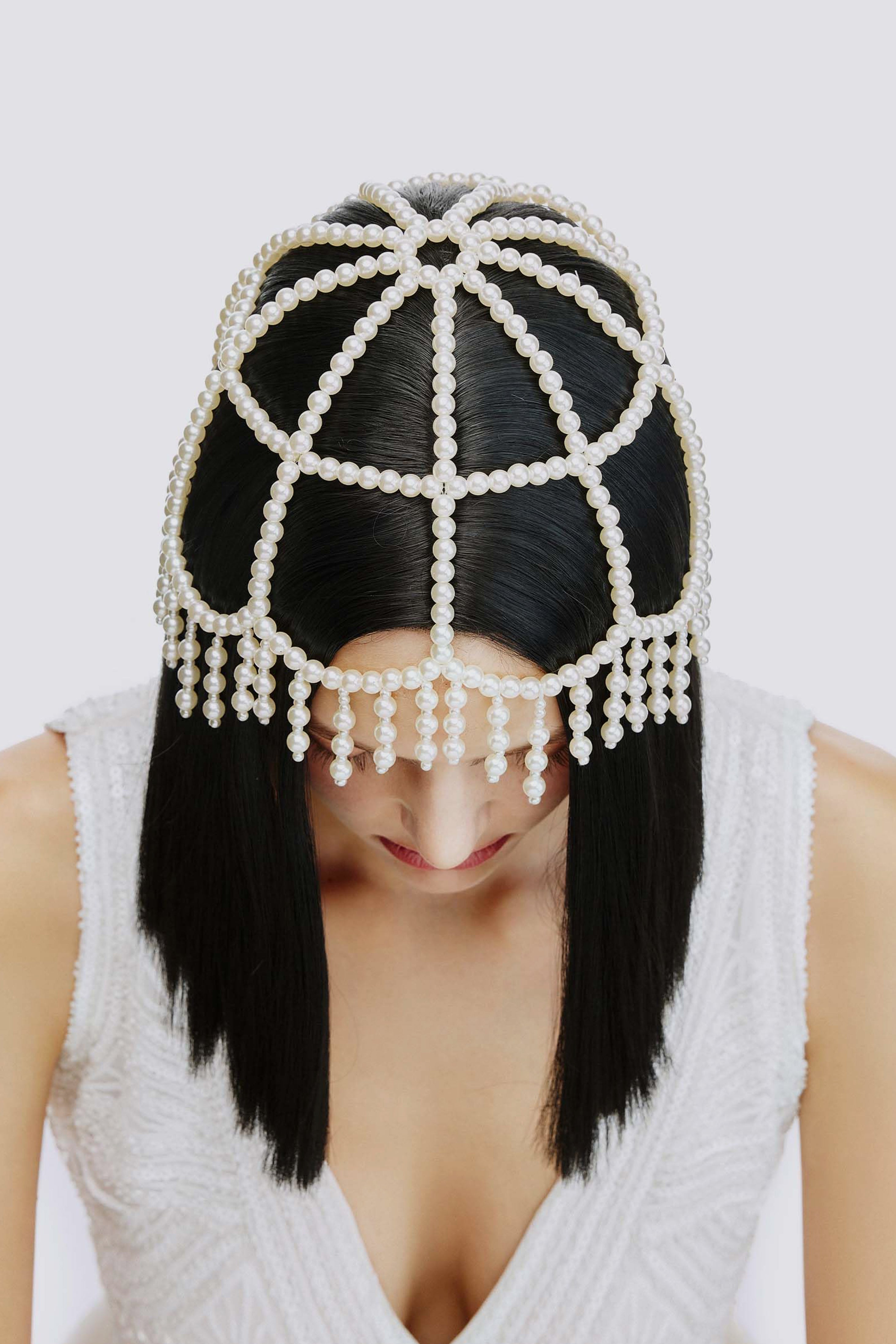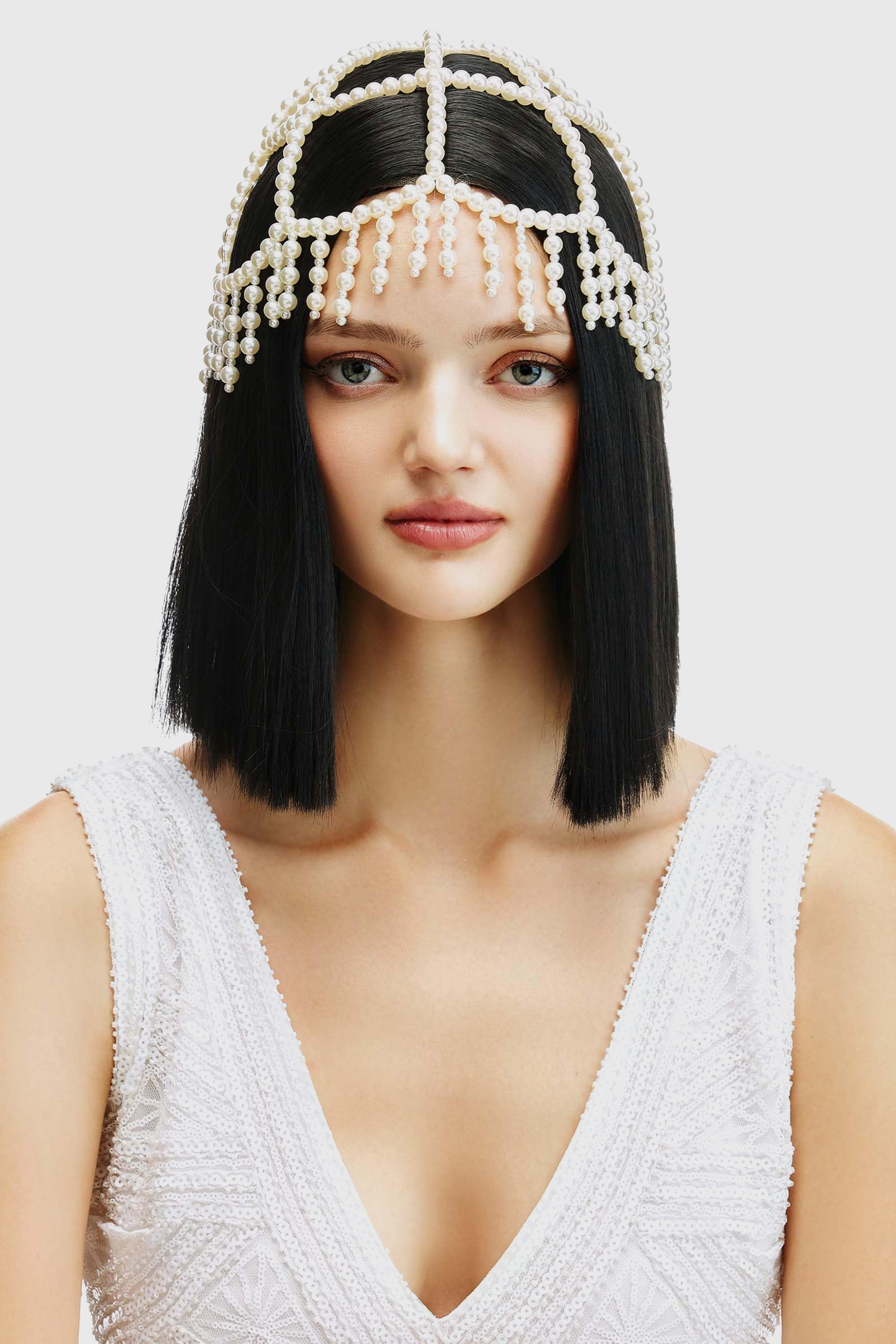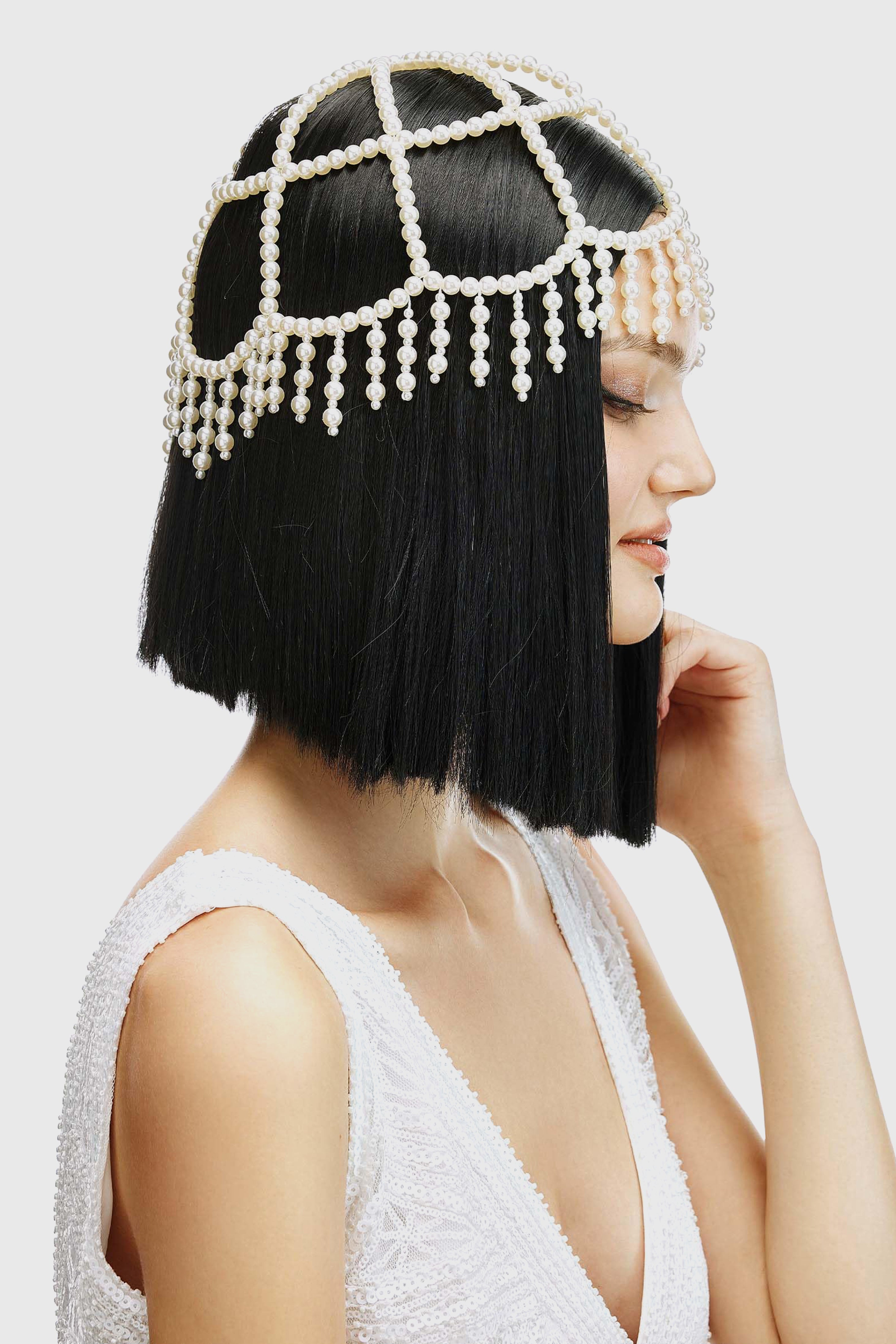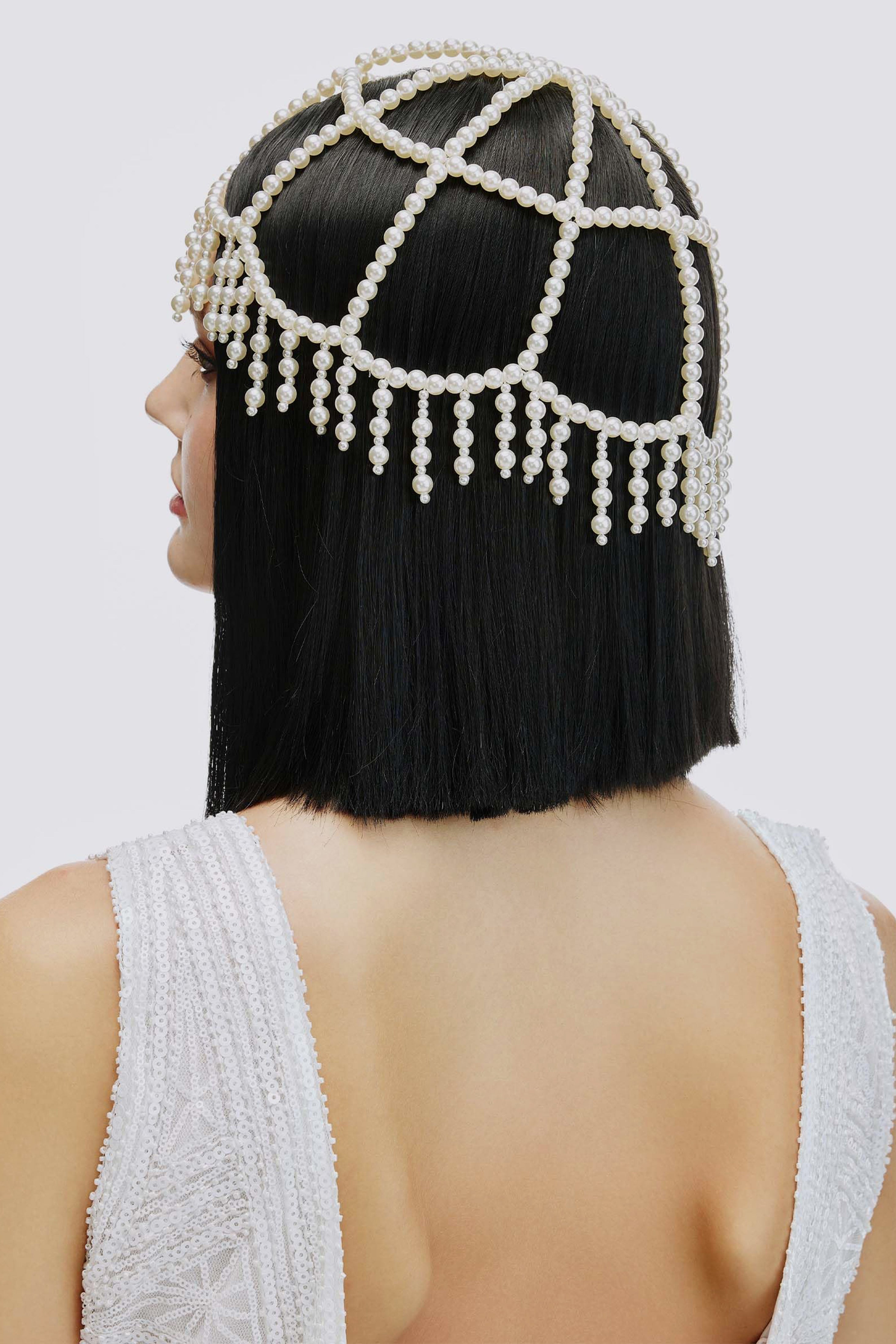 This exquisite 1920s-inspired flapper cap combines delicate imitation pearls with elegantly draped tassels. The alternating large and small pearls create a vintage shimmer, adding timeless glamour to any hairstyle.
