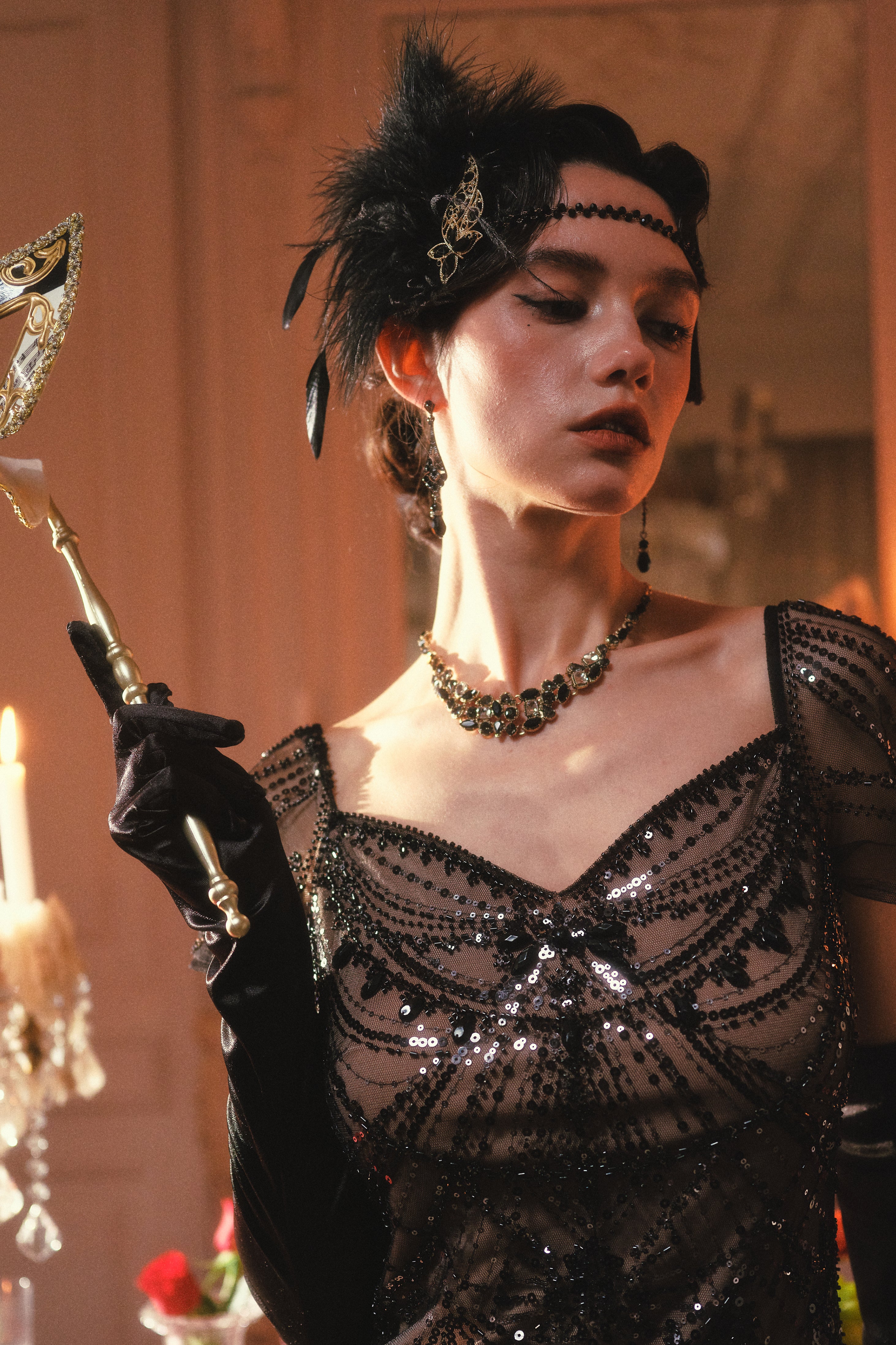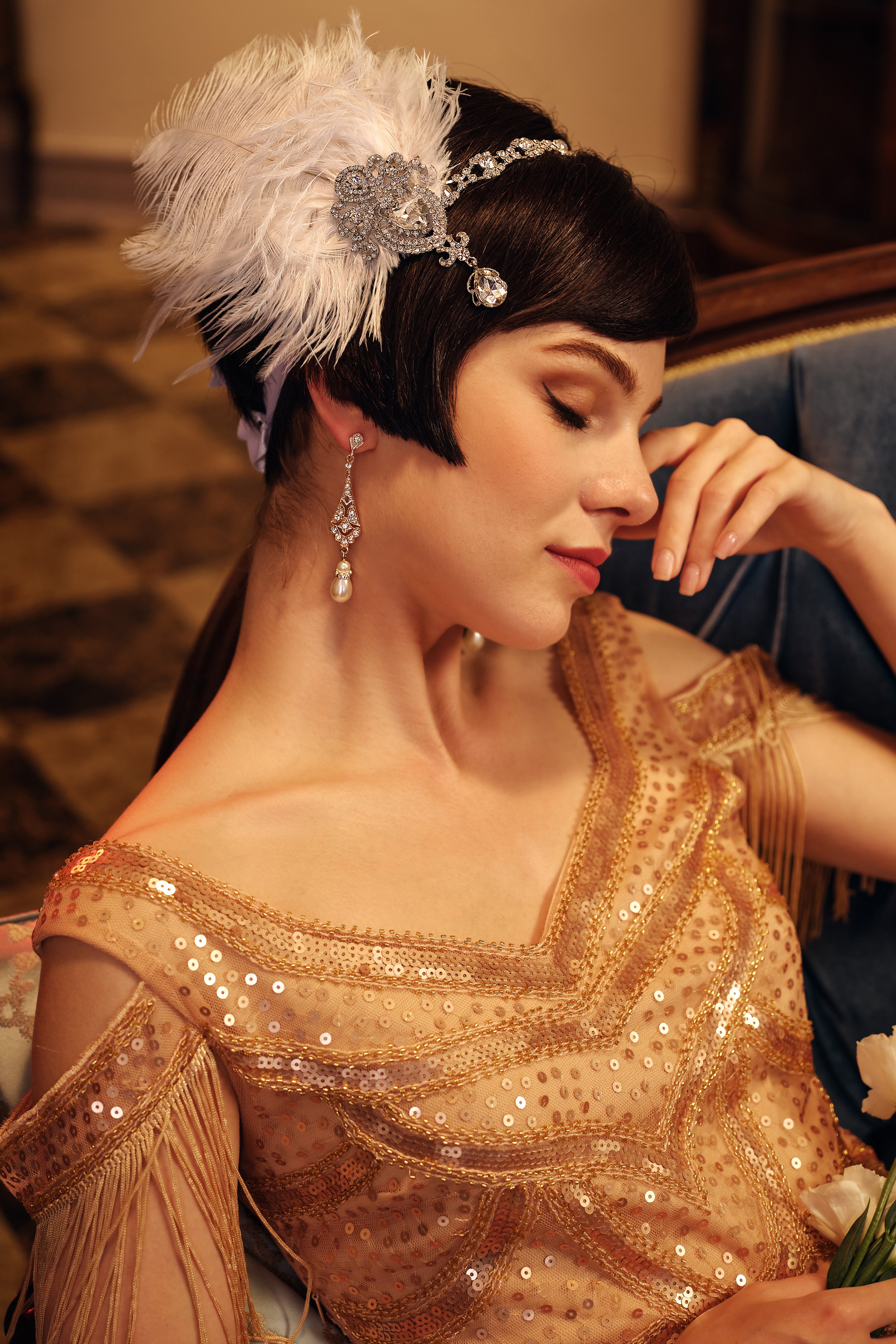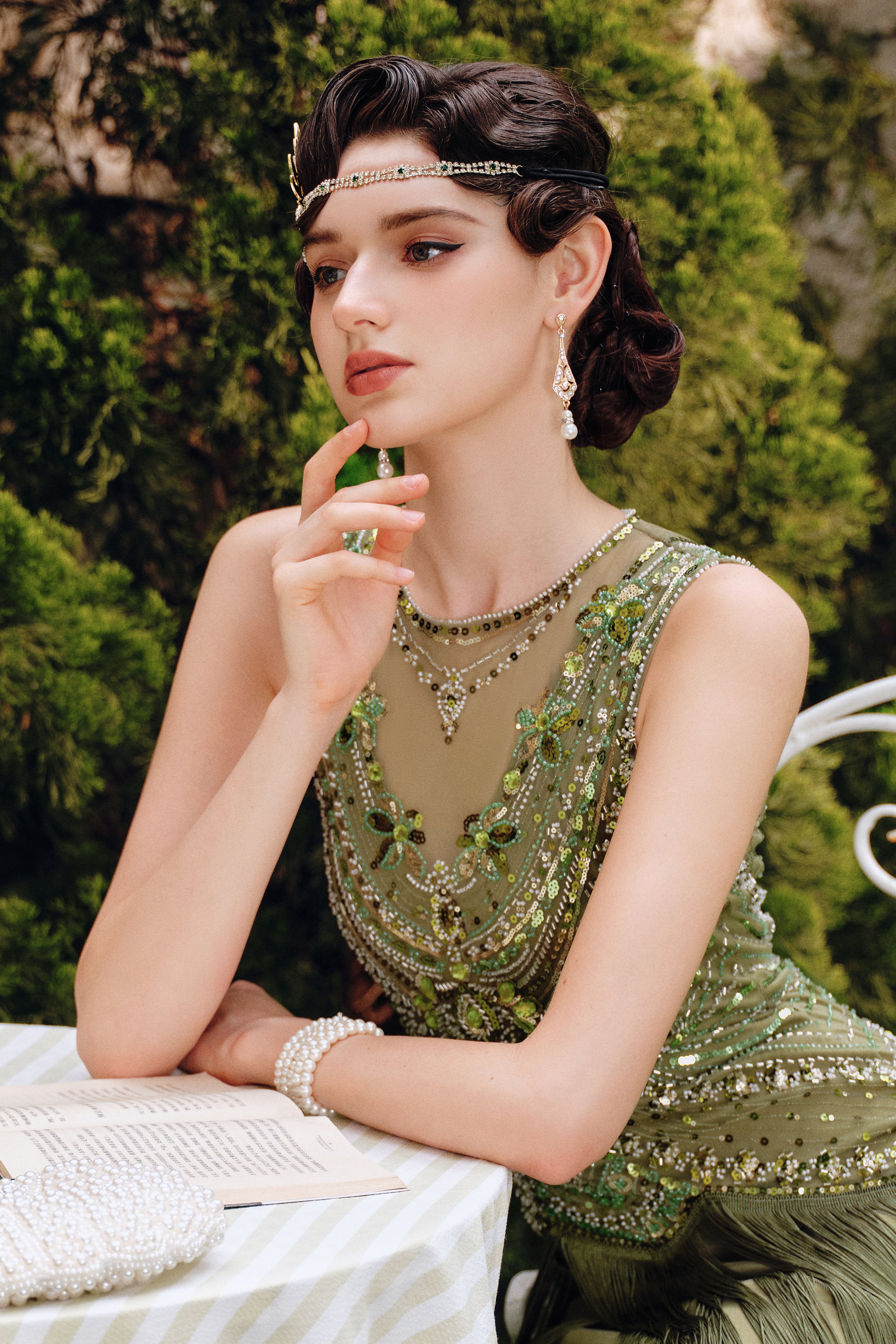 This sumptuous piece of jewelry features a retro-elegant yet slightly modern style that complements the lavish garments, reminiscent of the roaring 1920s.