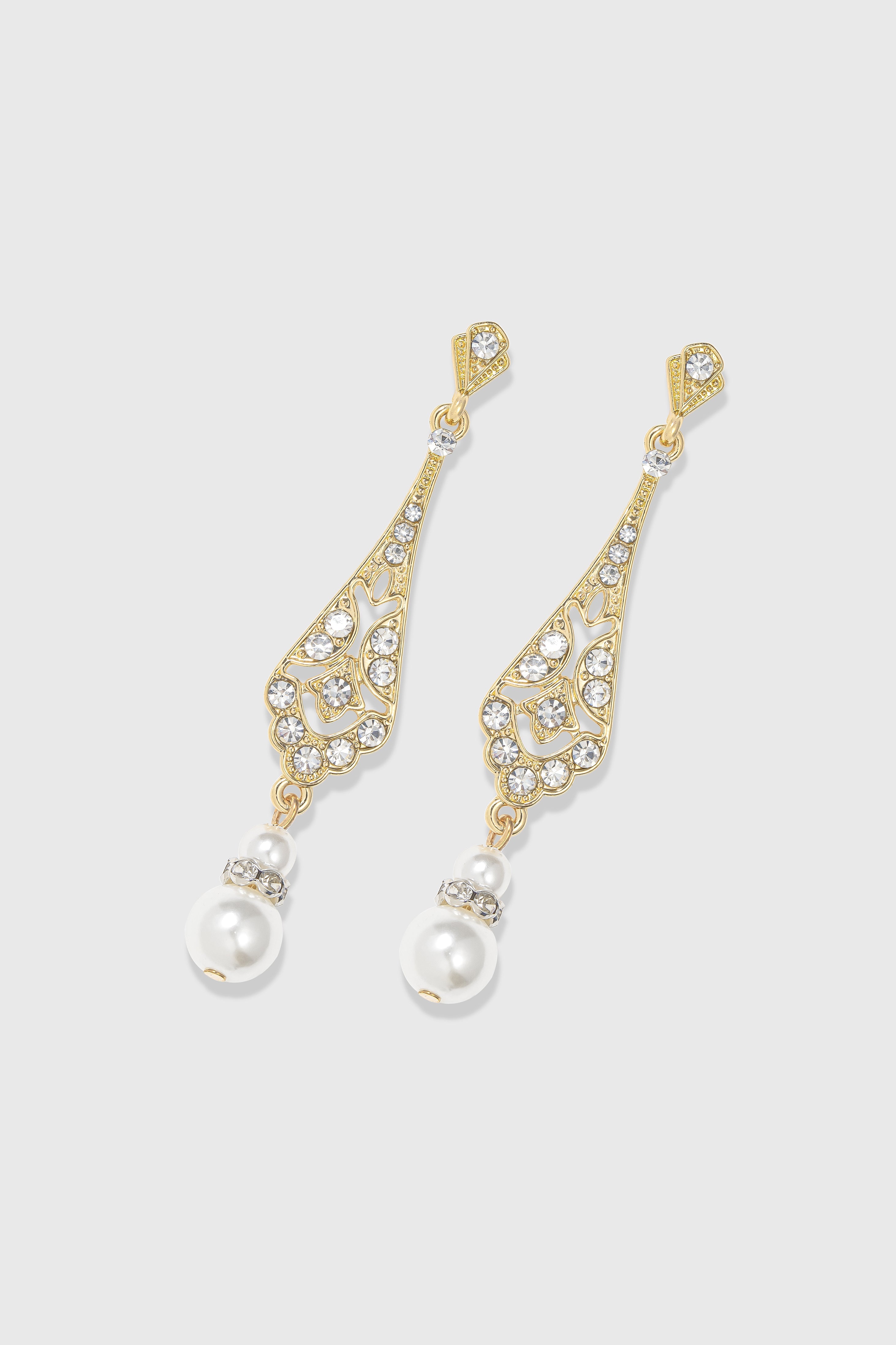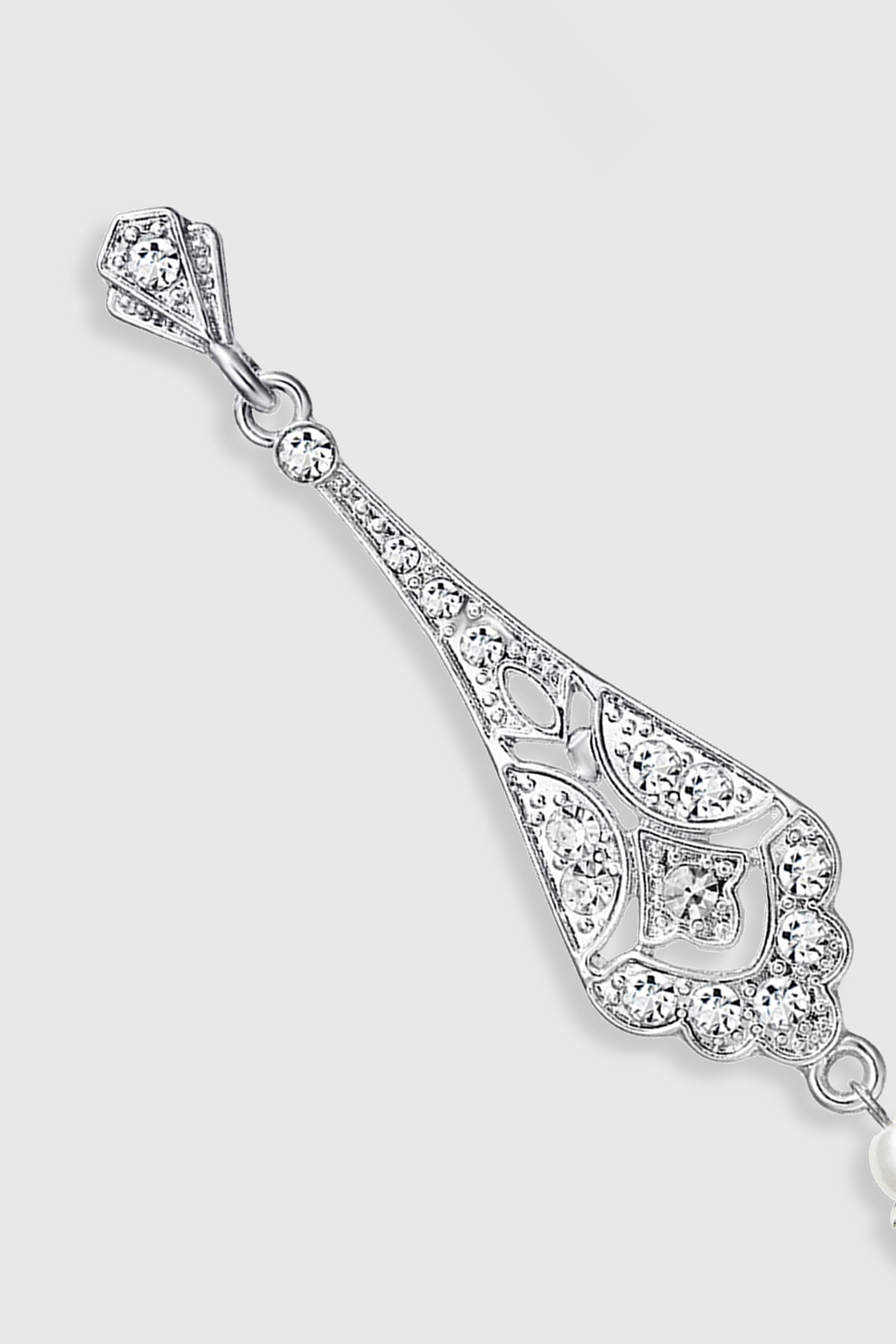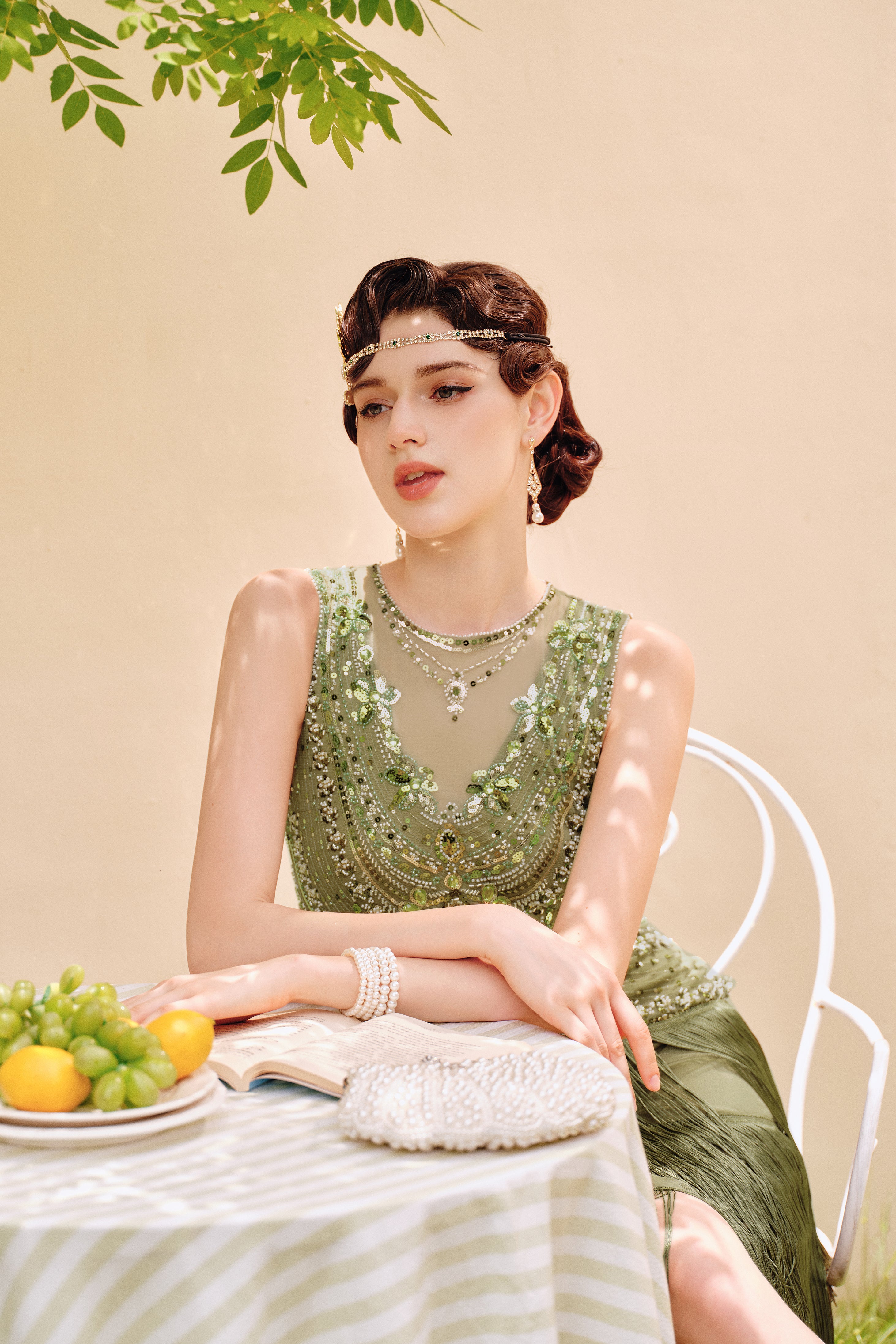 This sumptuous piece of jewelry features a retro-elegant yet slightly modern style that complements the lavish garments, reminiscent of the roaring 1920s.