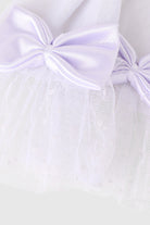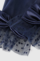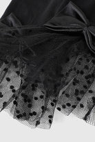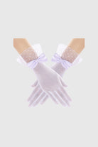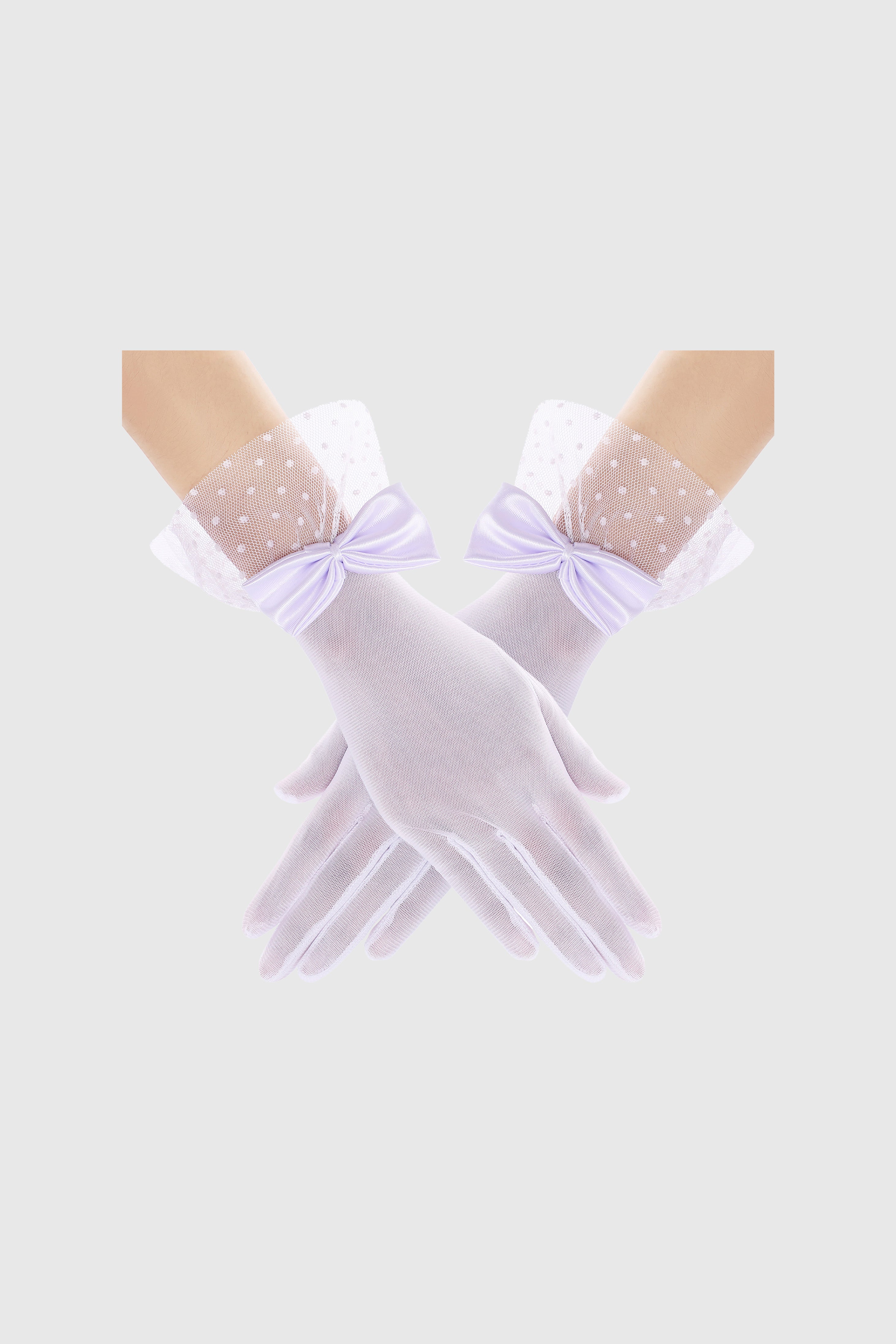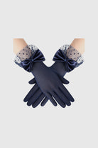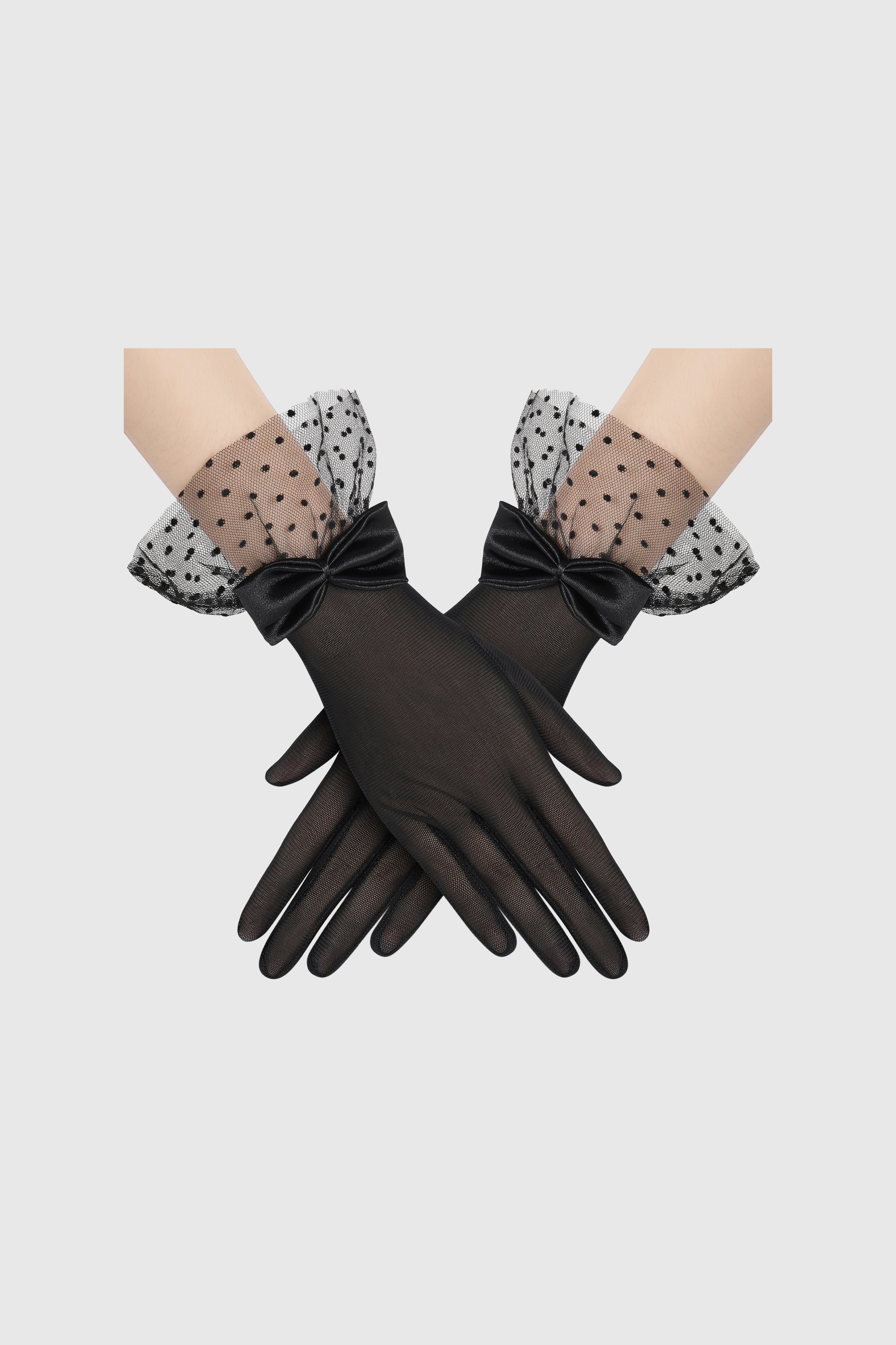 Designed with a playful contrast of sheer polka dot mesh and silky satin bows, these gloves blend vintage romance with refined elegance. The slim-fit silhouette and ruffled cuffs add a dramatic yet delicate touch to elevate any ensemble.