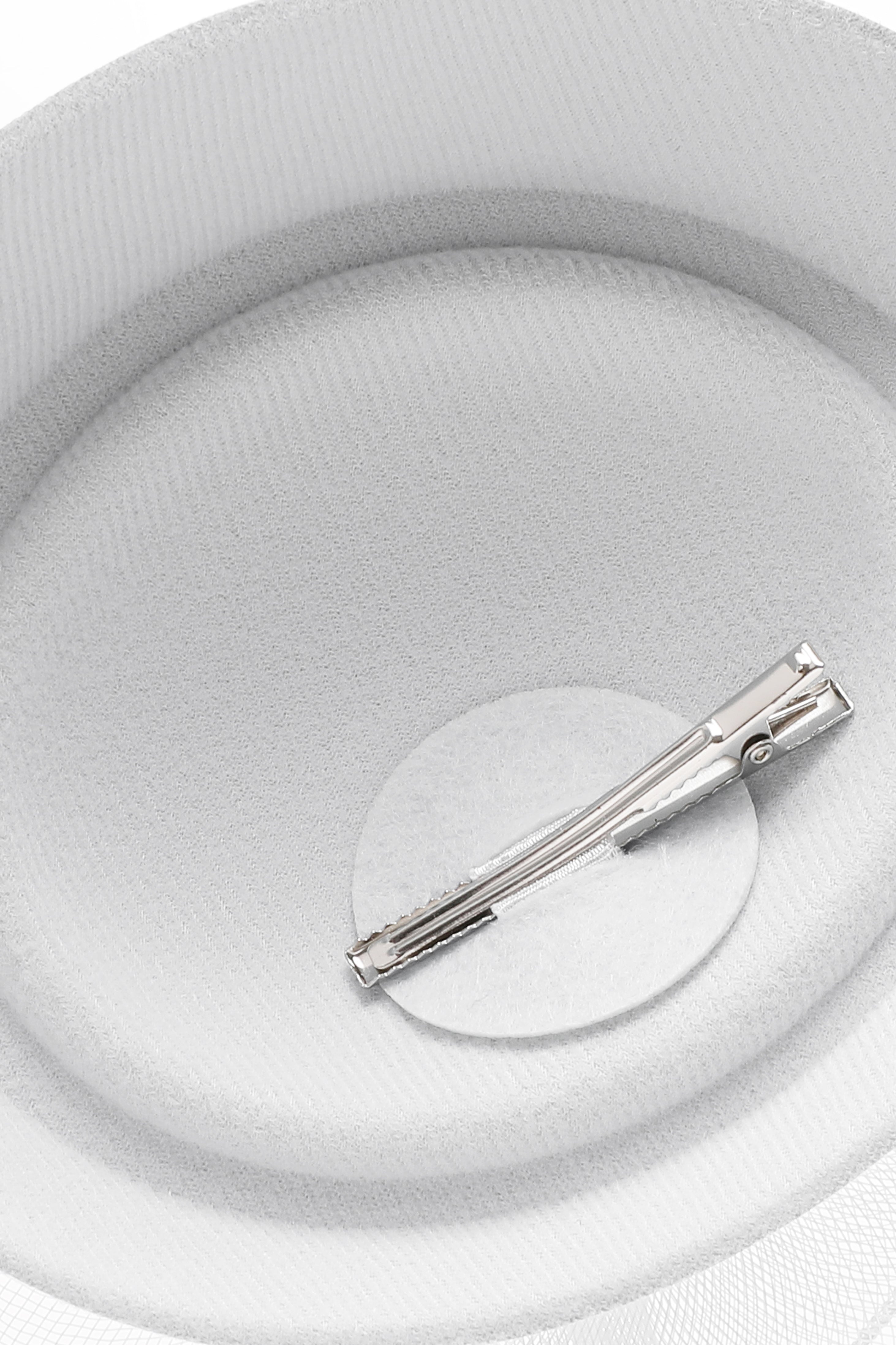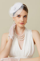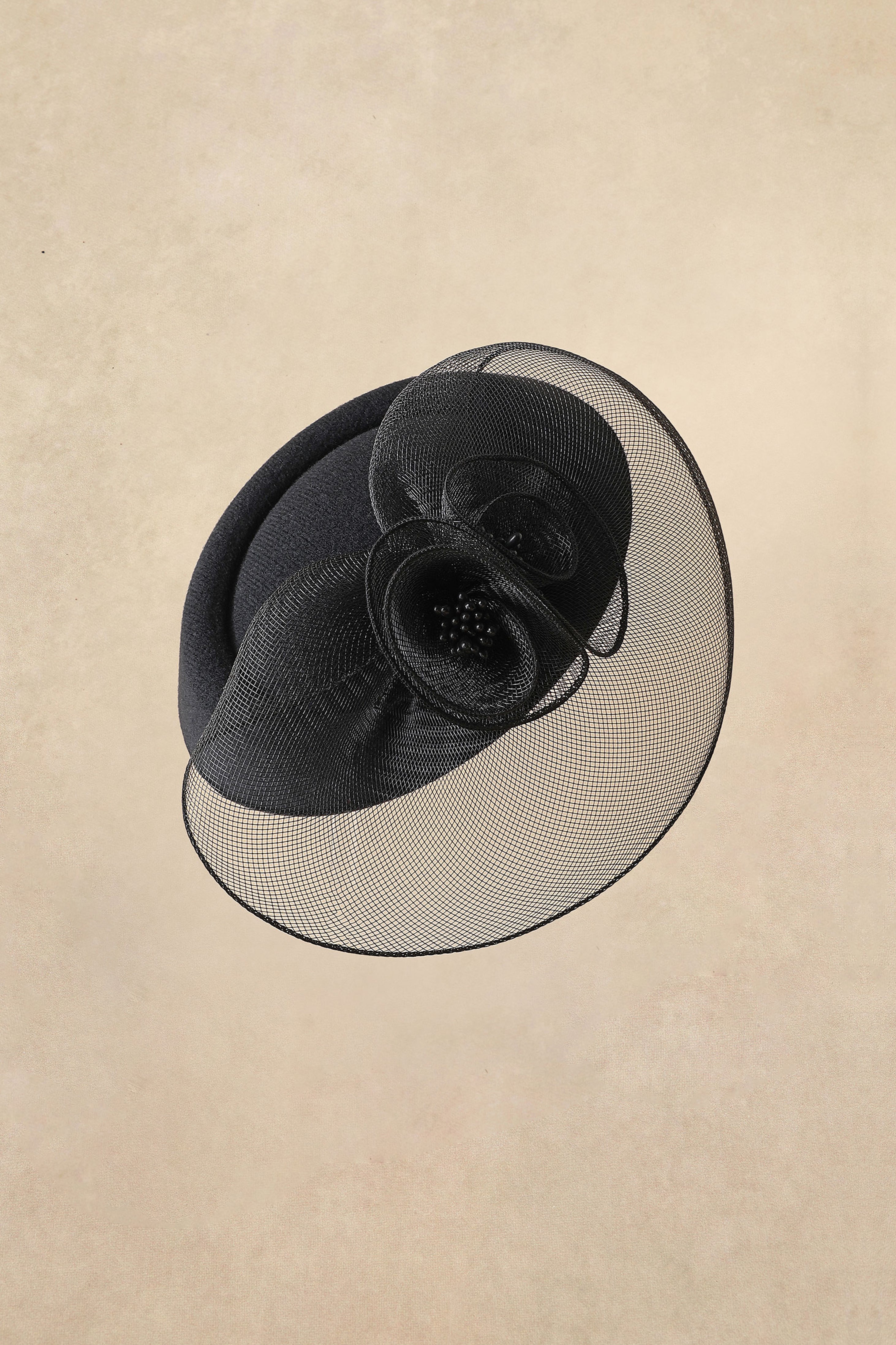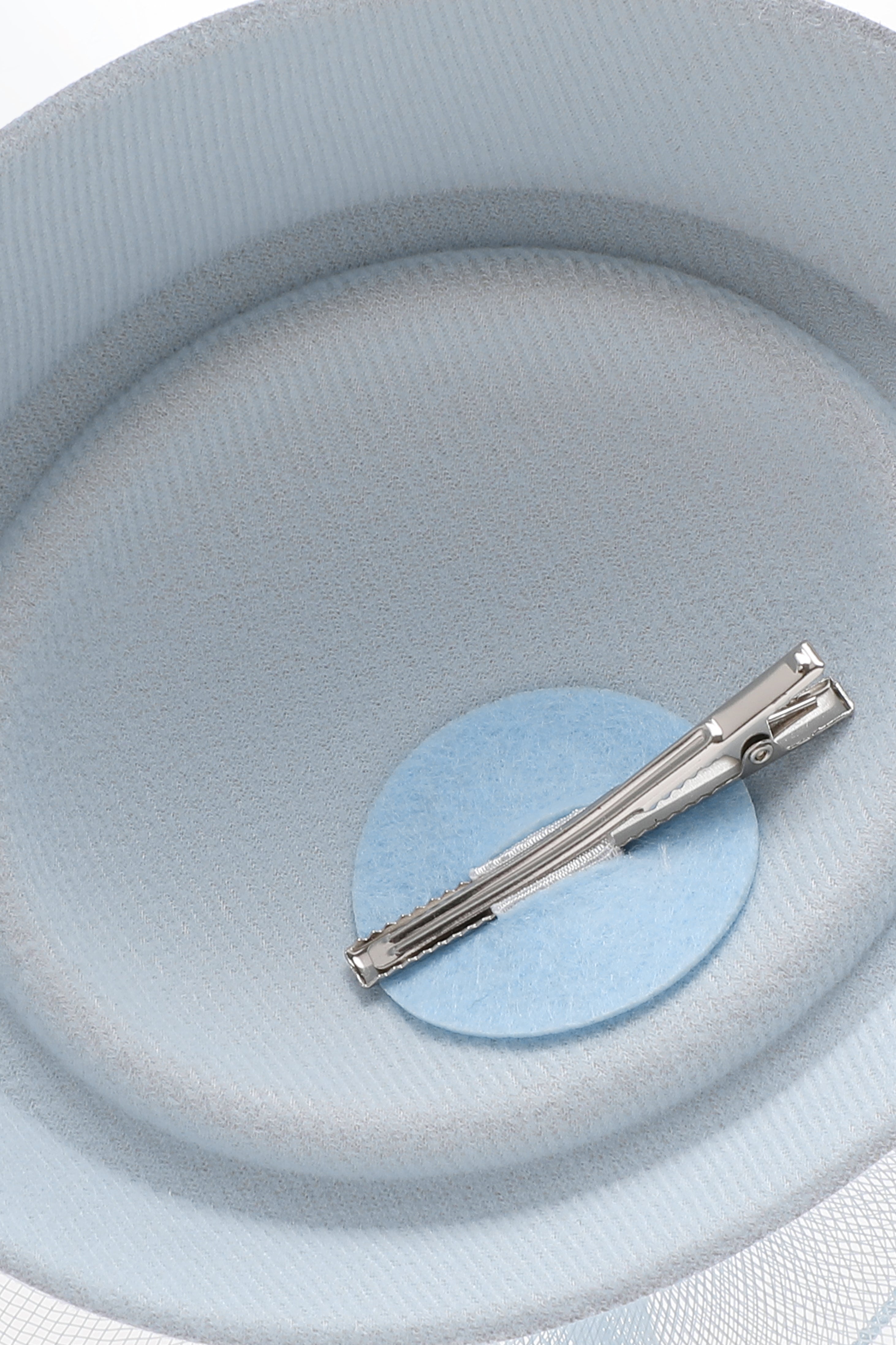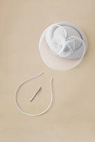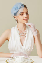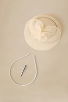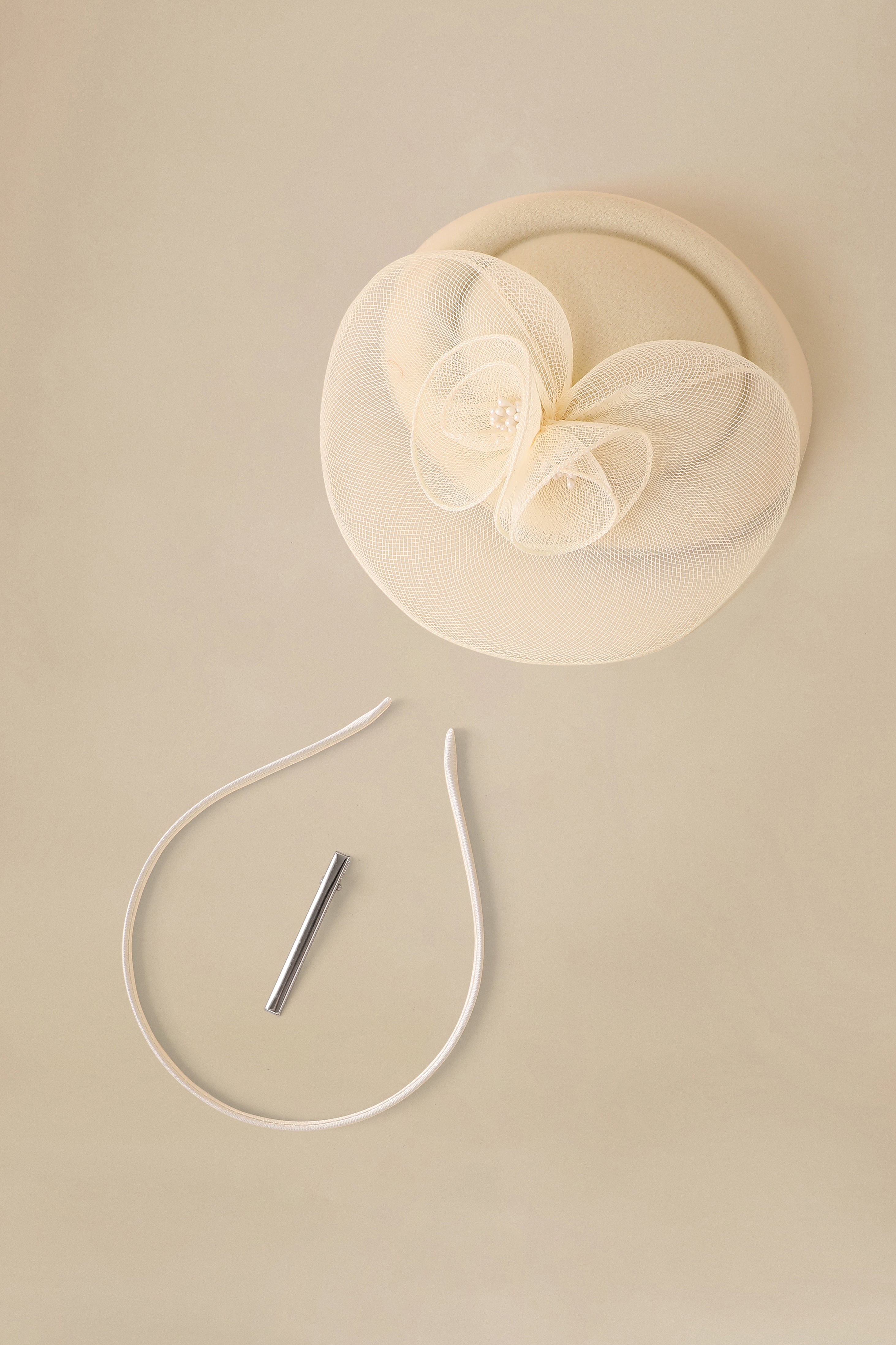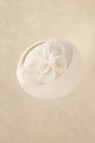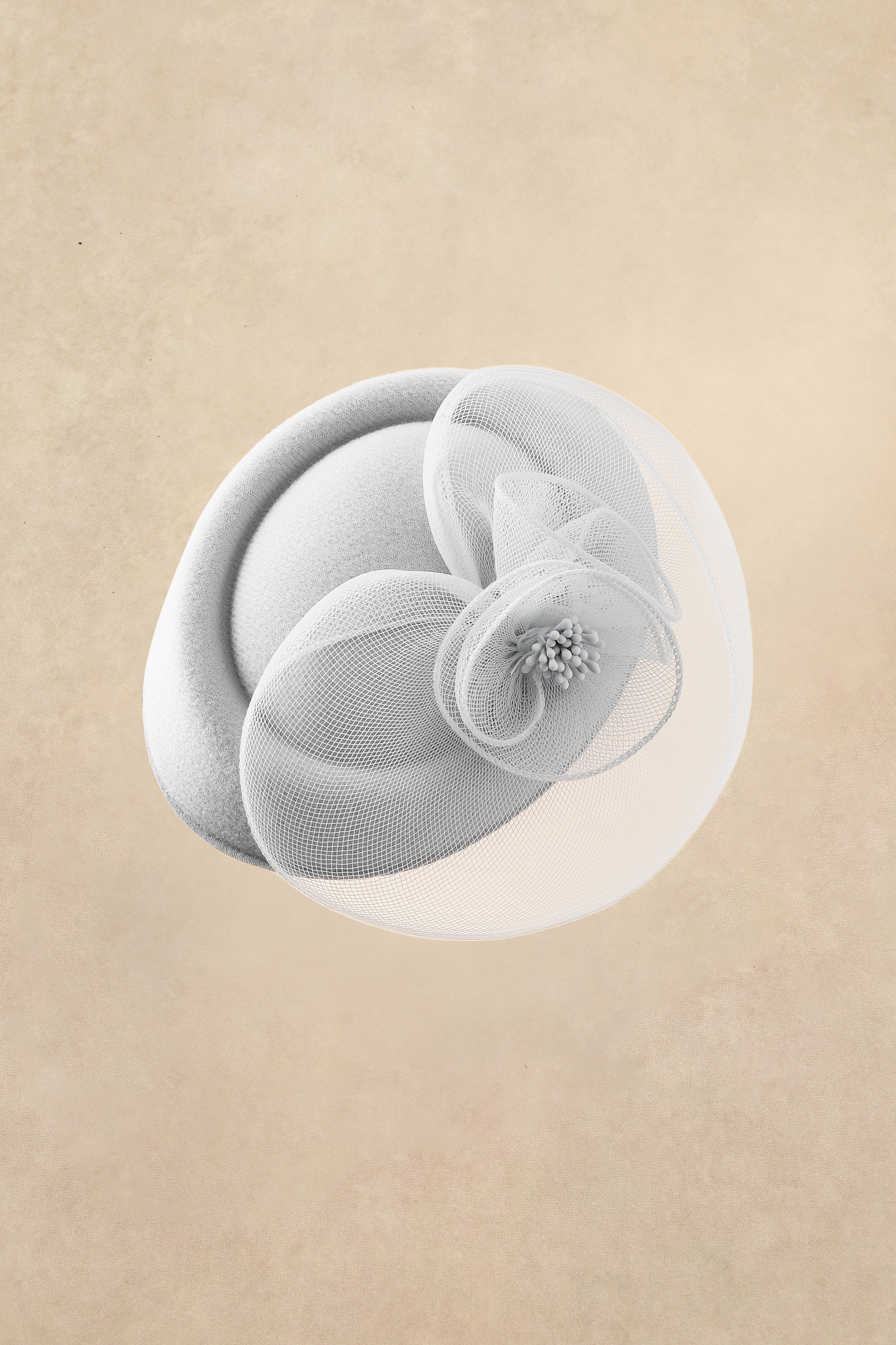This delicate fascinator features a half-face curved veil and petite floral design with a blooming stamen at the center. Elegant and lightweight.