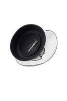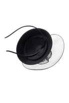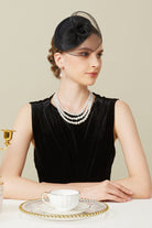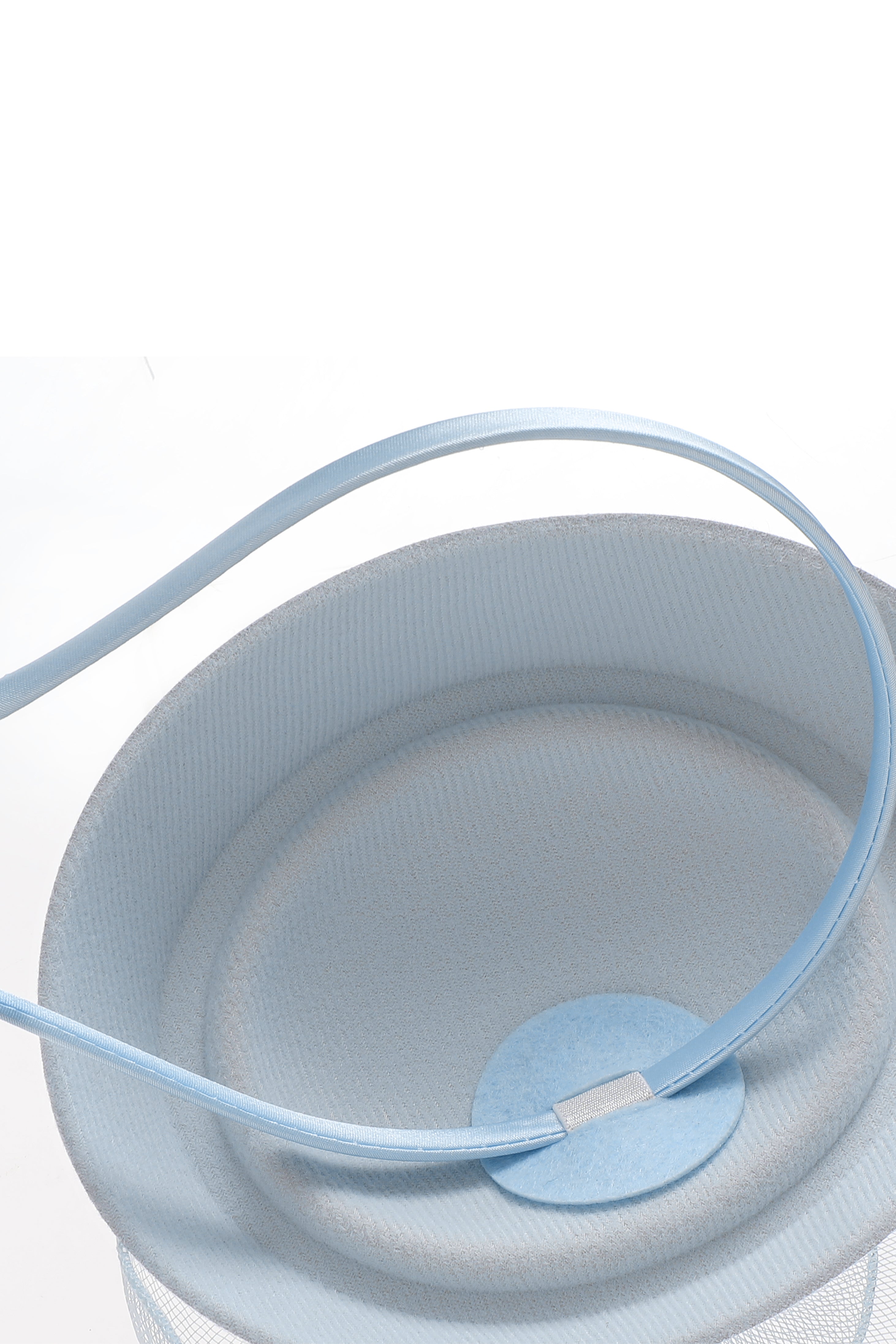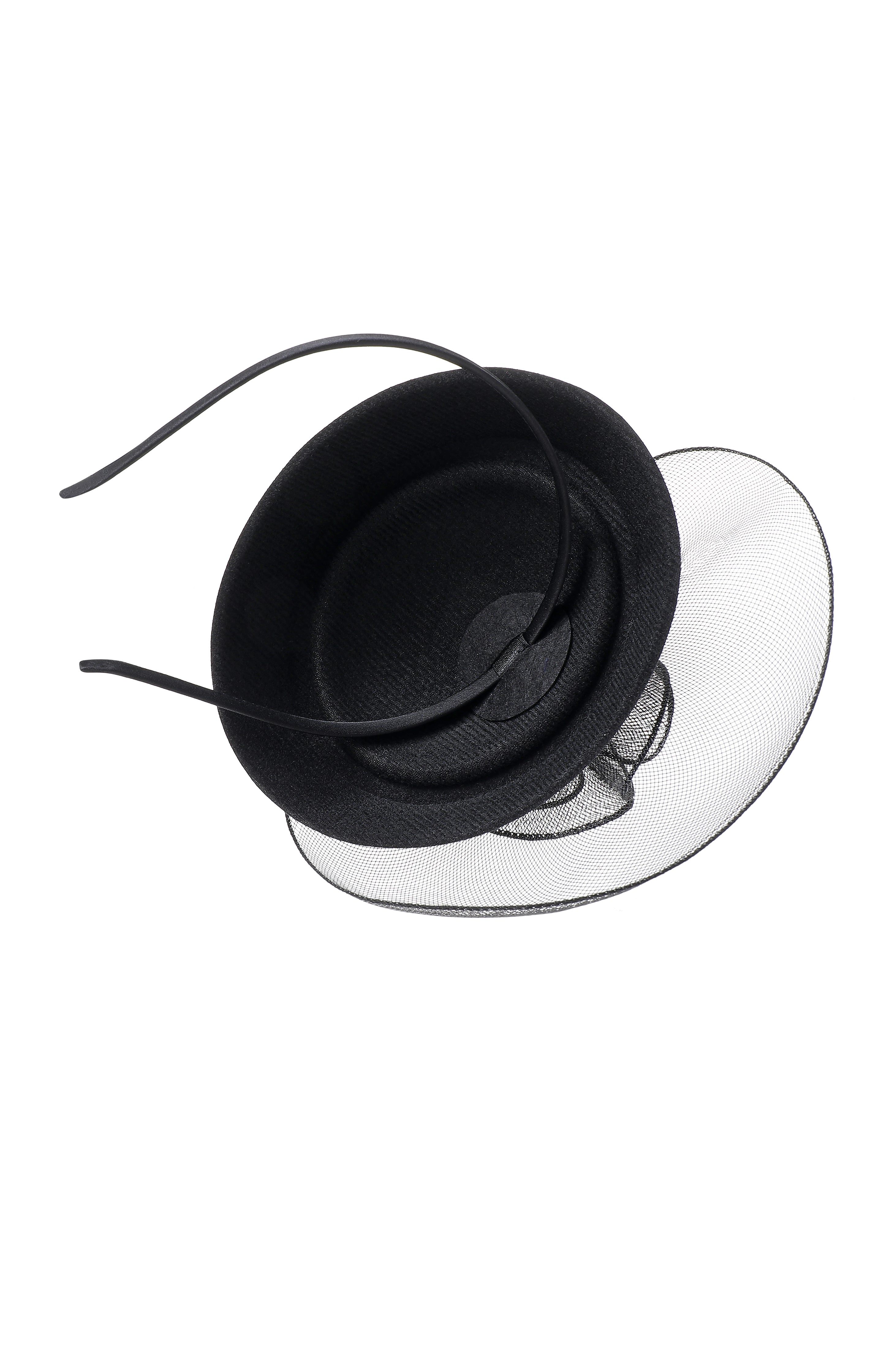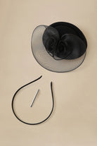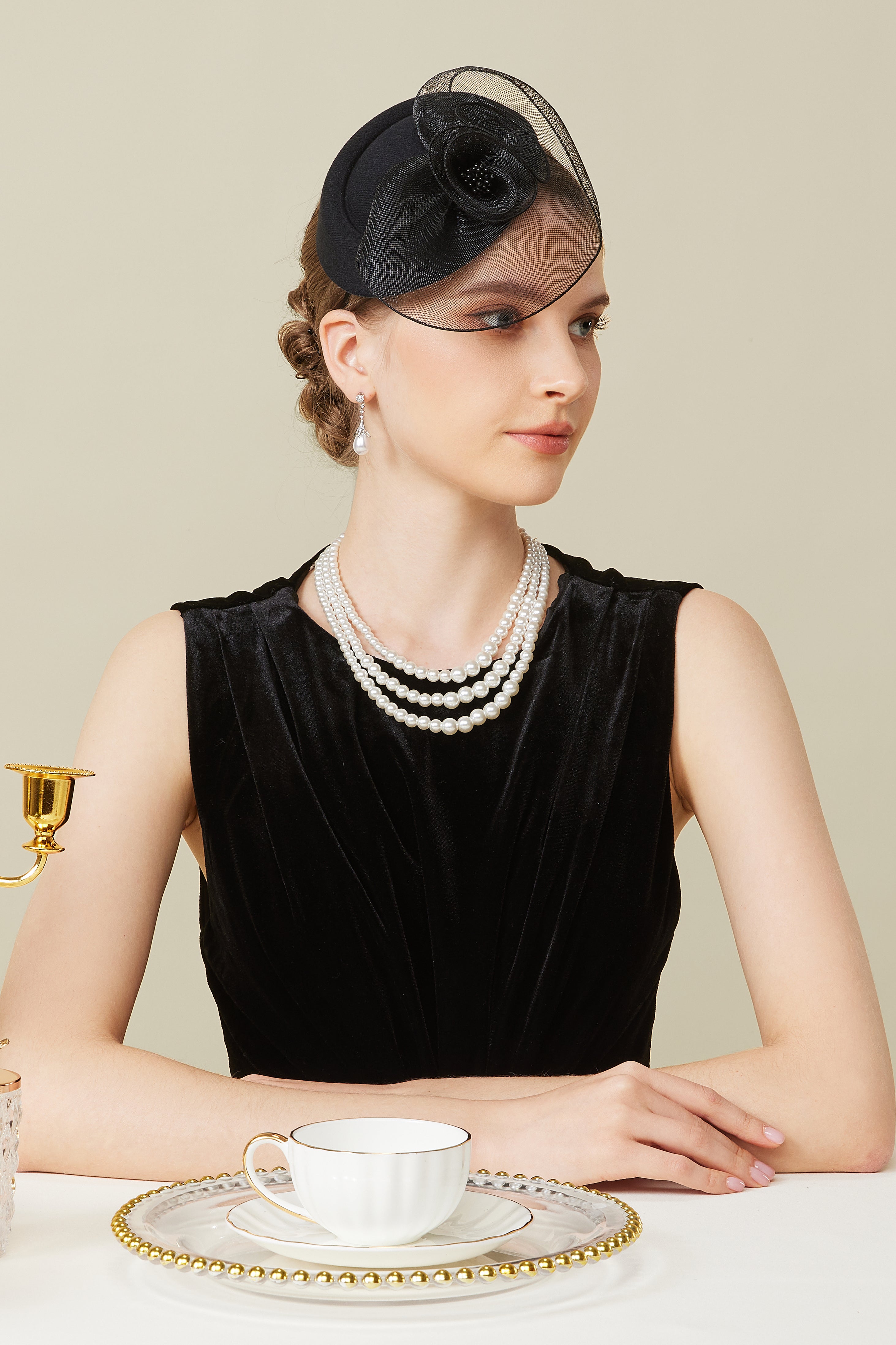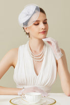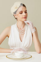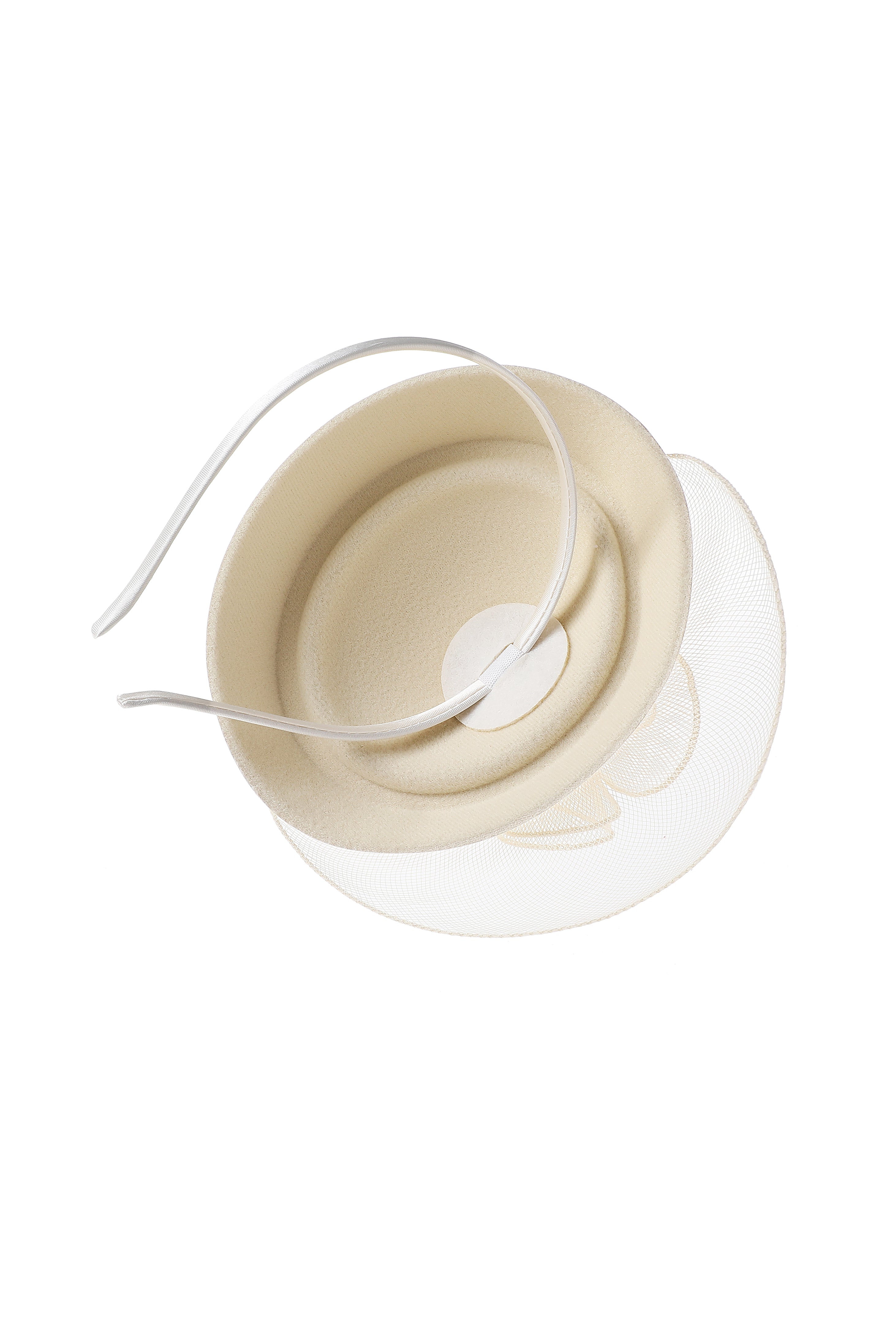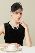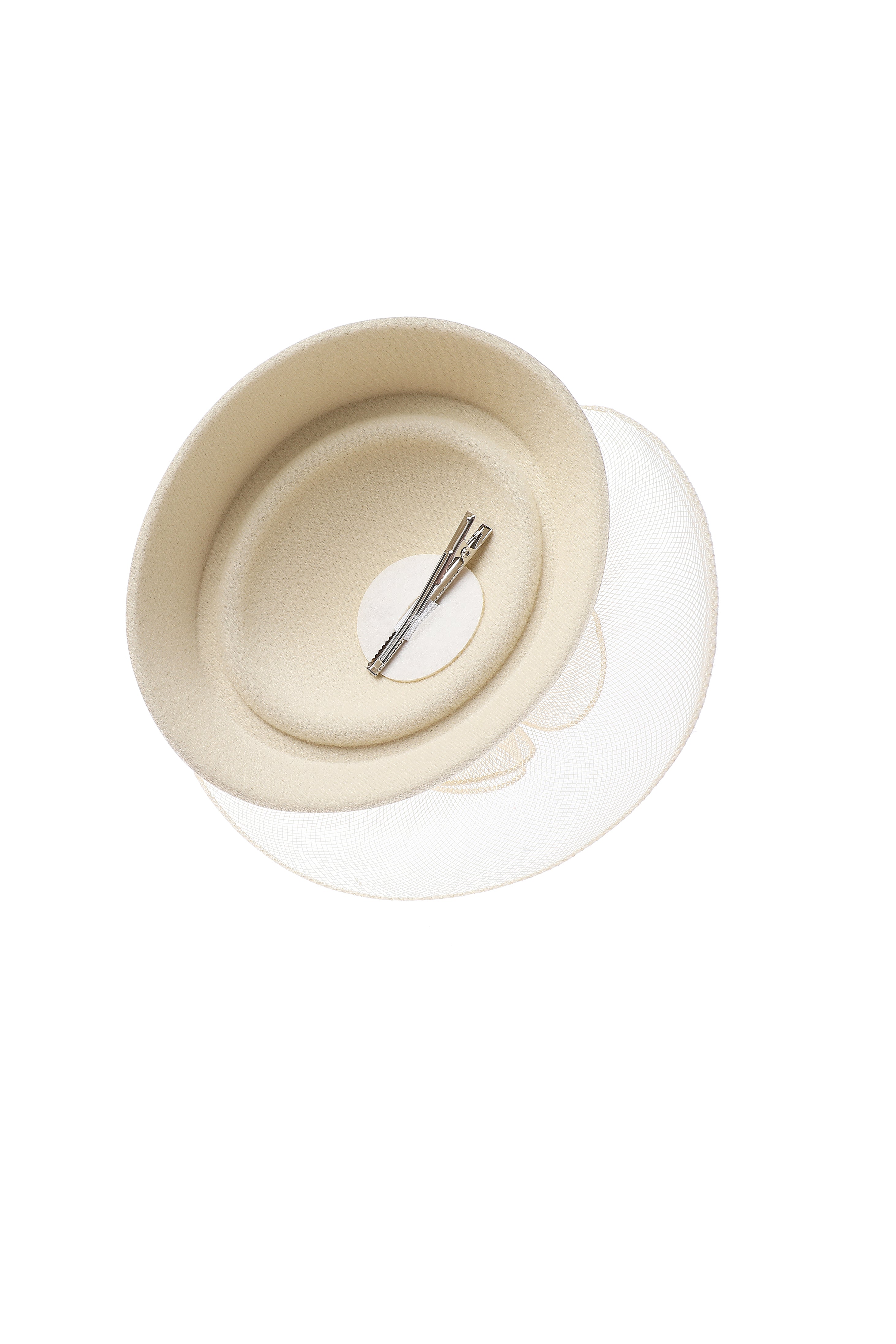 This delicate fascinator features a half-face curved veil and petite floral design with a blooming stamen at the center. Elegant and lightweight.