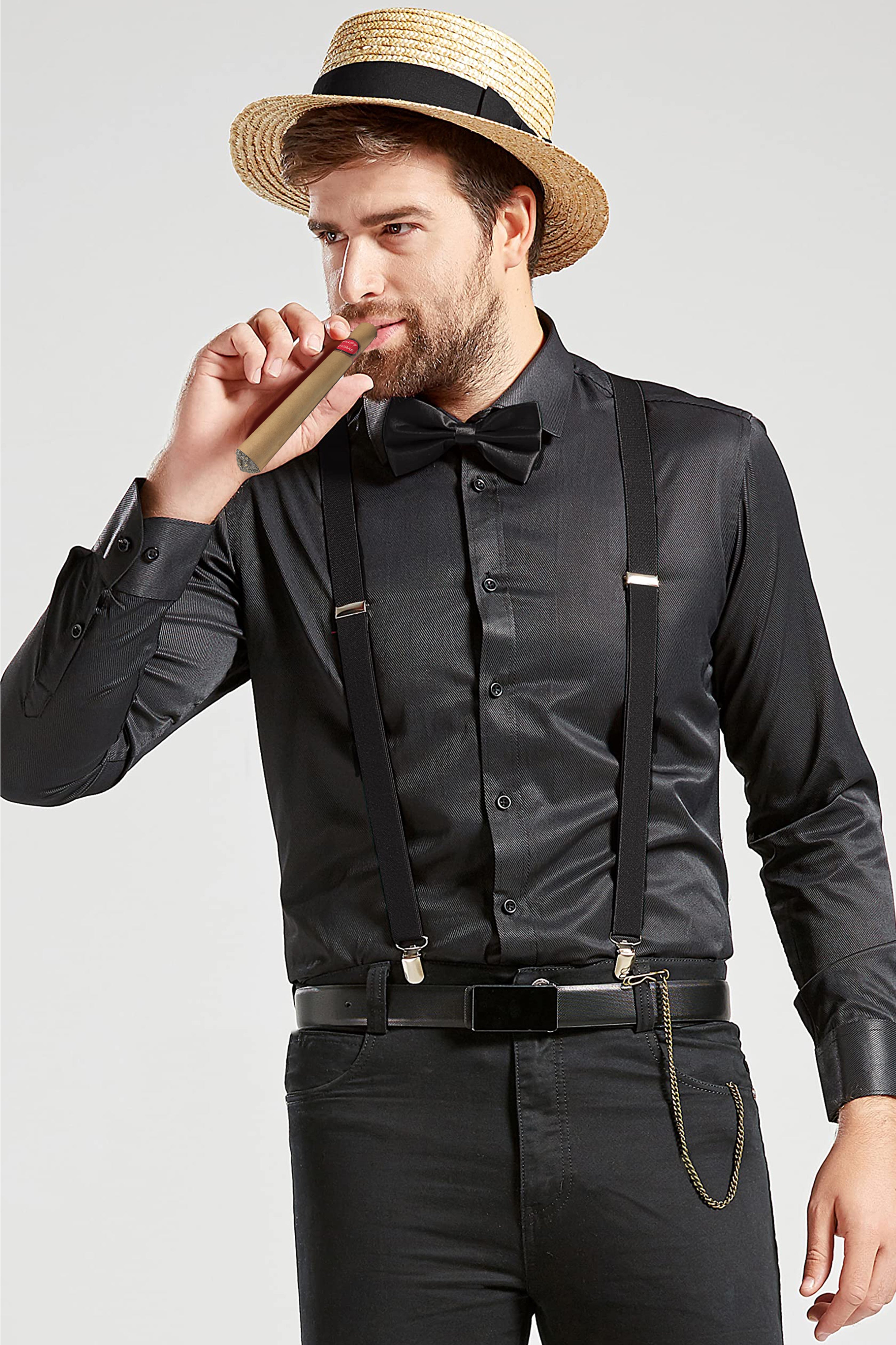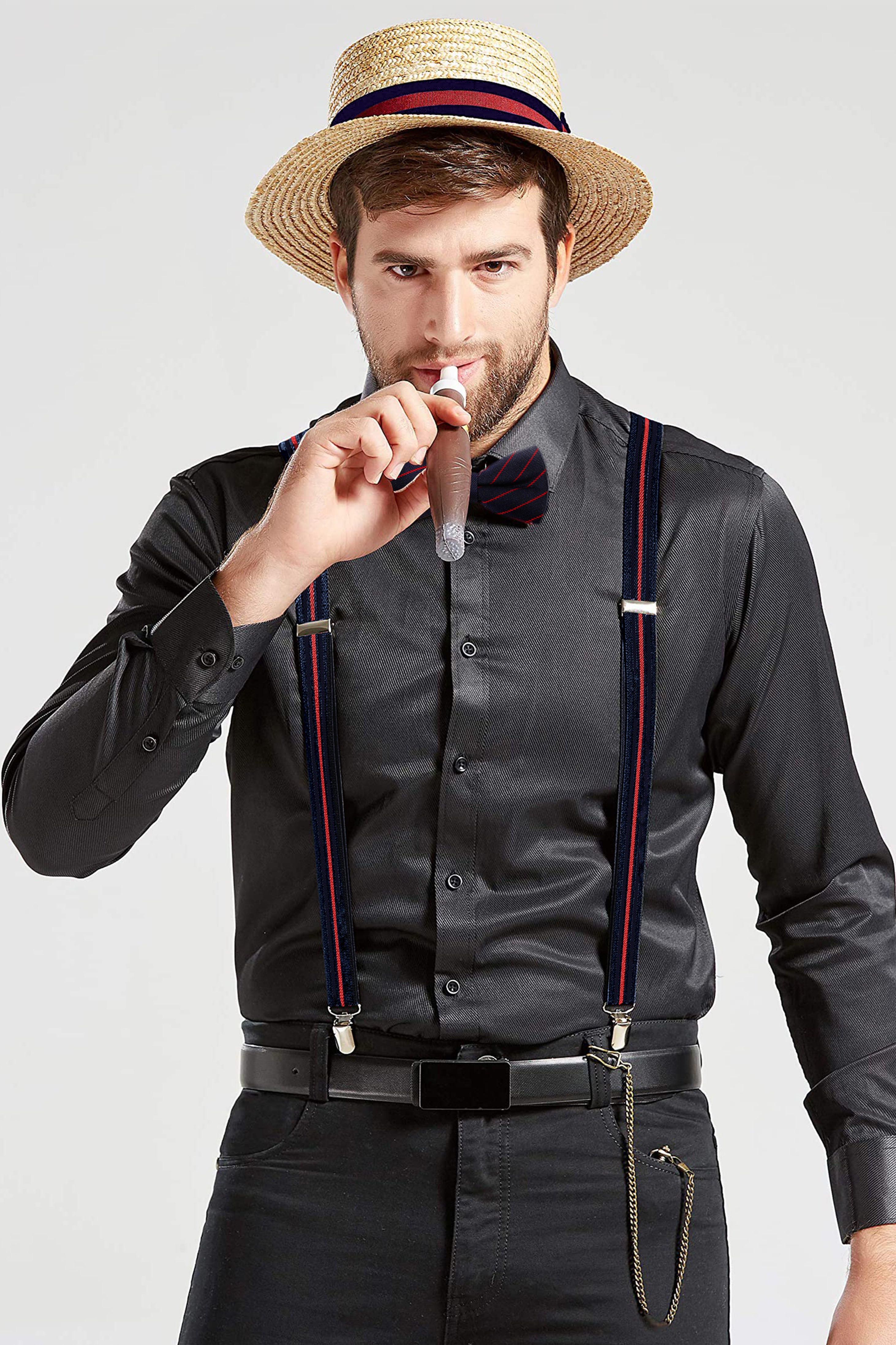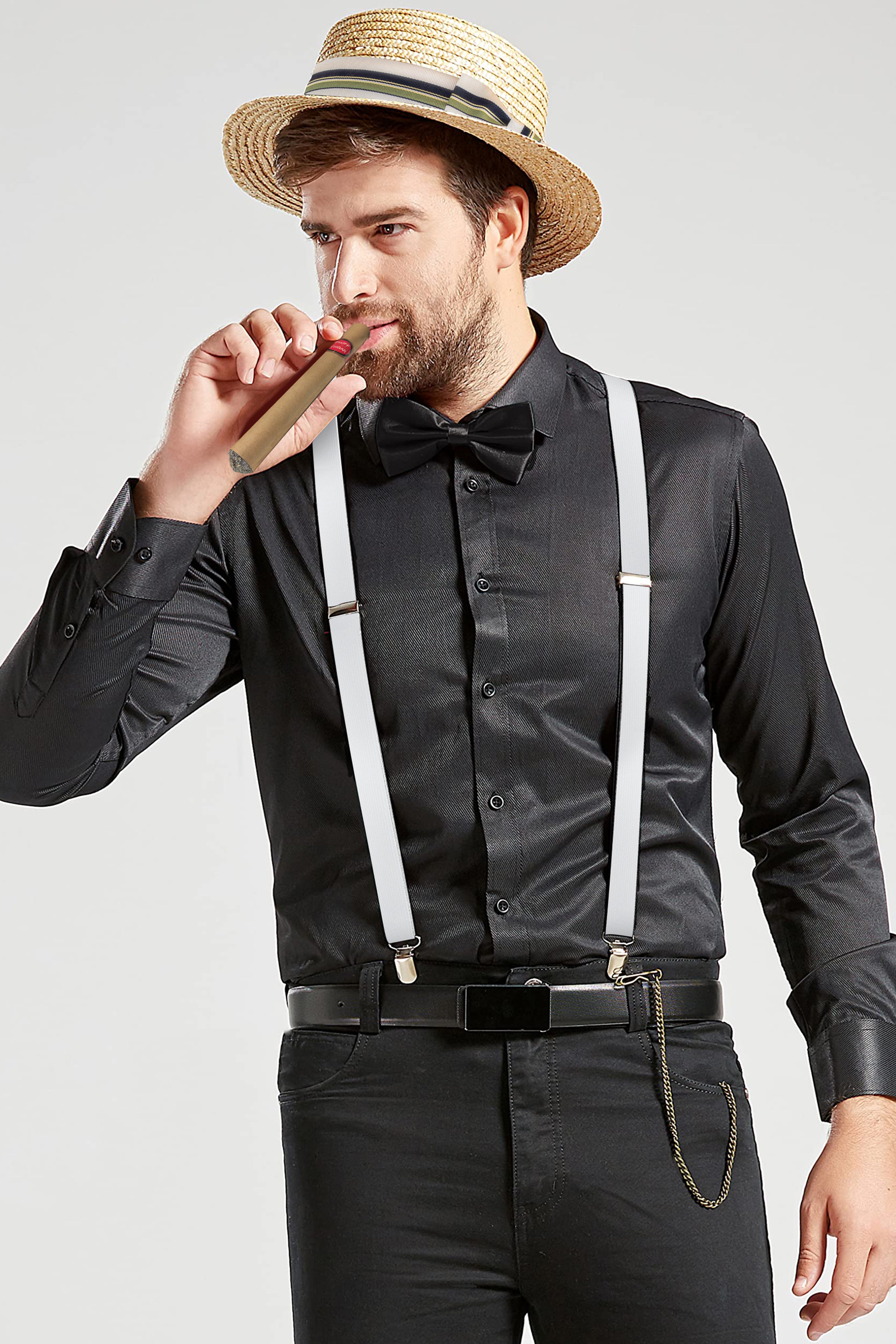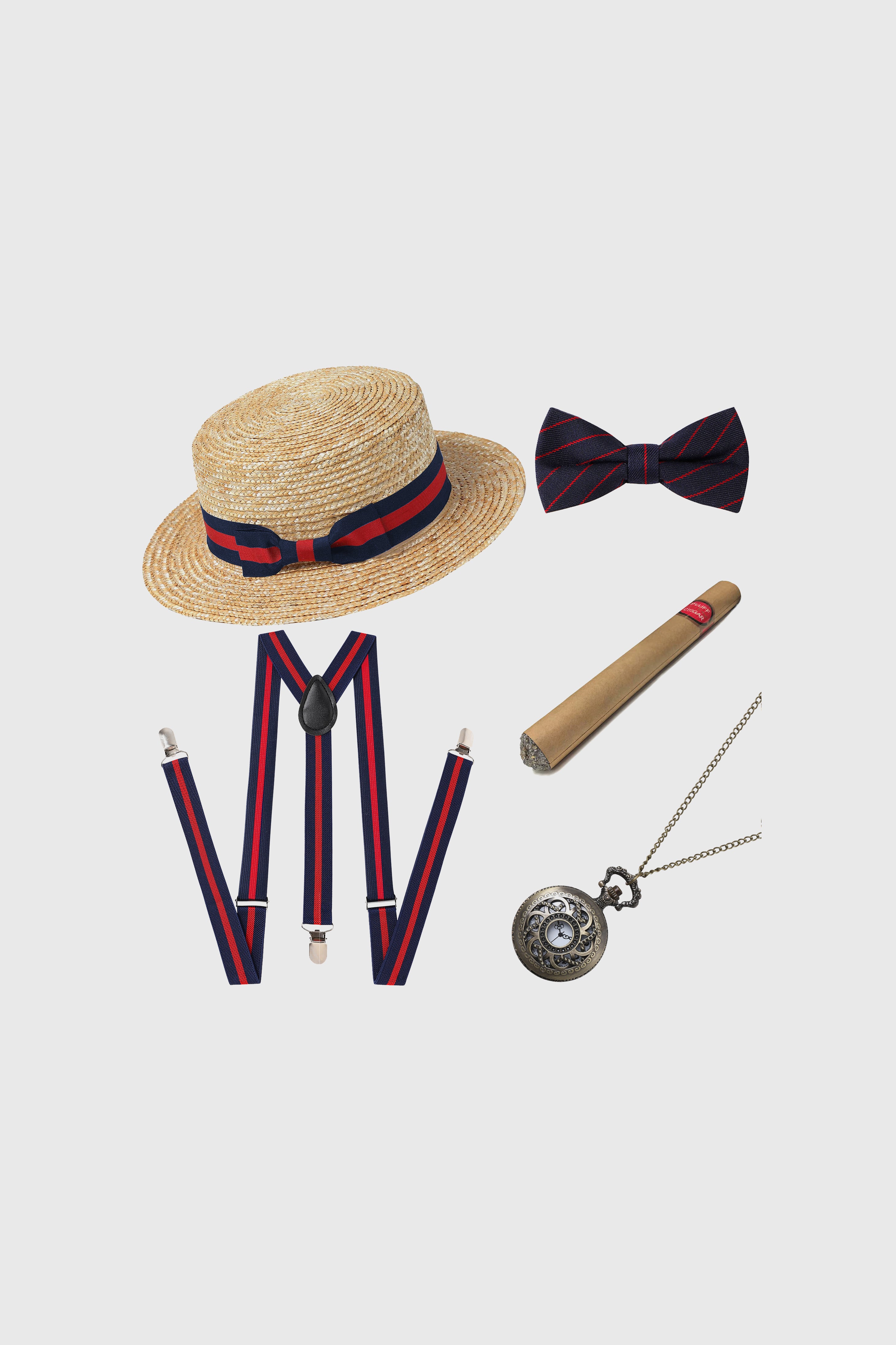 - Includes 1 x Hat, 1 x Suspenders, 1 x Pre-Tied Bow Tie, 1 x Plastic Cigar, 1 x Pocket Watch