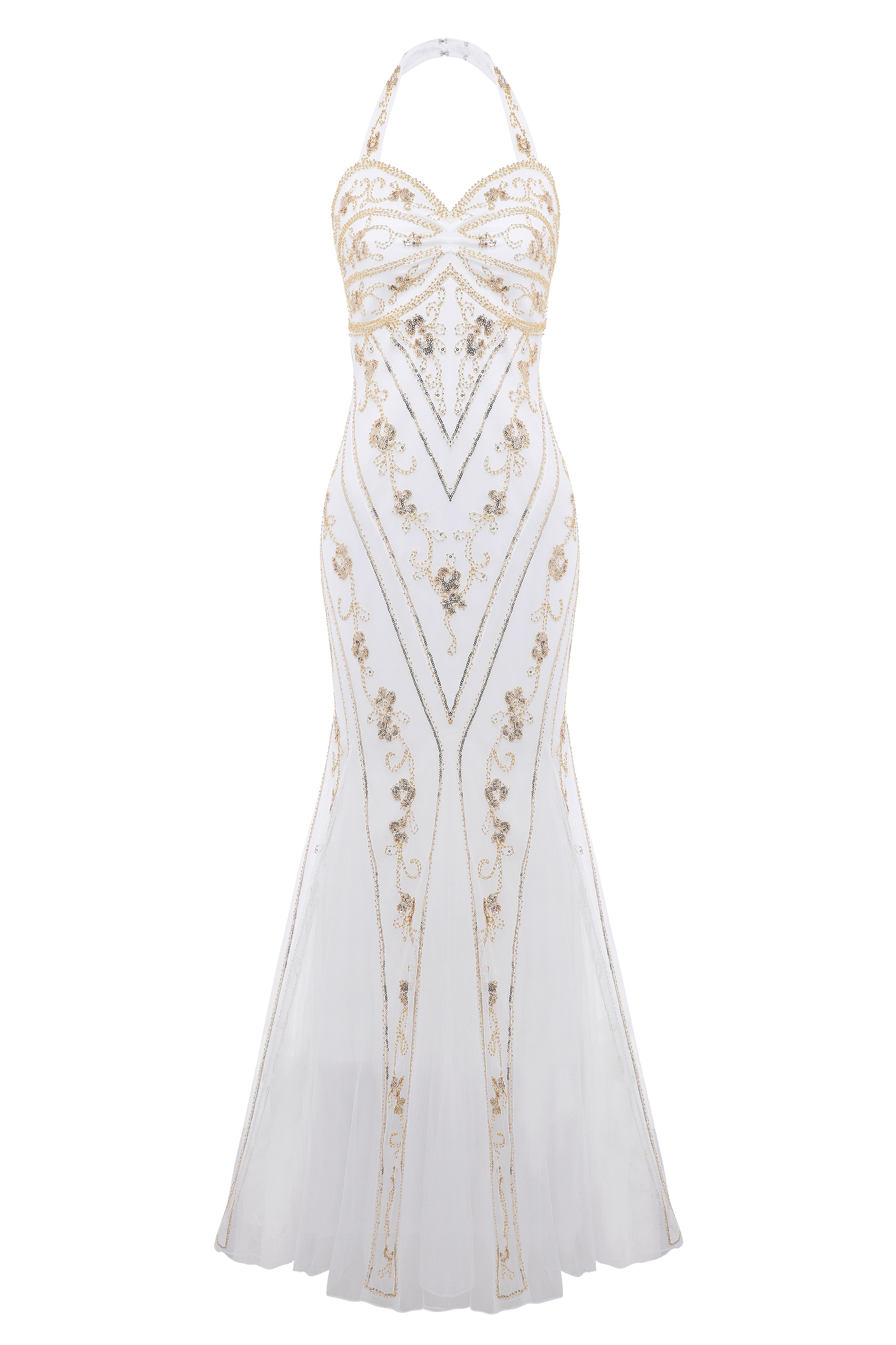 This vintage-inspired retro style dress caters perfectly to 1920s fashion. It's the incarnation of elegance and flair, and the white and gold color match brings out sense of royalty.