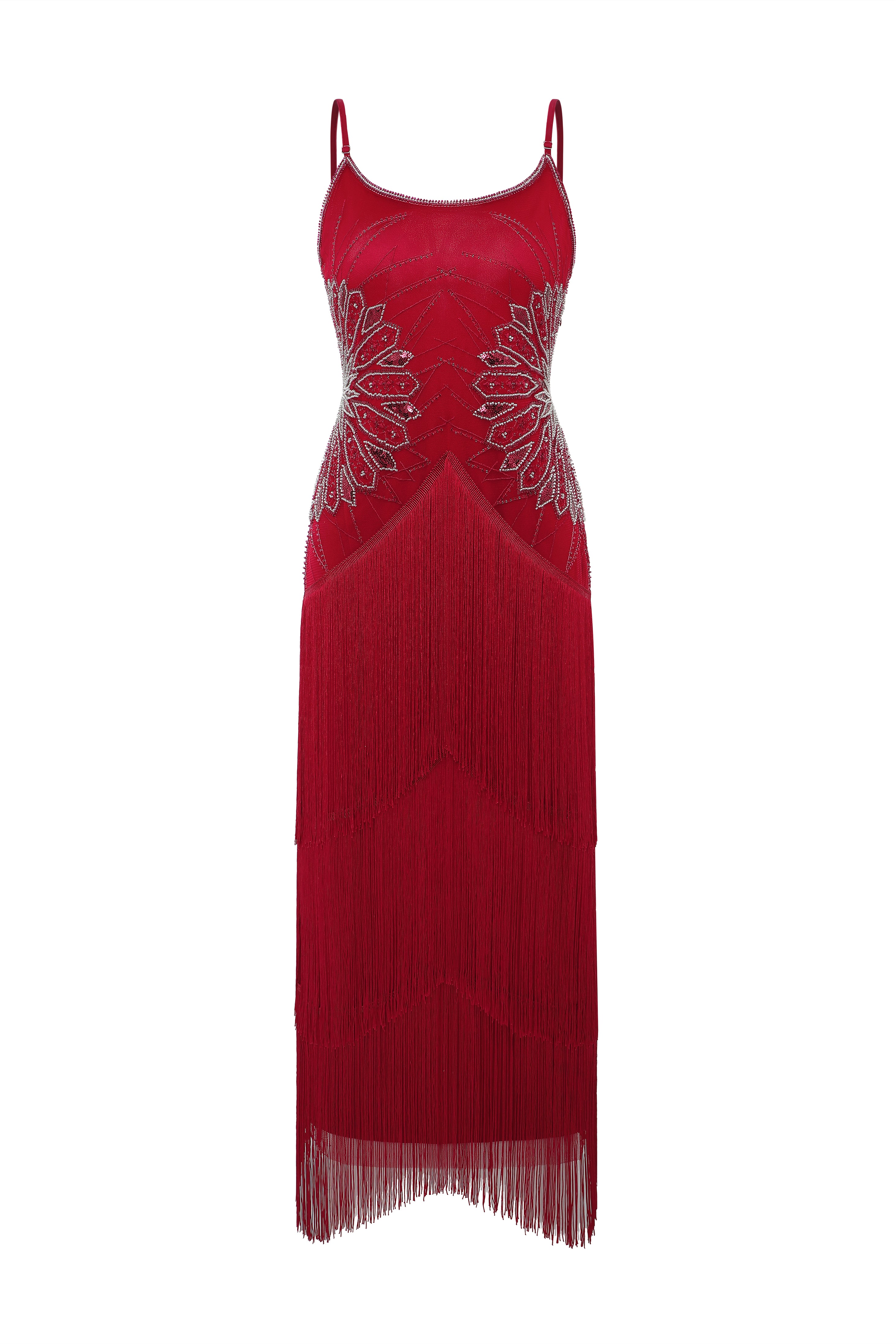 Designed in a sleek, lengthening silhouette, this gown frames the body with shimmering Art Deco fan beadwork that draws the eye to the waist and gently sculpts the figure. Tiered fringe cascades with fluid softness, creating graceful movement from every angle. With its blend of fluid motion and luminous detail, it creates a presence that feels effortlessly captivating the moment you step into the room.