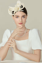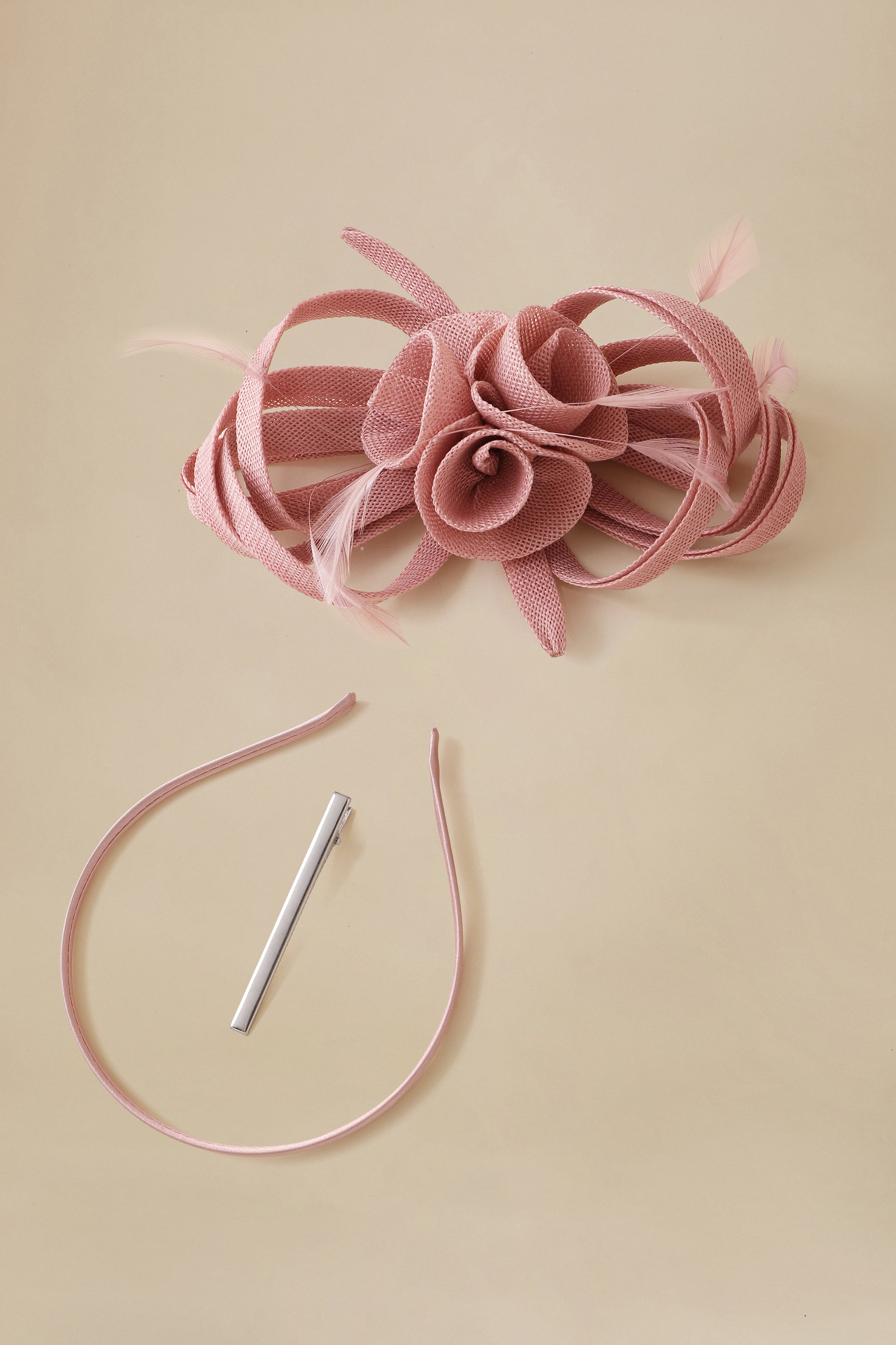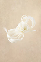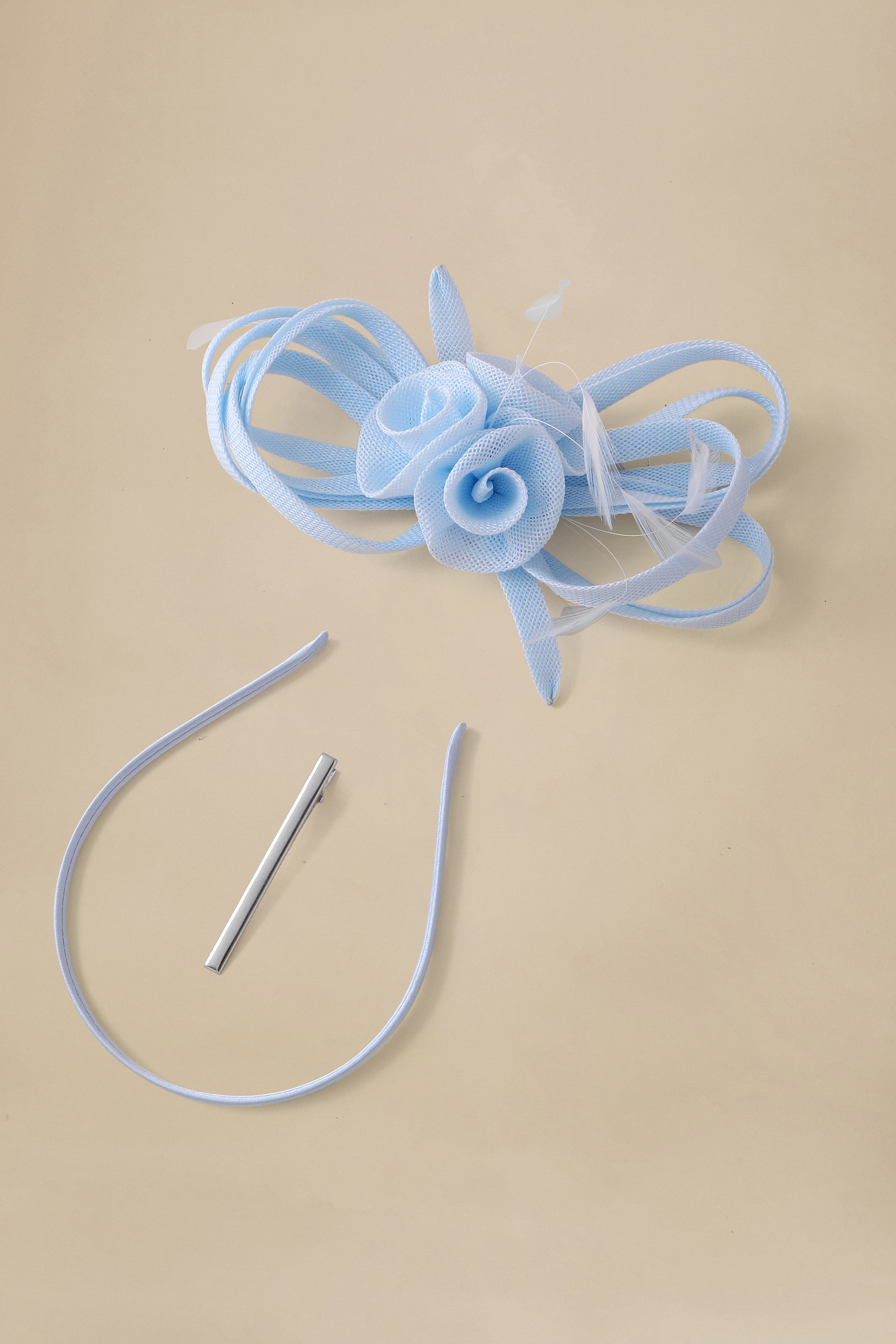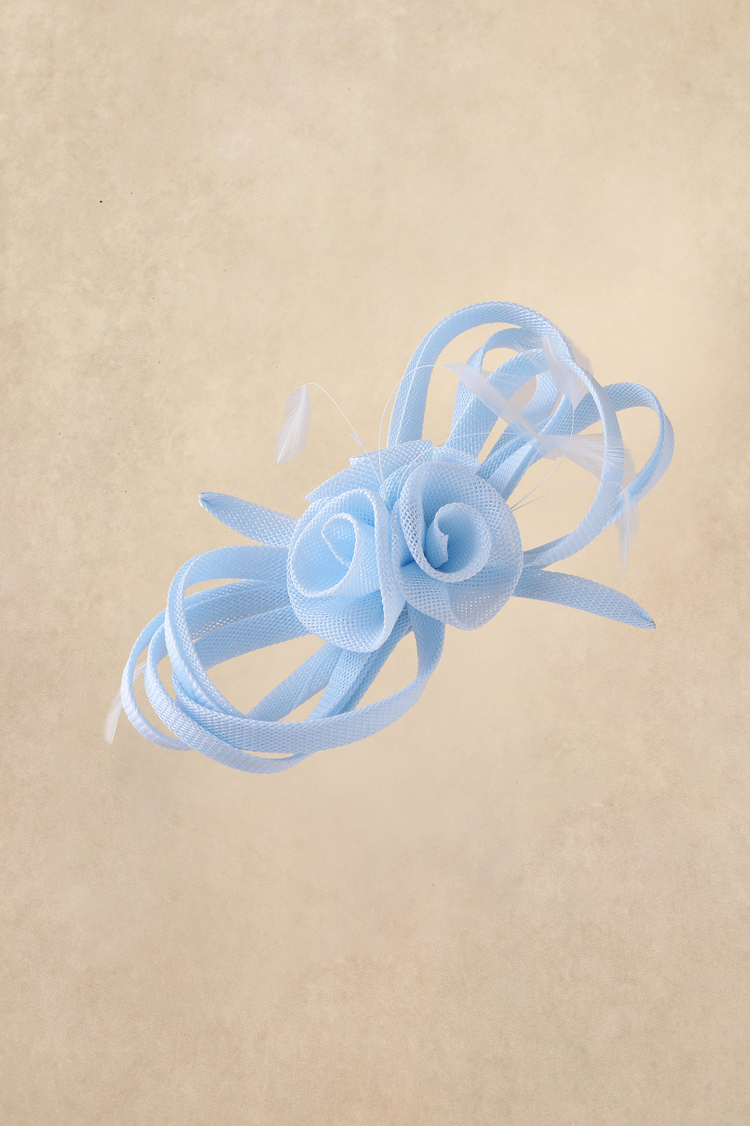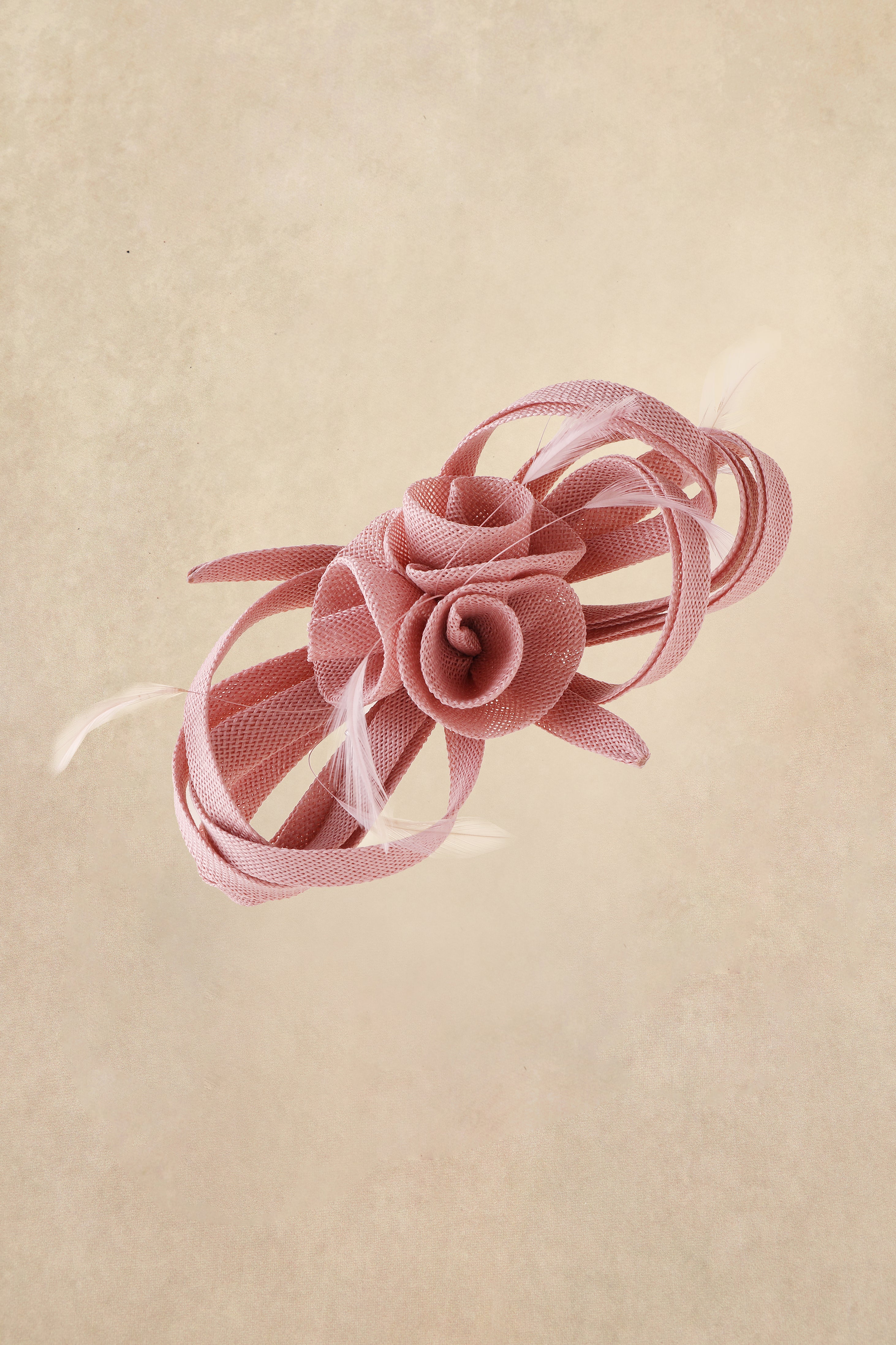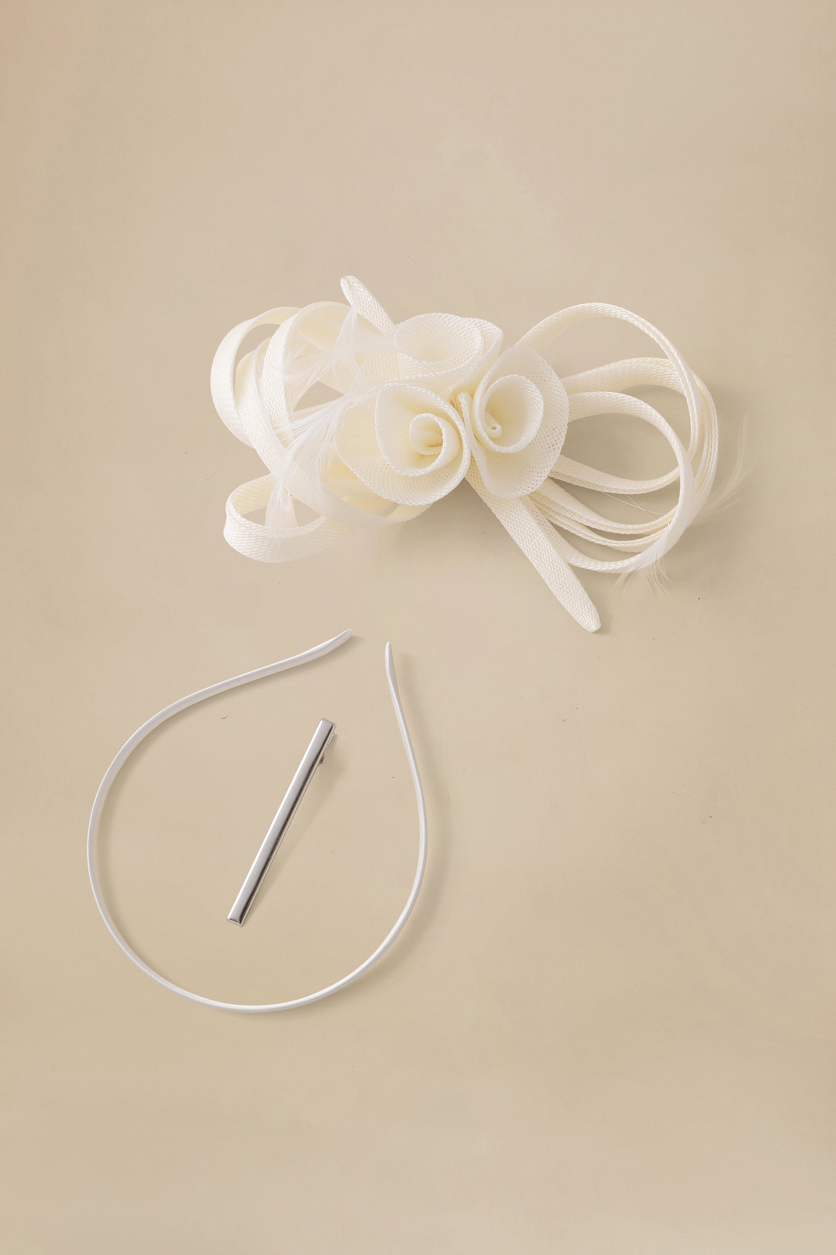 This artistic fascinator features sculpted ribbon roses and swirling loops, accented with delicate feathers for a dynamic silhouette. Designed with a headband and clip, it offers versatile styling and adds refined elegance to formal occasions.