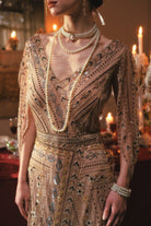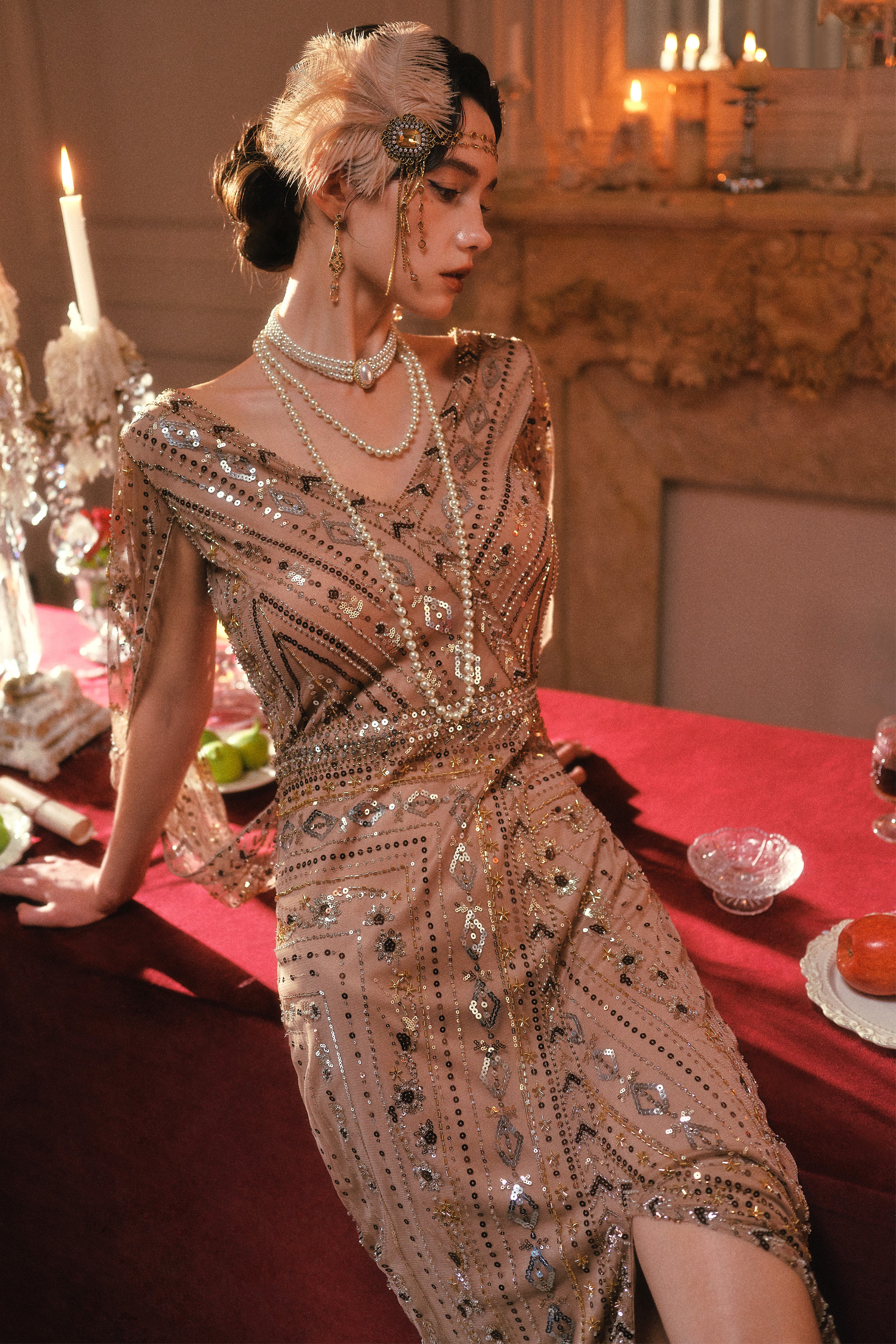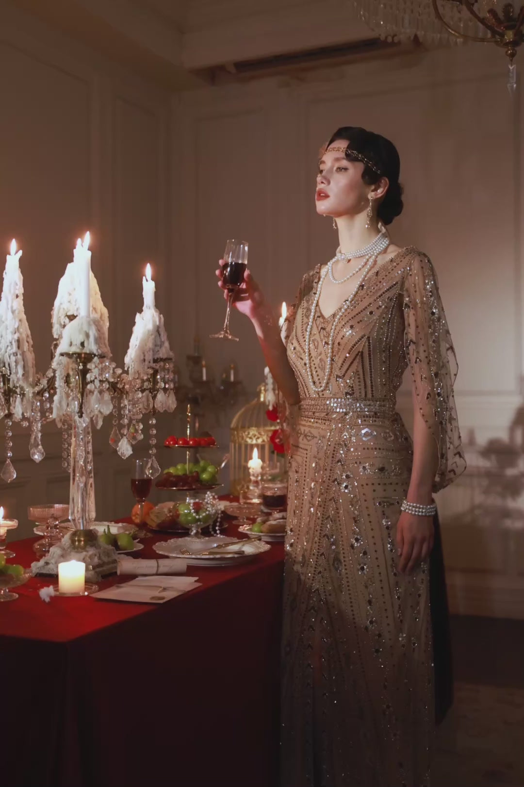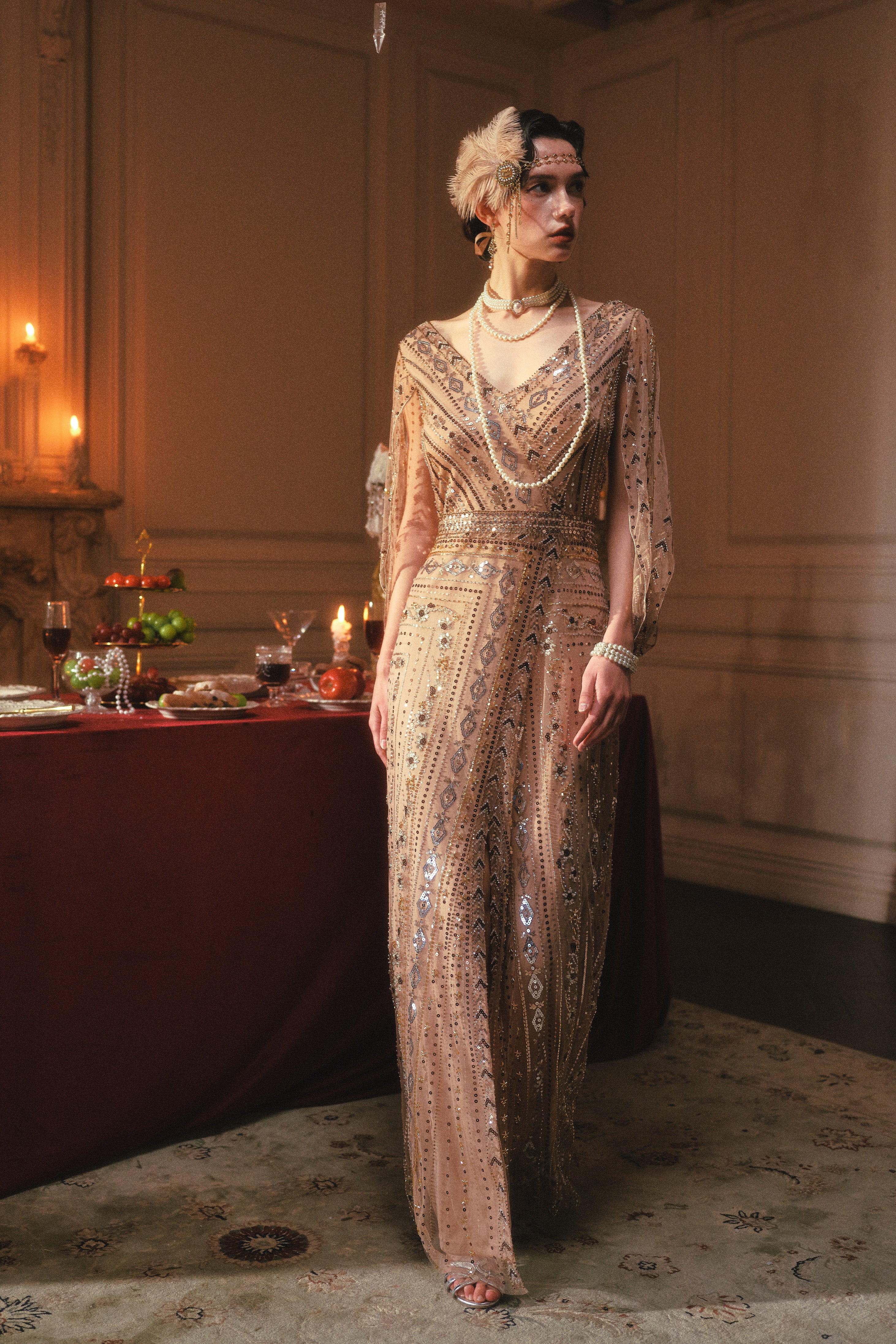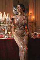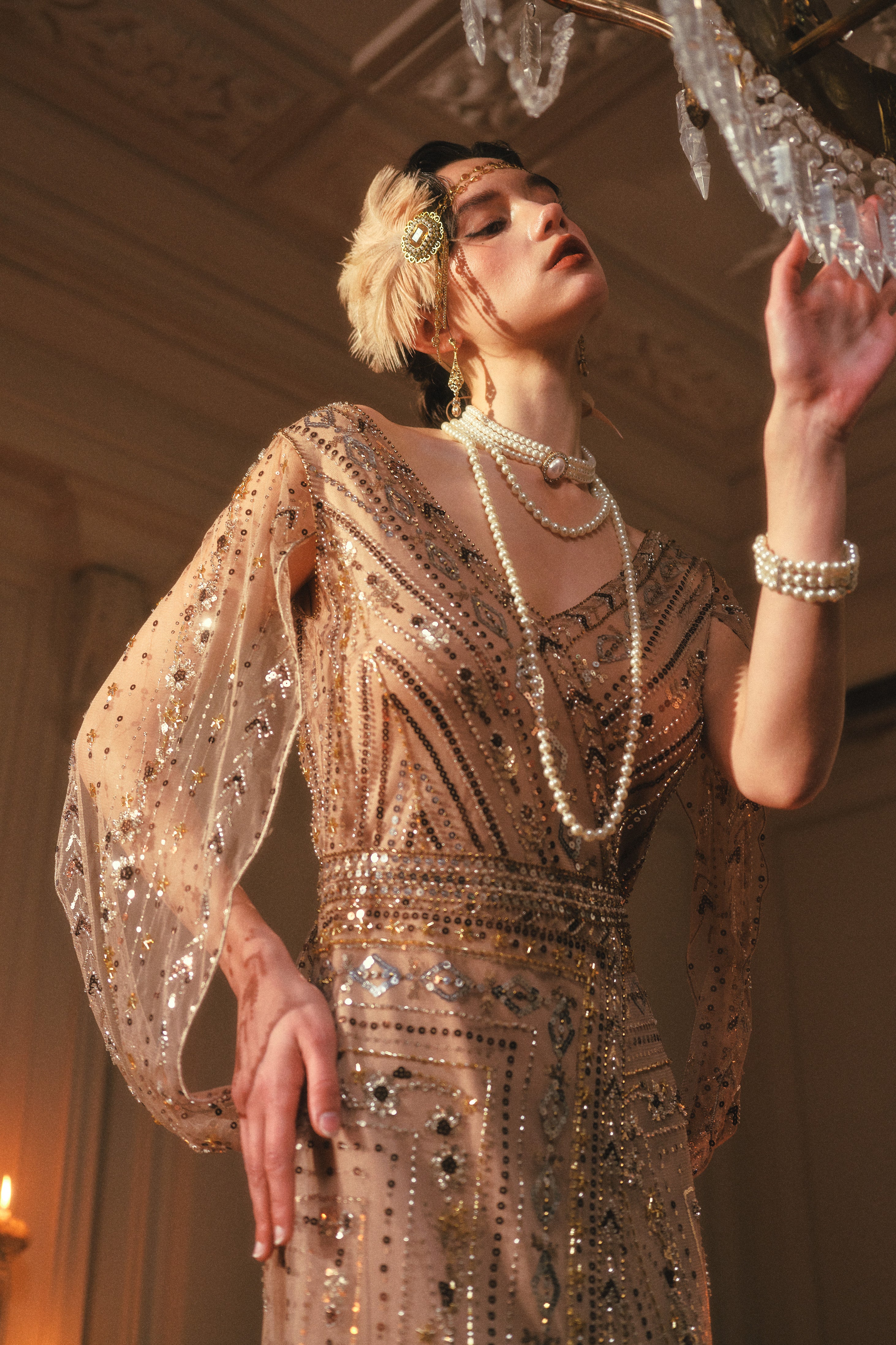 Champagne sequins blaze with every movement, catching reflections from crystal and silver above. Fingers lift and grasp the chandelier while cape and hem swirl with bold grace. The gown's overlapping patterns catch the light, layering shimmer and depth across her form. Laughter and chatter ripple below, yet her energy fills the room, exhilarated, fearless, and fully in command. Every gesture radiates confidence, playful and magnetic, drawing every eye without effort.