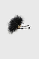 A 1920s-inspired statement piece with lush black feathers and a delicate gold filigree leaf accent set on a double beaded band.