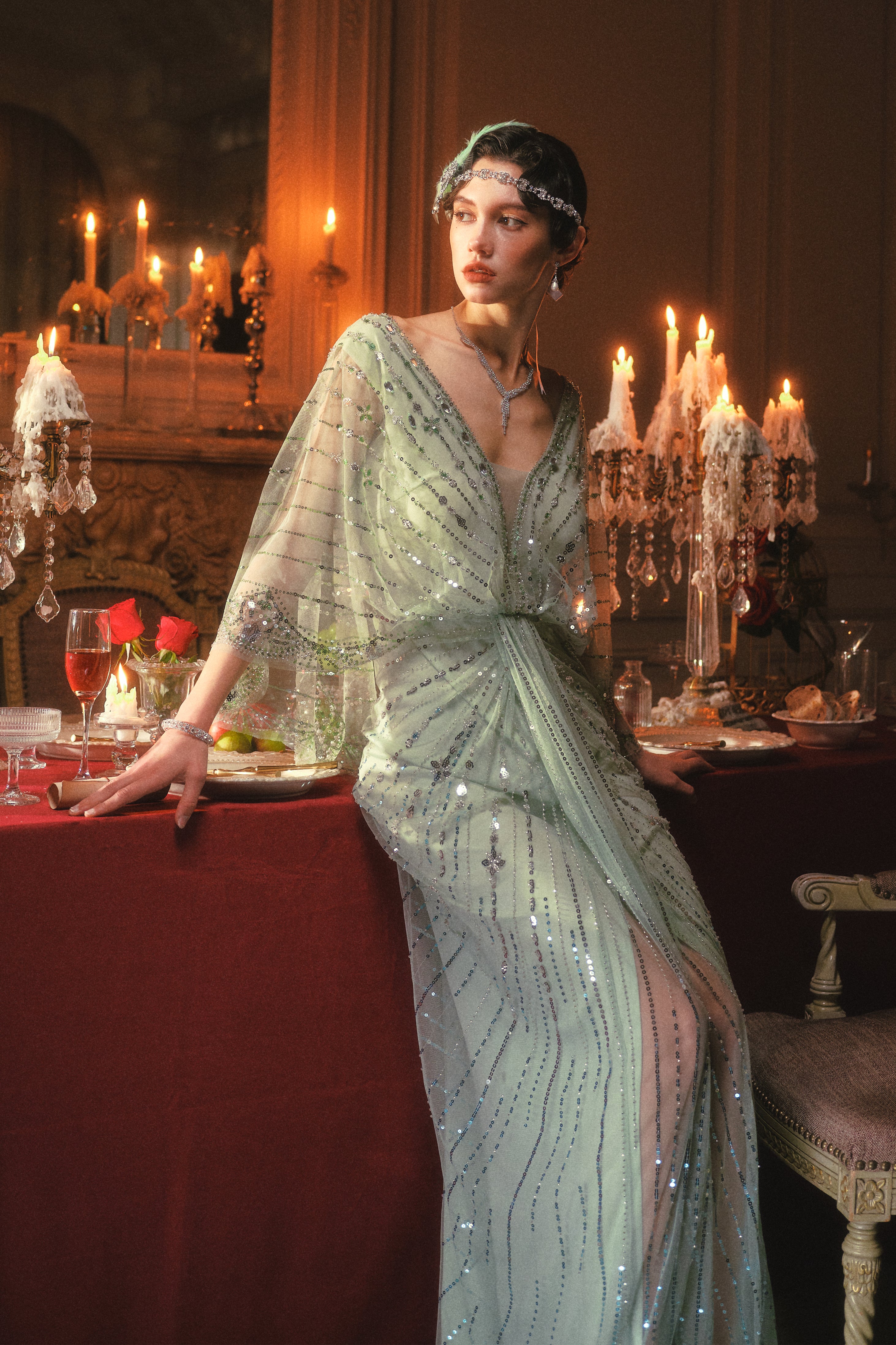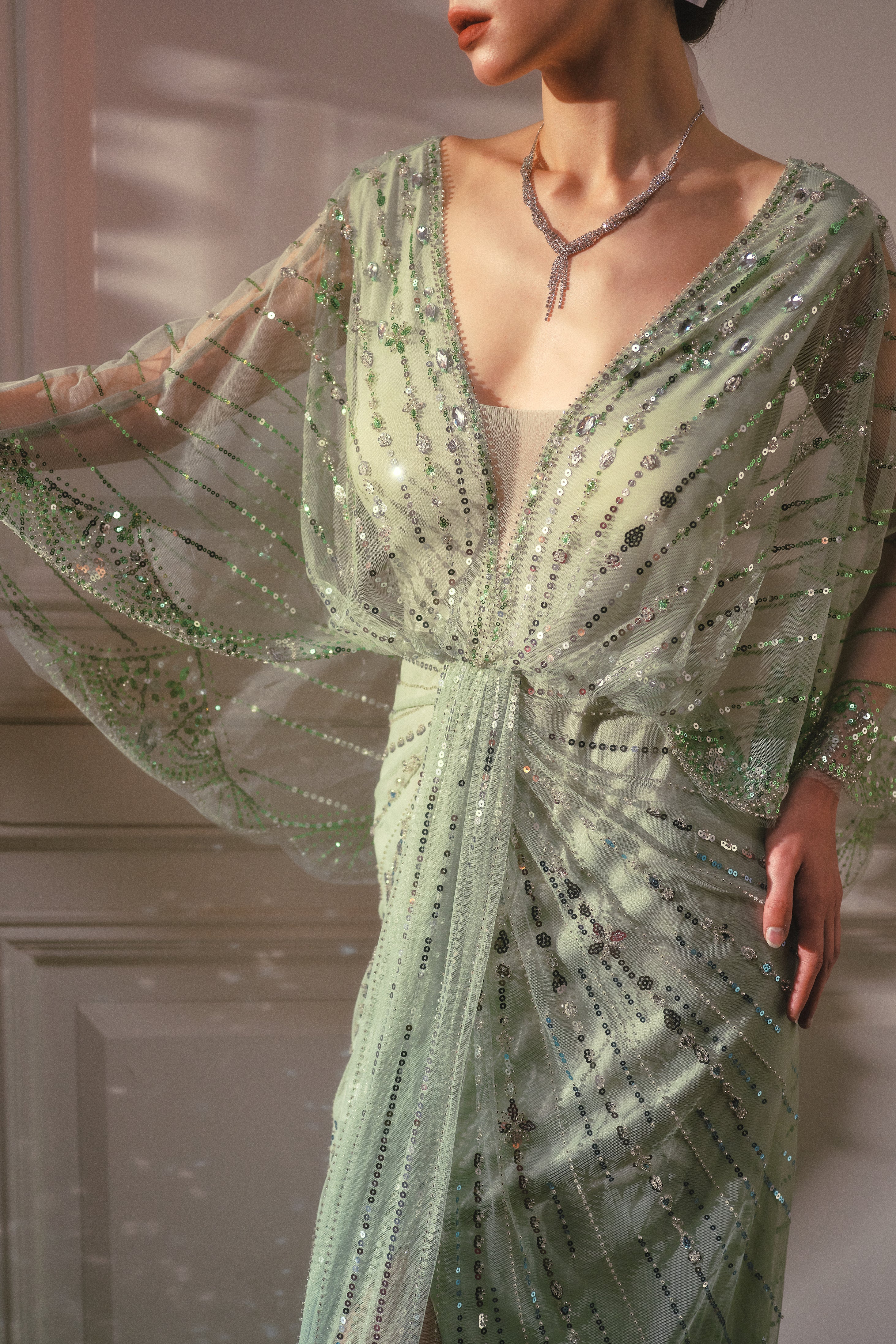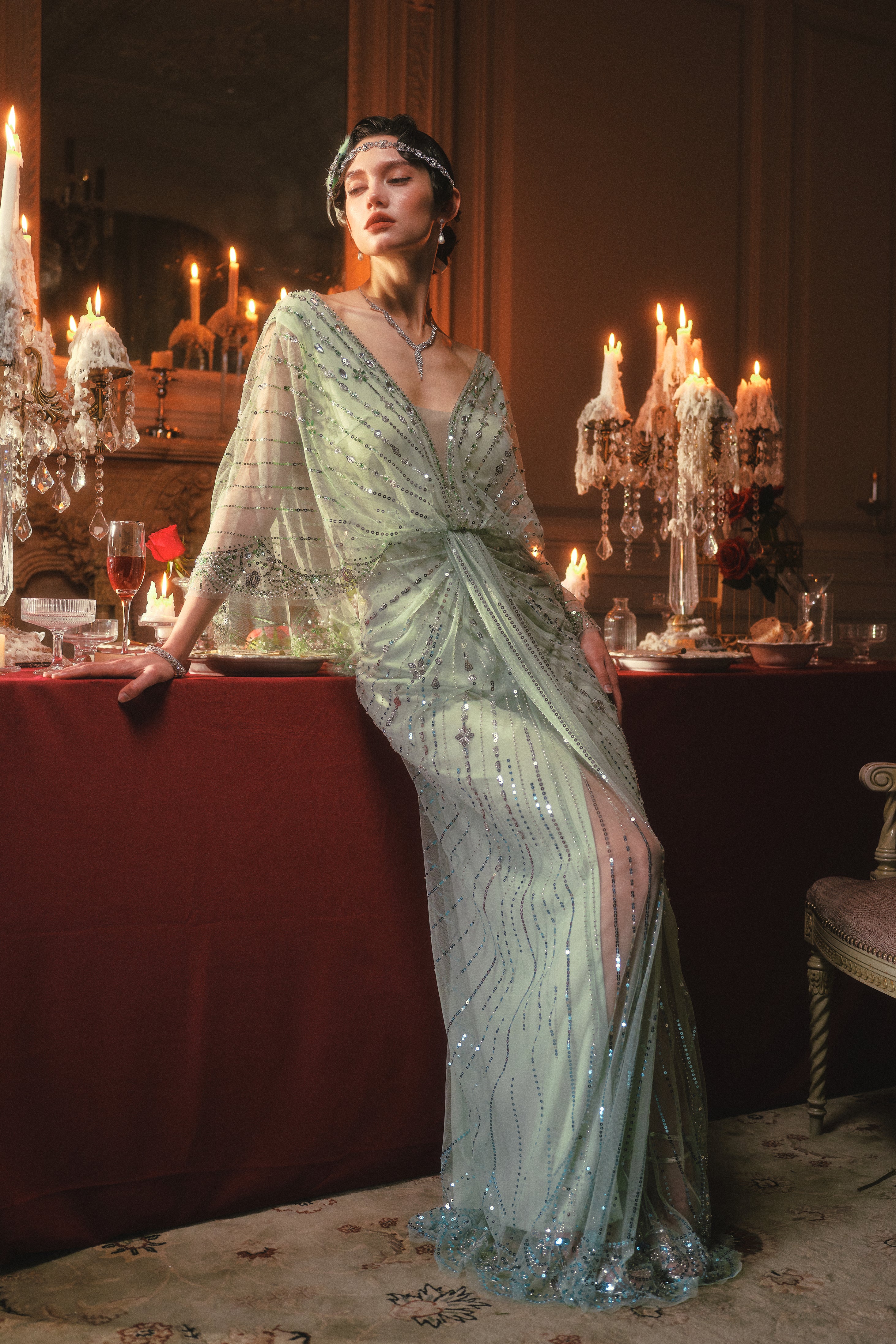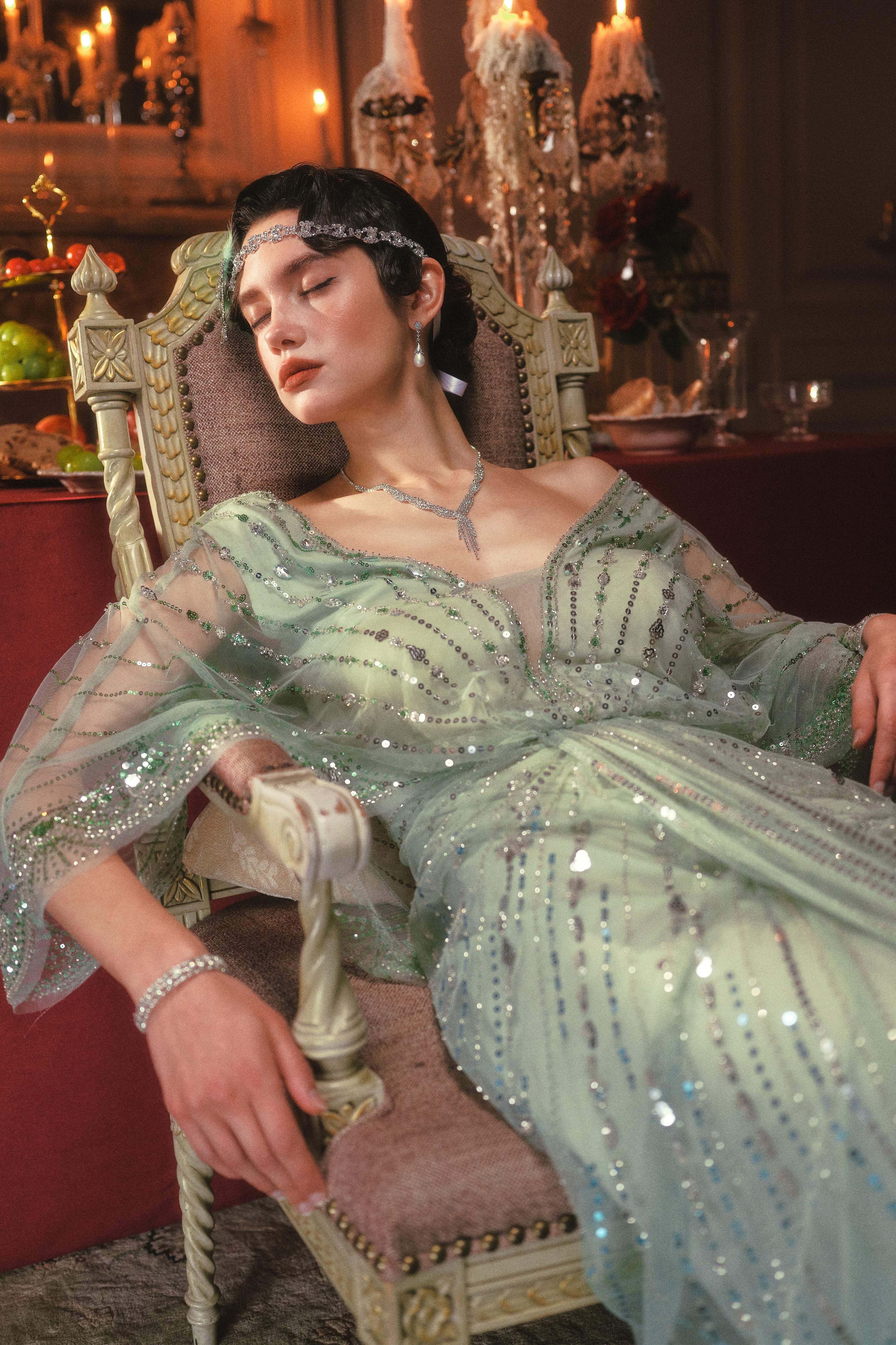 She glides through the room, the green–blue sequins of her gown catching glimmers from glassware and silver. The back cape floats lightly as she moves, while the petal-shaped sequined hem shifts softly with each step. She pauses near a cluster of friends, curiosity tinged with nervous excitement, a quickening flutter beneath her calm exterior, letting the dress follow her gestures as she adjusts to the rhythm of the evening.