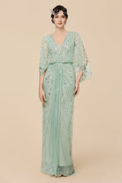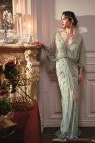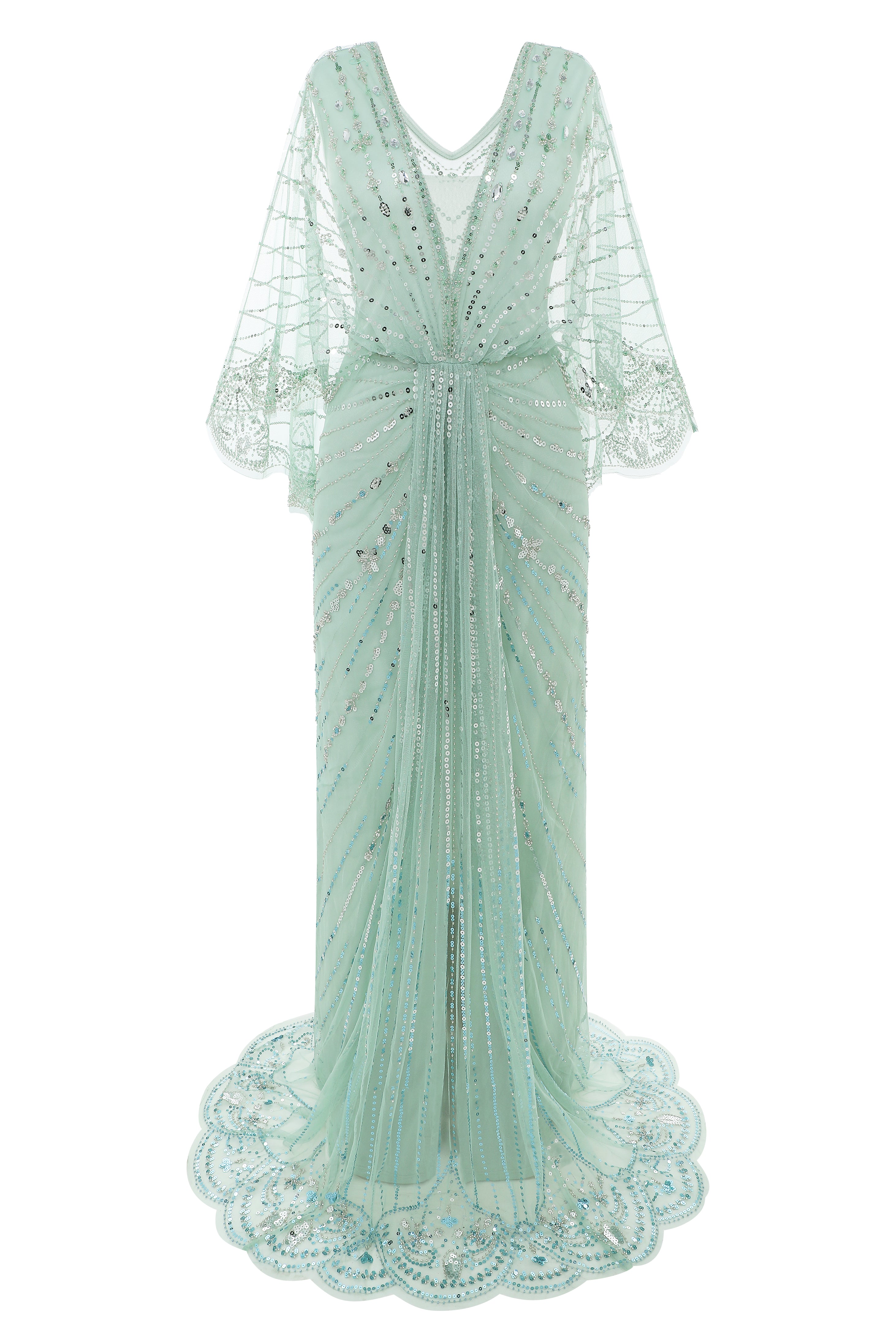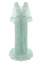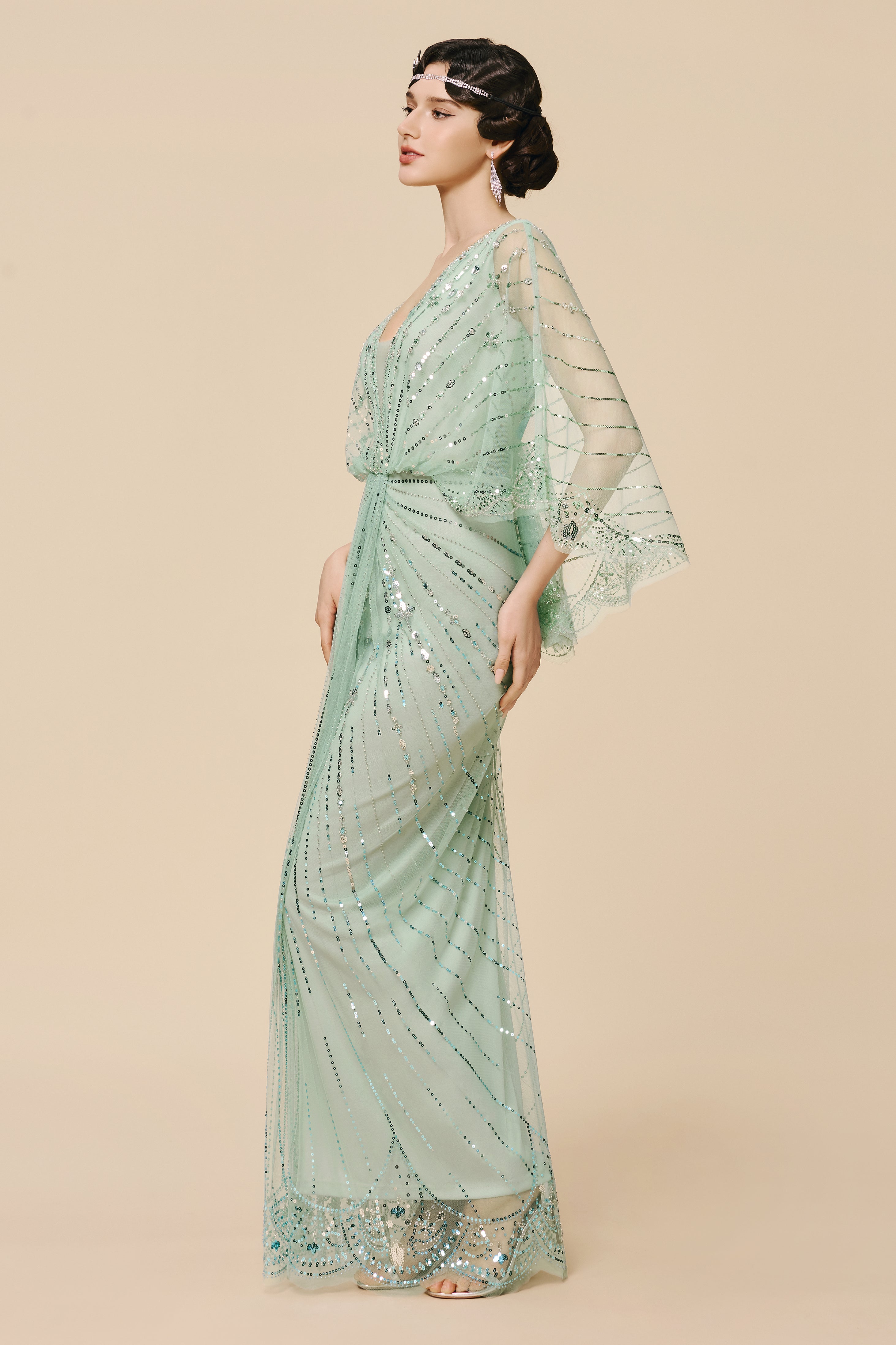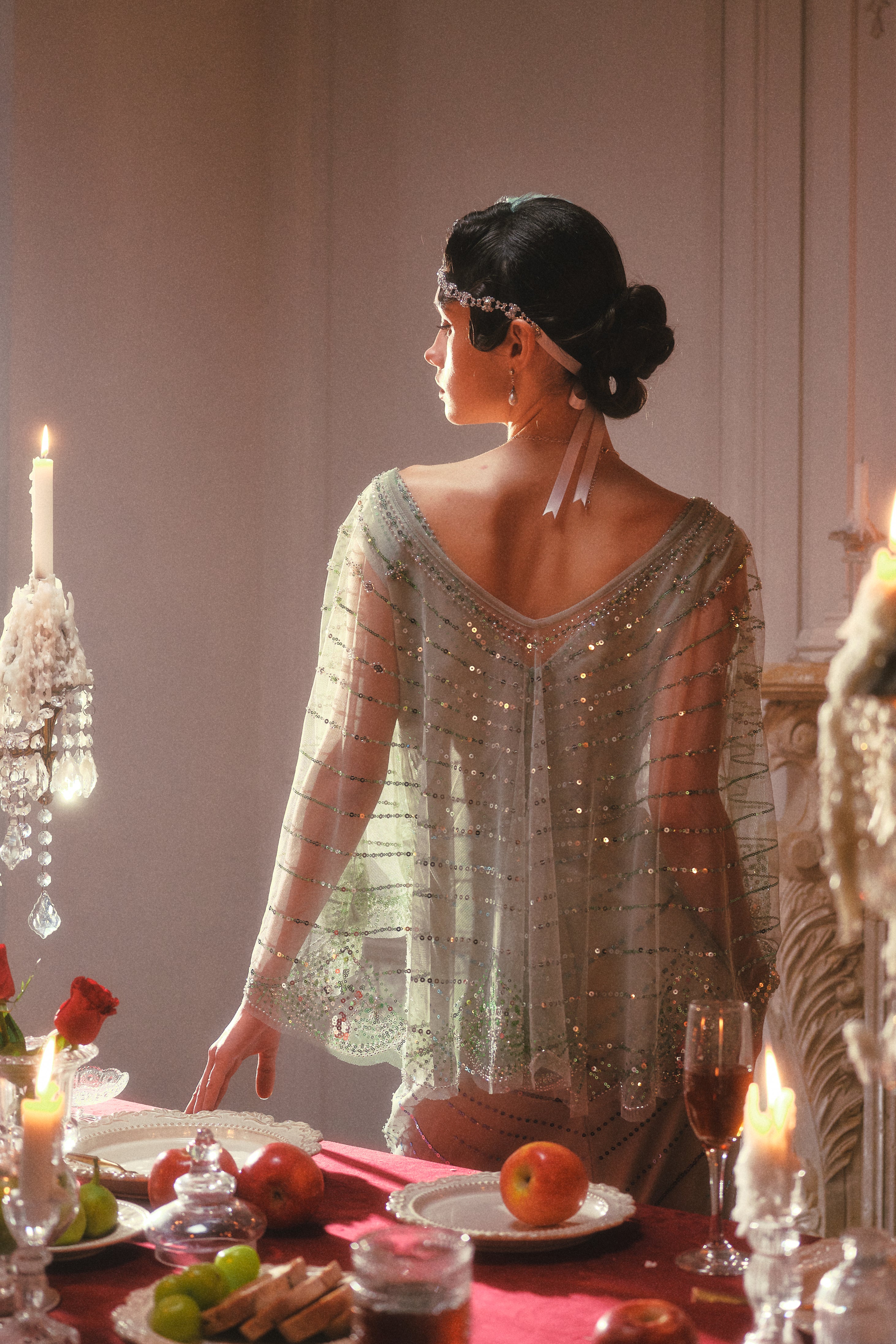 She glides through the room, the green–blue sequins of her gown catching glimmers from glassware and silver. The back cape floats lightly as she moves, while the petal-shaped sequined hem shifts softly with each step. She pauses near a cluster of friends, curiosity tinged with nervous excitement, a quickening flutter beneath her calm exterior, letting the dress follow her gestures as she adjusts to the rhythm of the evening.