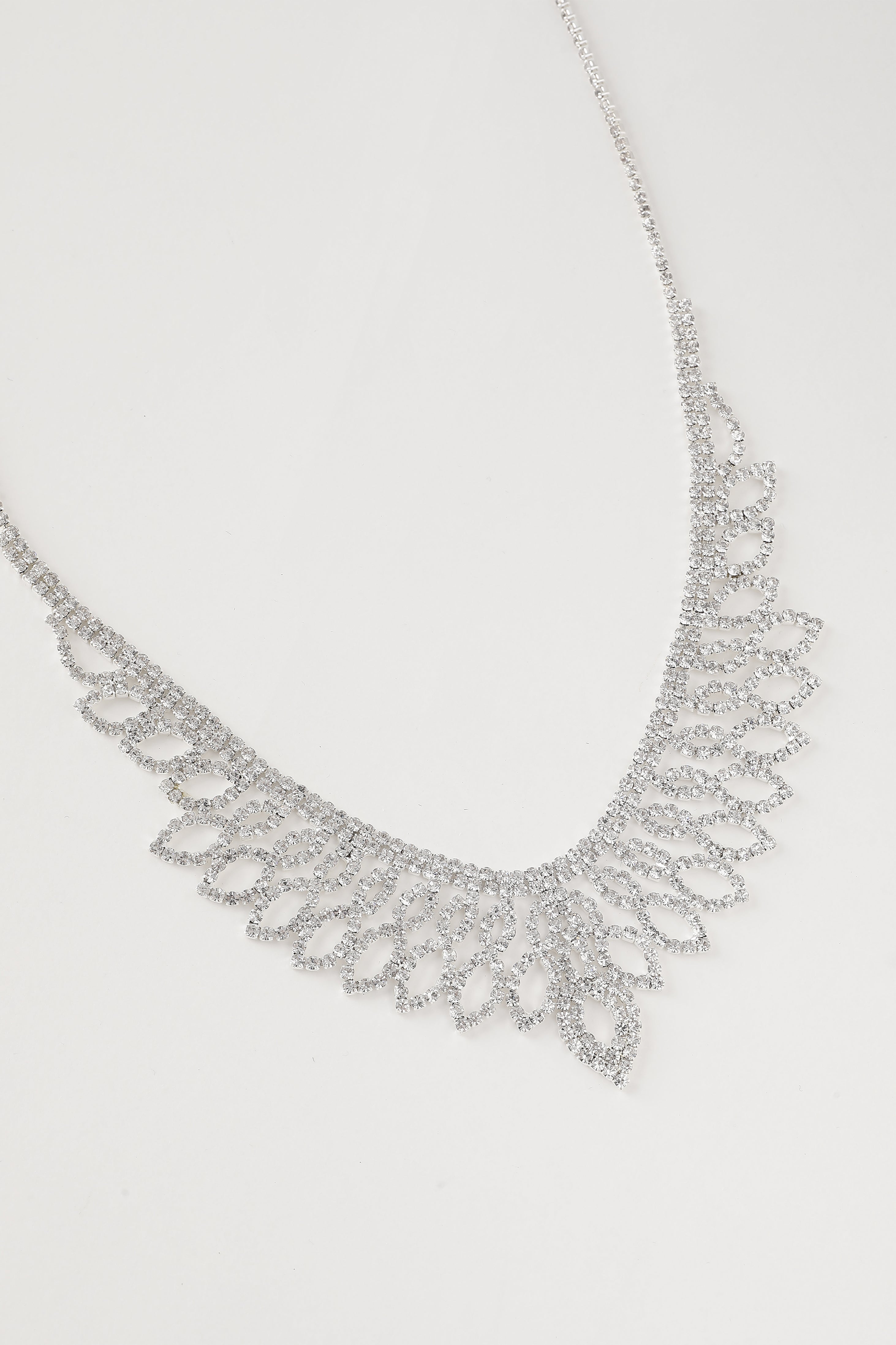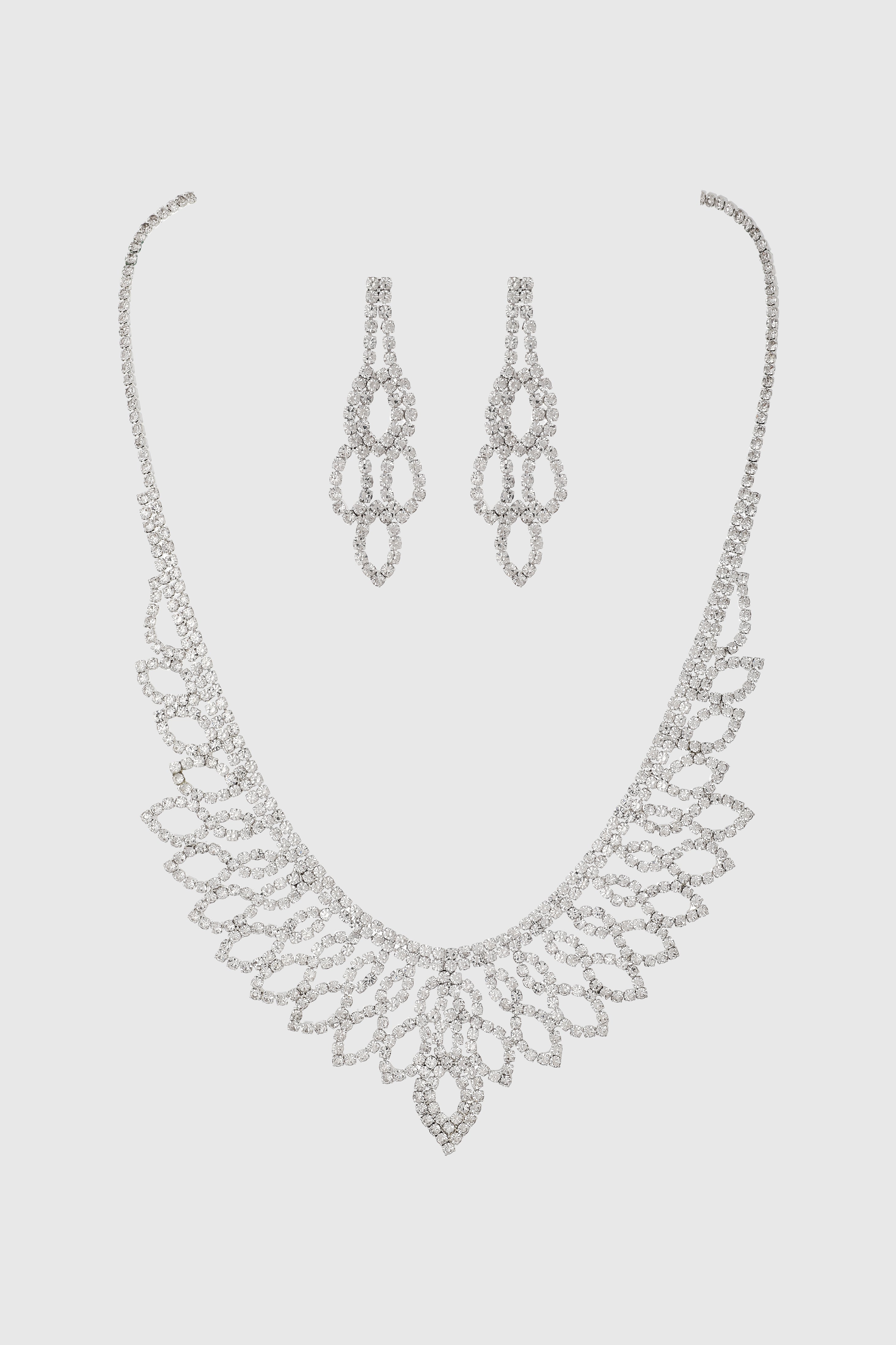 Featuring a dramatic crystal bib necklace and matching teardrop earrings, this set delivers pure sparkle and sculptural elegance. Perfect for weddings, galas, or any evening that calls for a touch of brilliance.