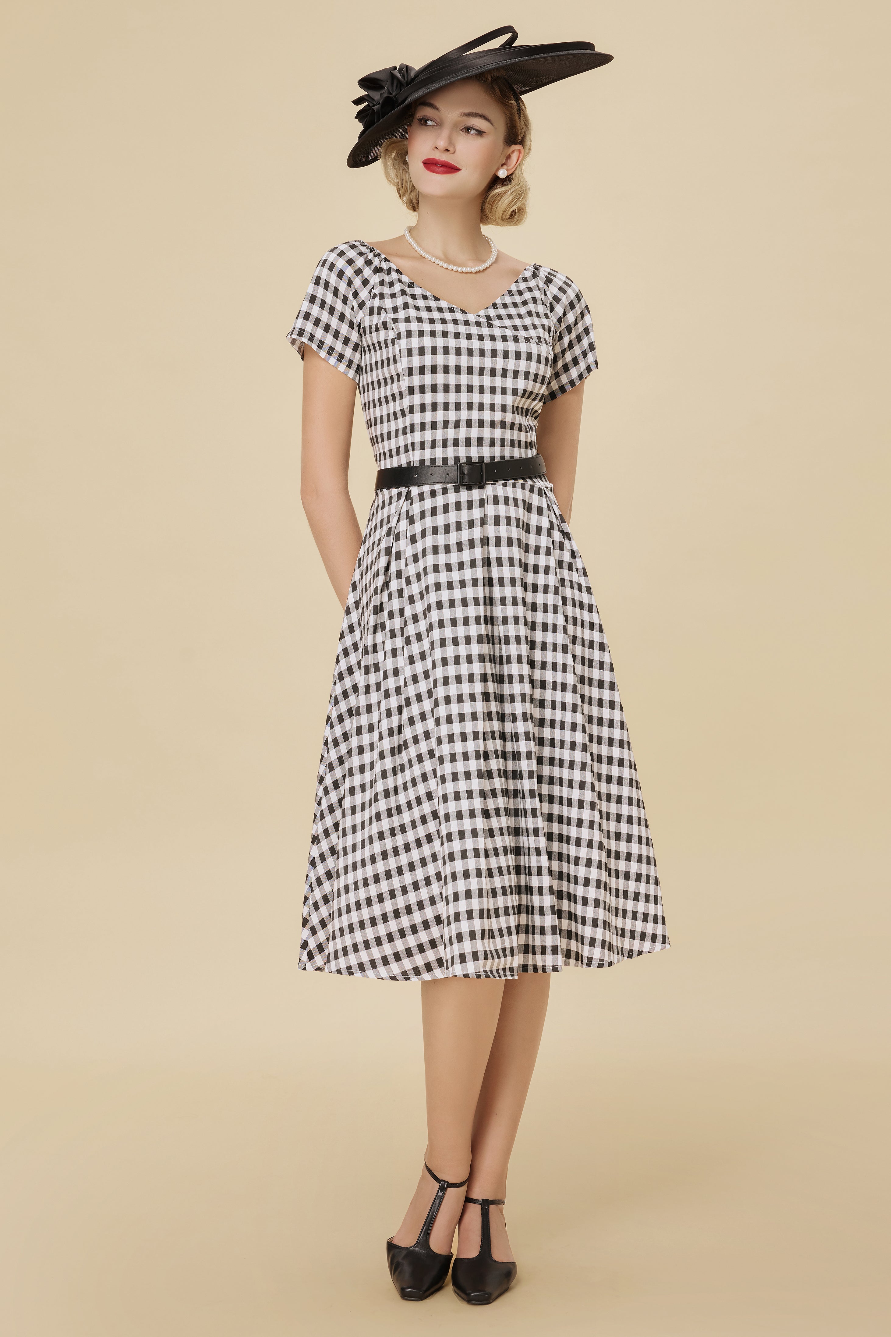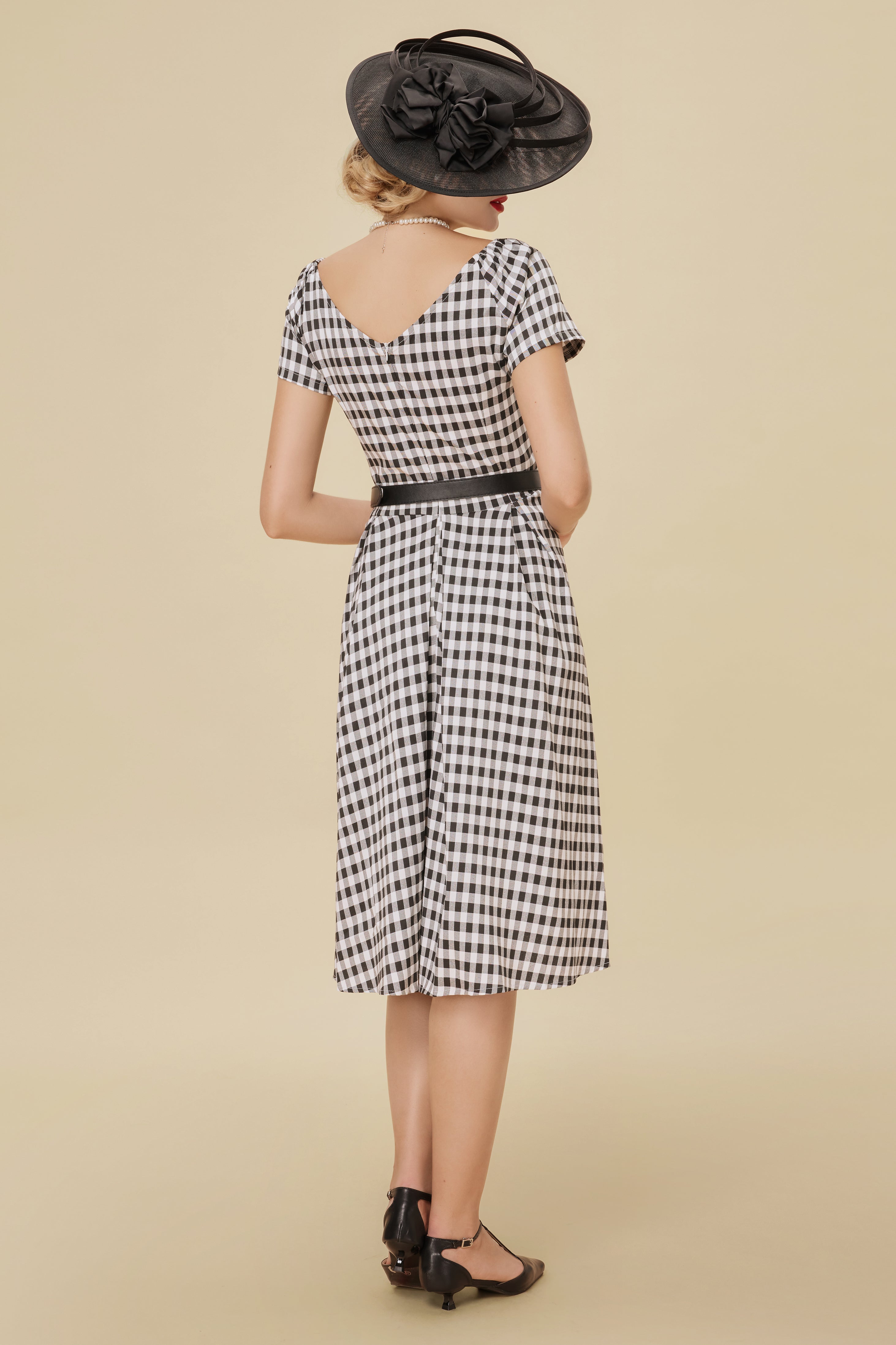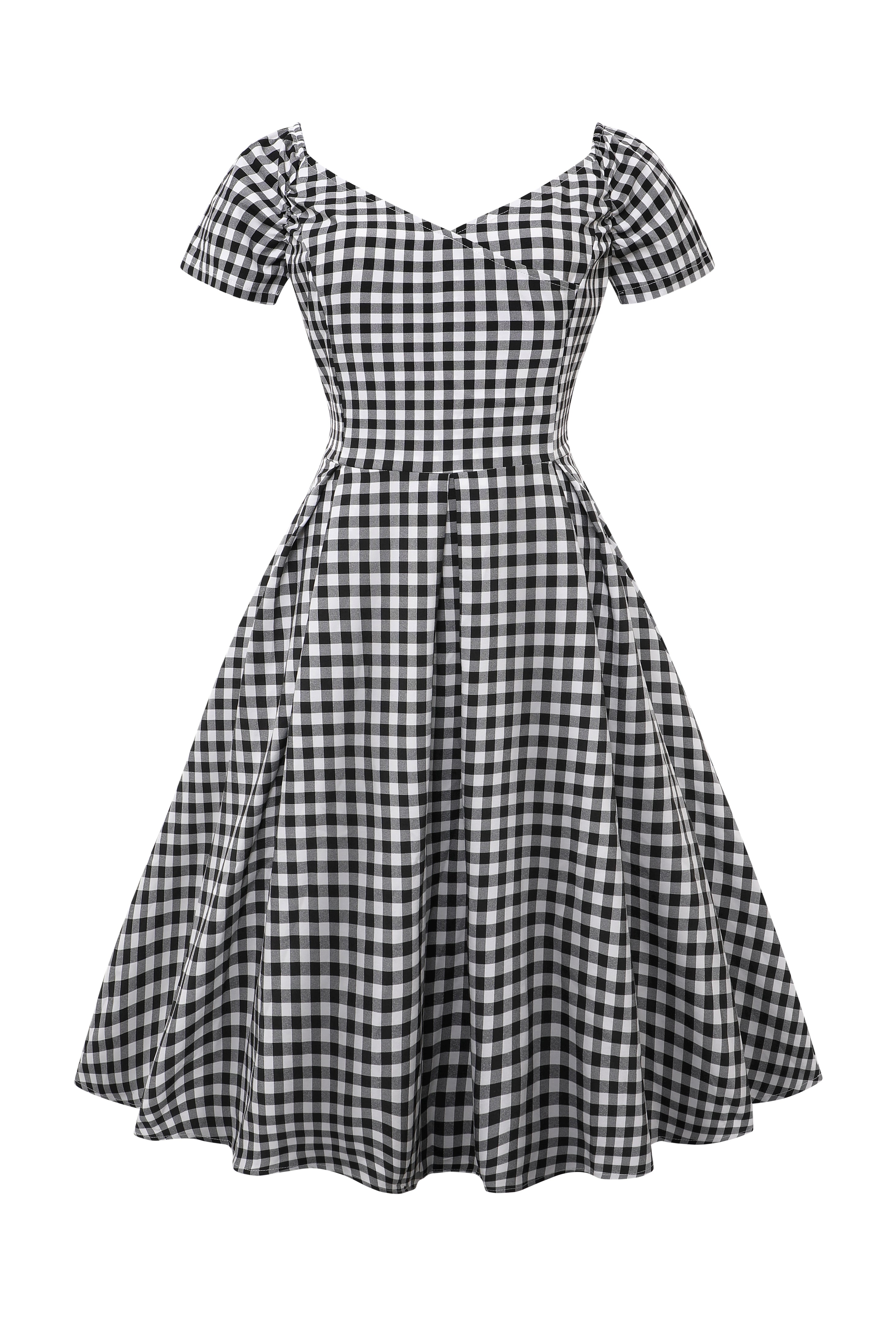 A timeless black-and-white gingham swing dress featuring a versatile V-neckline with a convertible shoulder design. The neckline can be styled with sleeves on the shoulders for a neat, structured look, or worn off-the-shoulder to highlight the collarbone and create an open, graceful frame.
