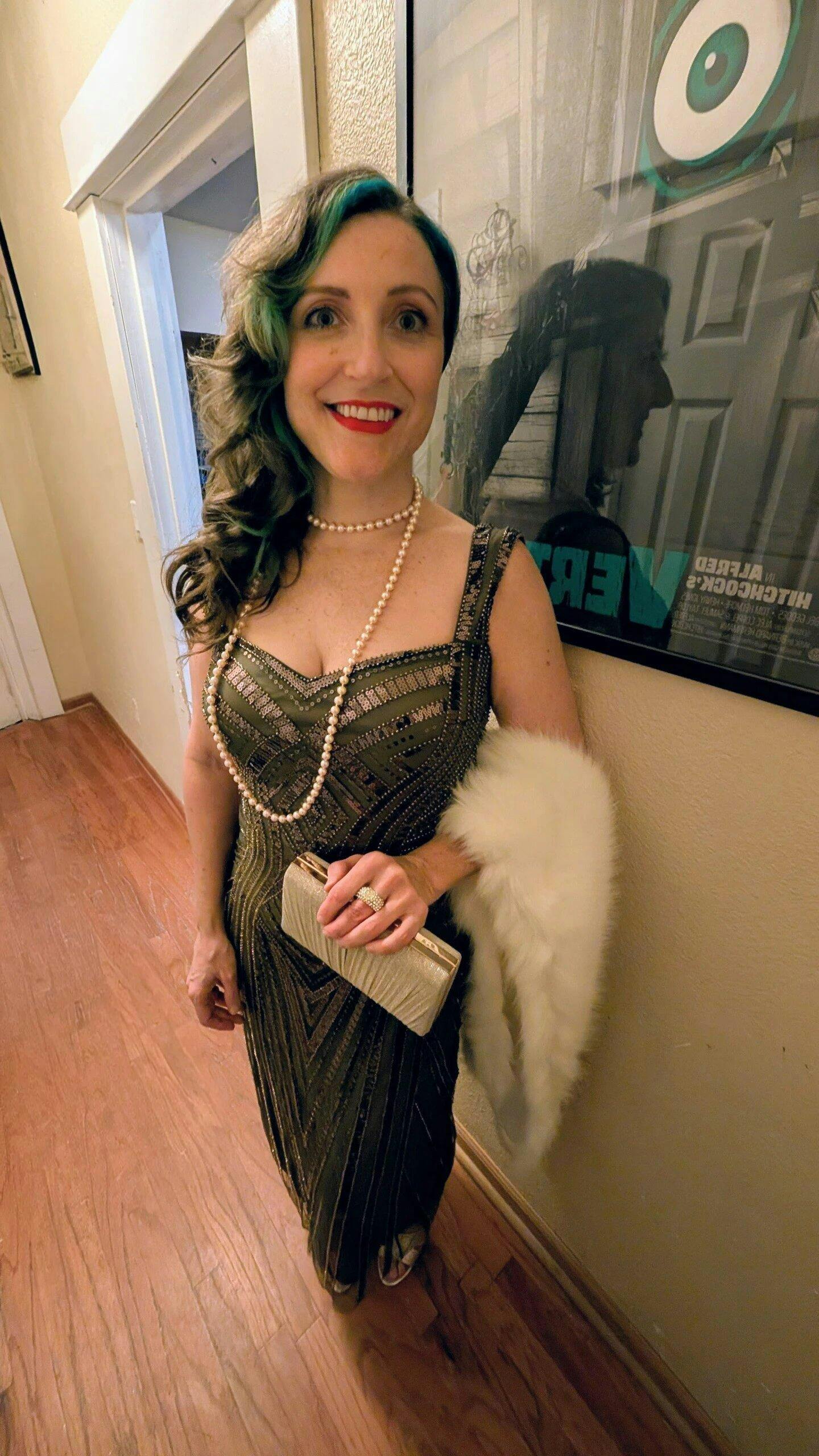 - Figure-contouring Art Deco motifs