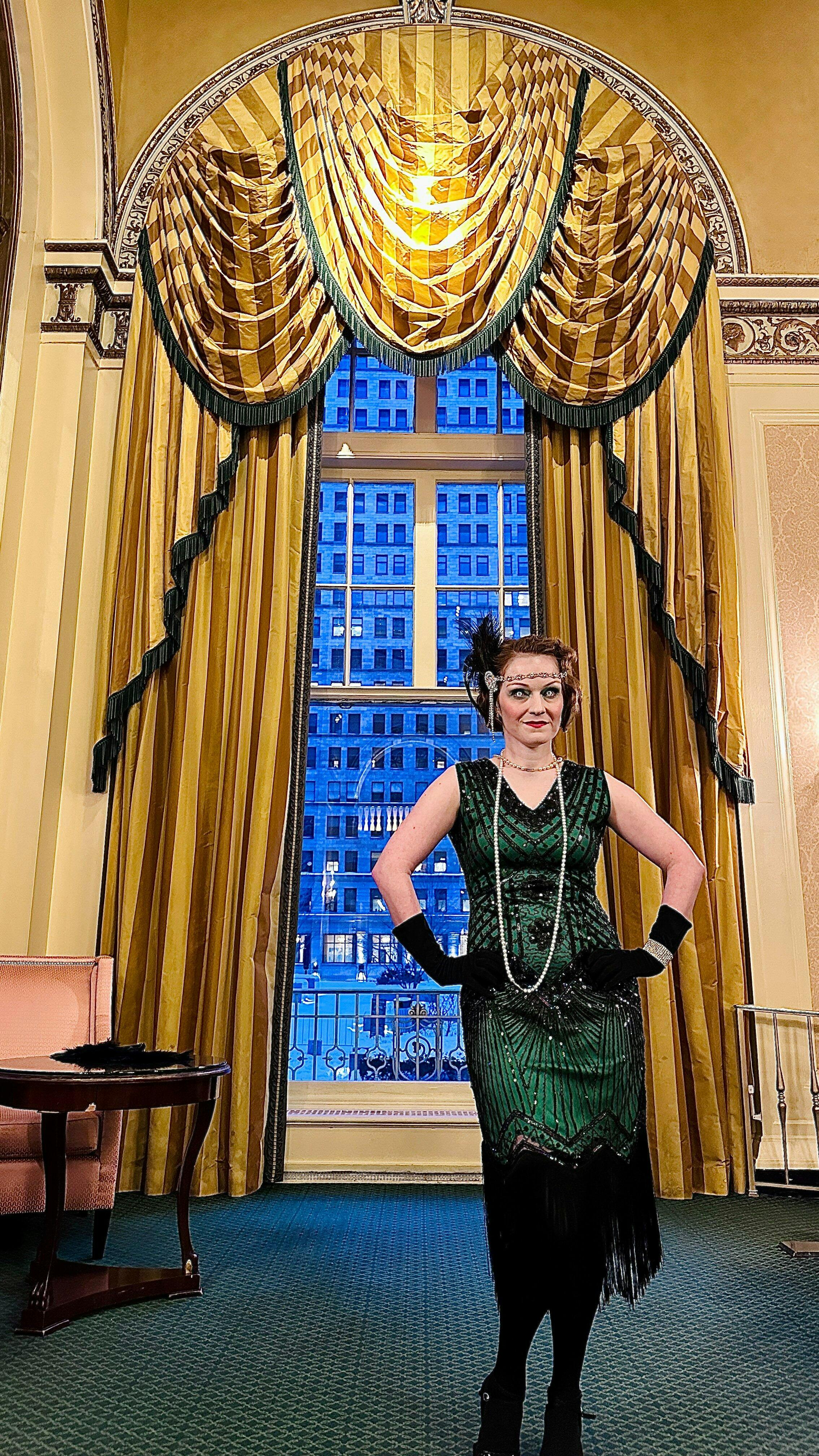 This elegant dress is classic vintage look for a modern woman. The eyecatching design features art deco print and unique vintage style which bring you back to the roaring twenties.