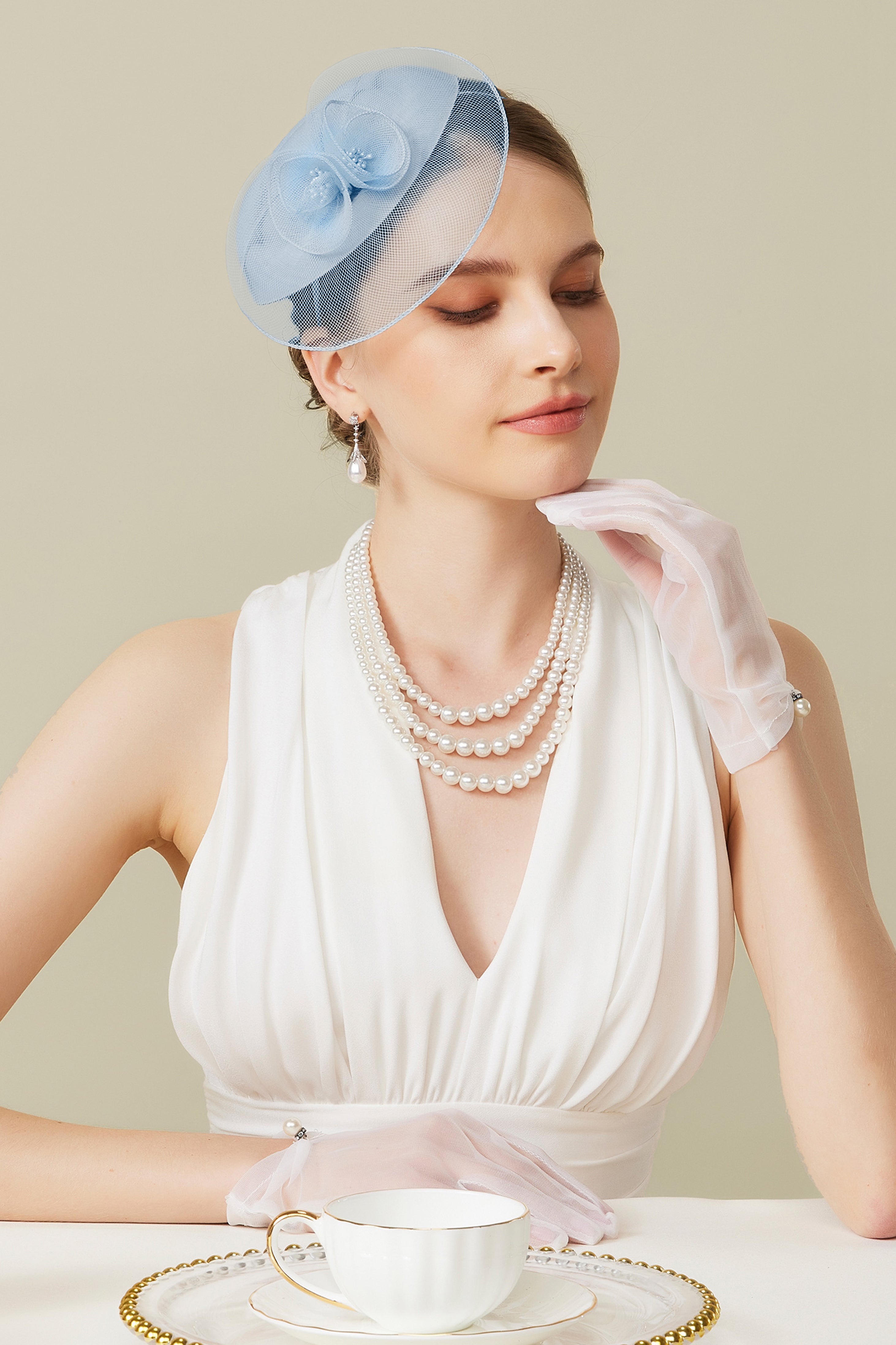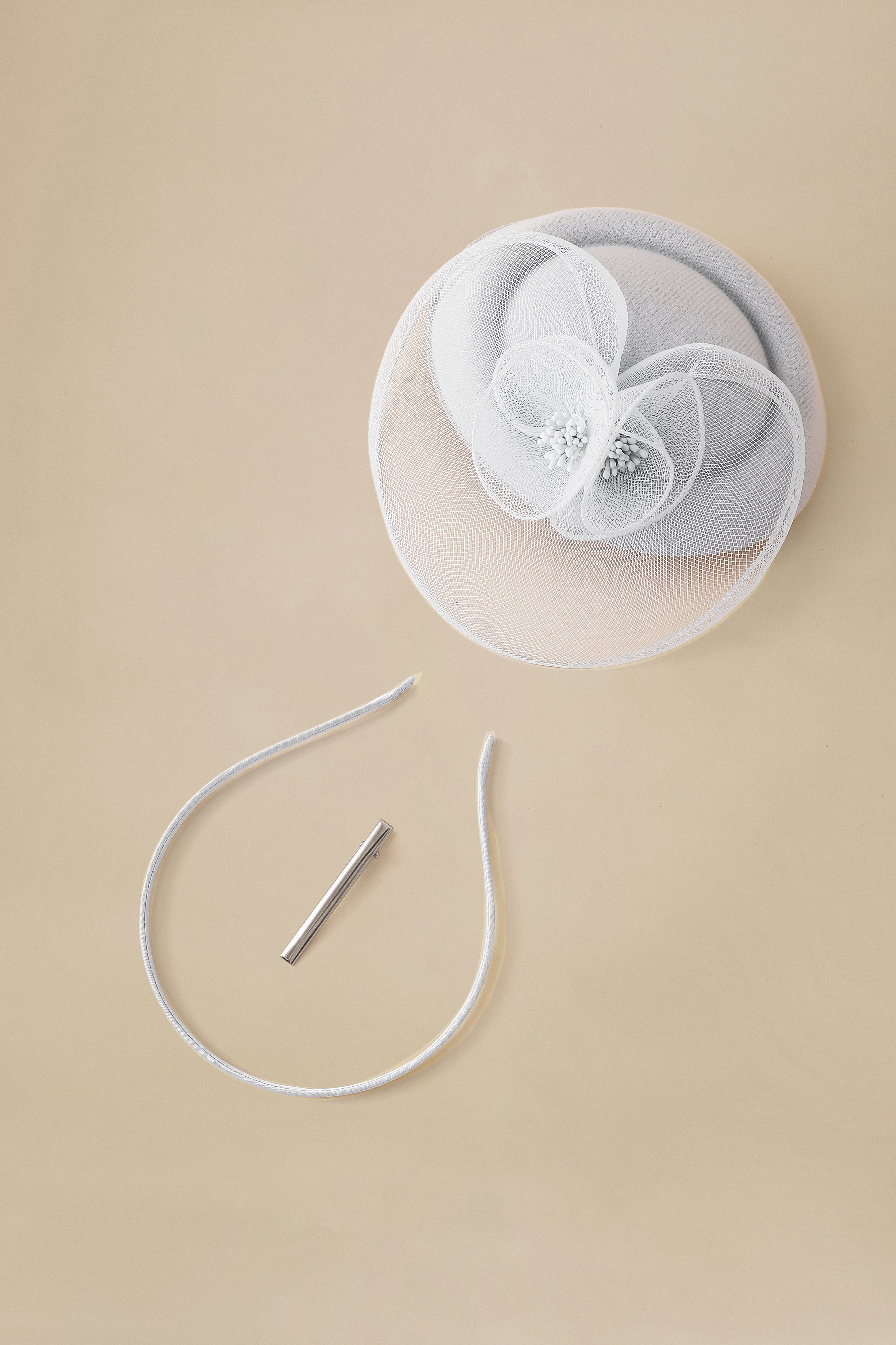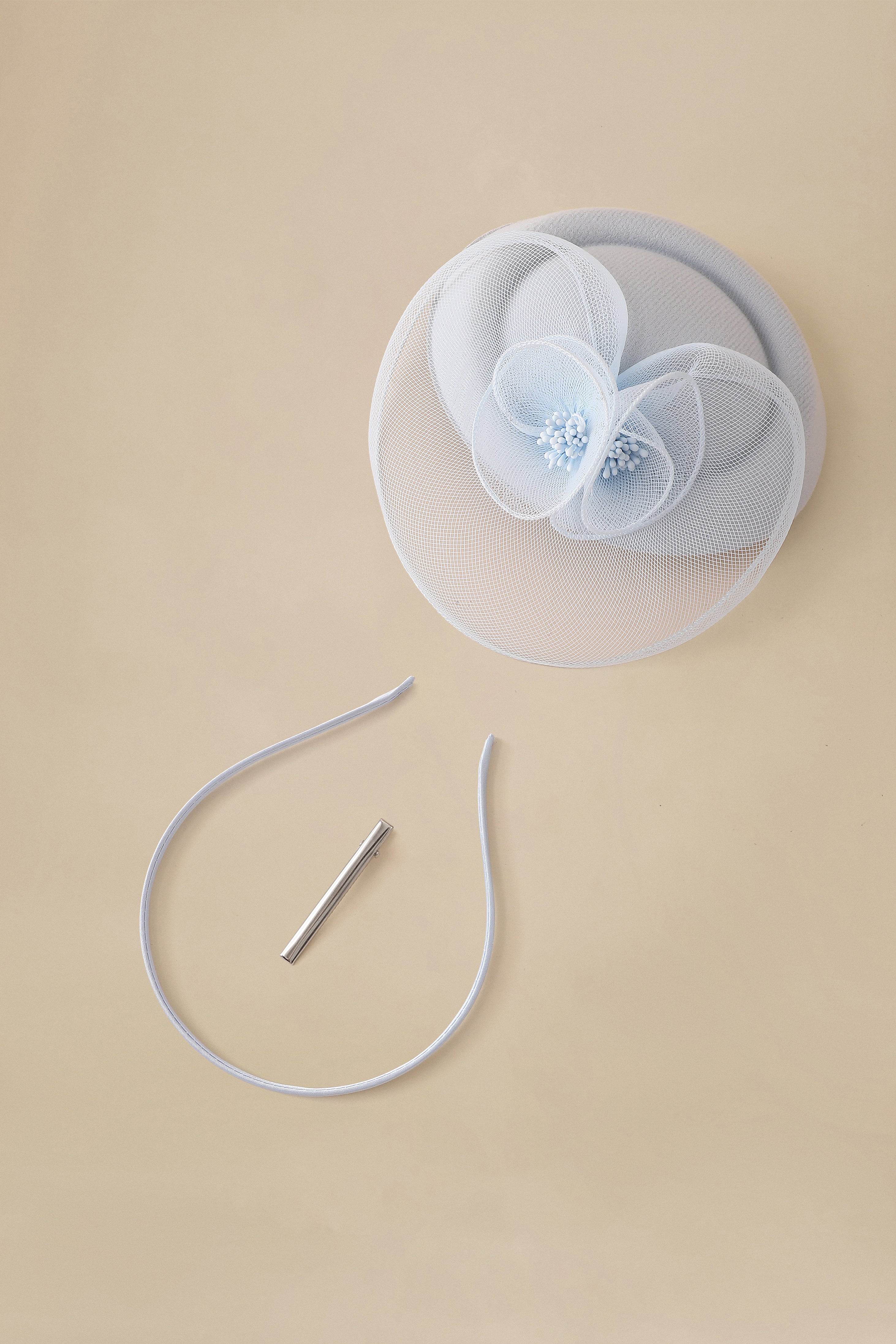 This delicate fascinator features a half-face curved veil and petite floral design with a blooming stamen at the center. Elegant and lightweight.