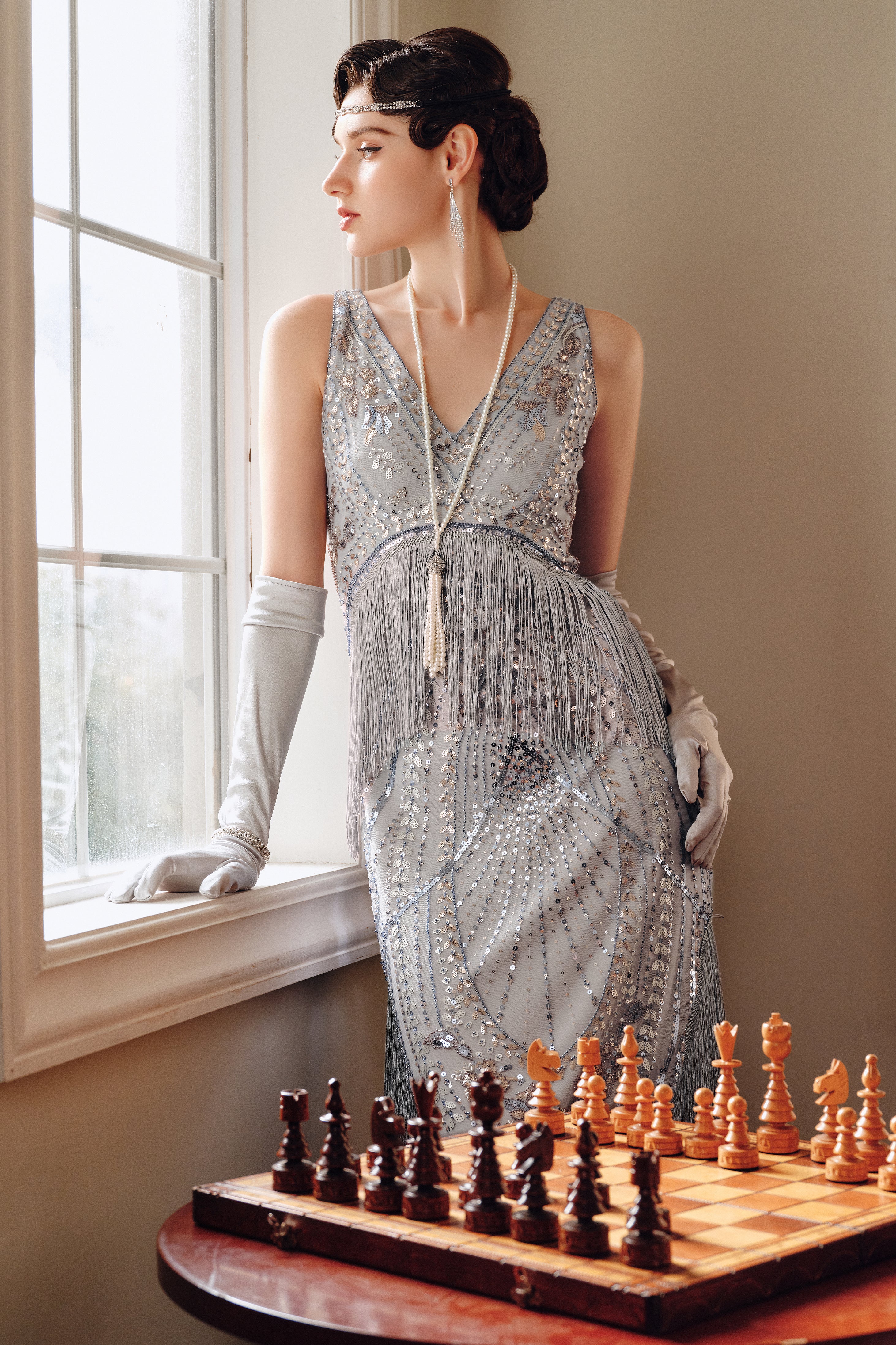 This sumptuous piece of jewelry features a retro-elegant yet slightly modern style that complements the lavish garments, reminiscent of the roaring 1920s.