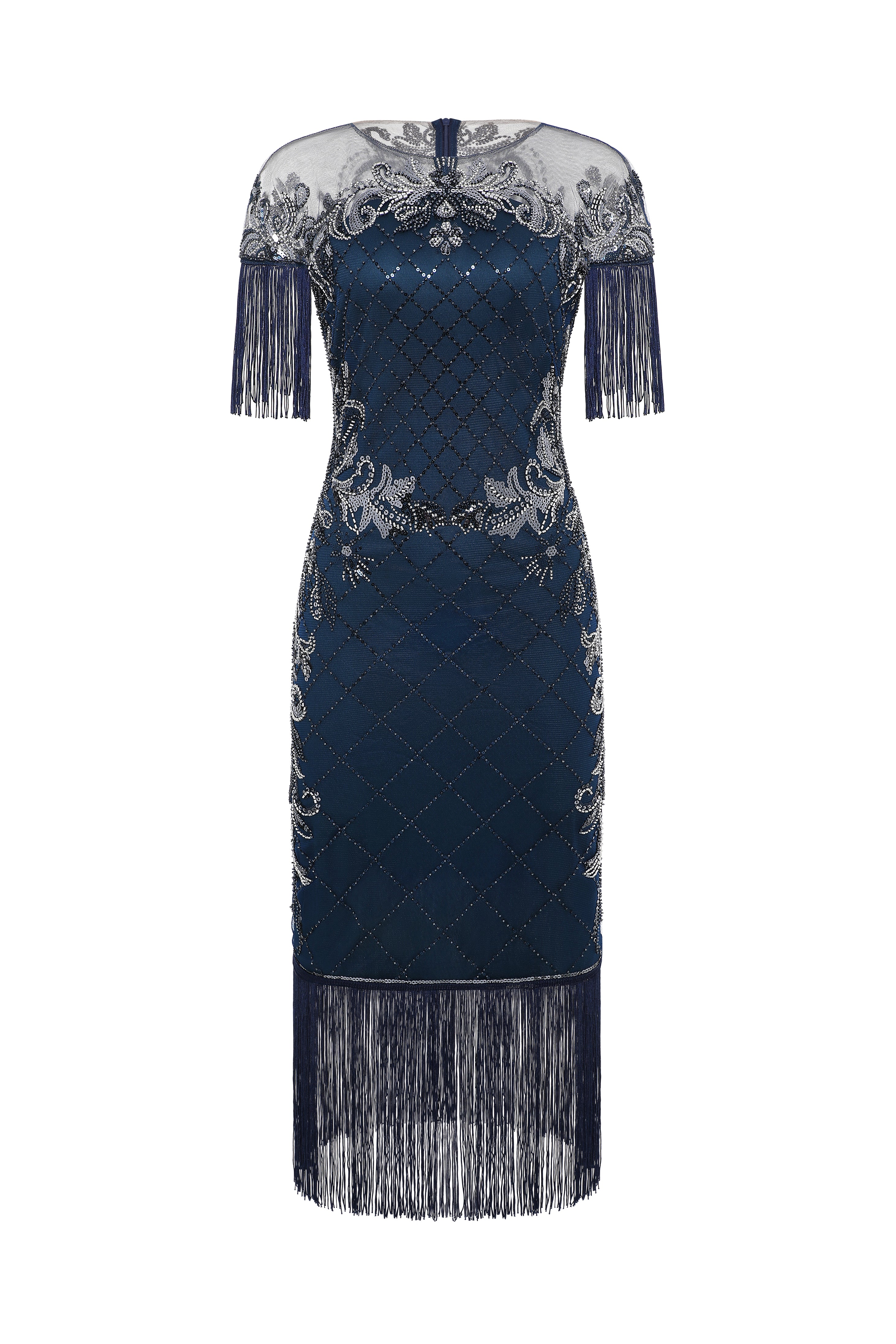 Navy Diamond Beaded Fringe Flapper Dress