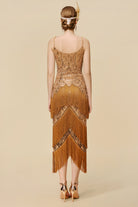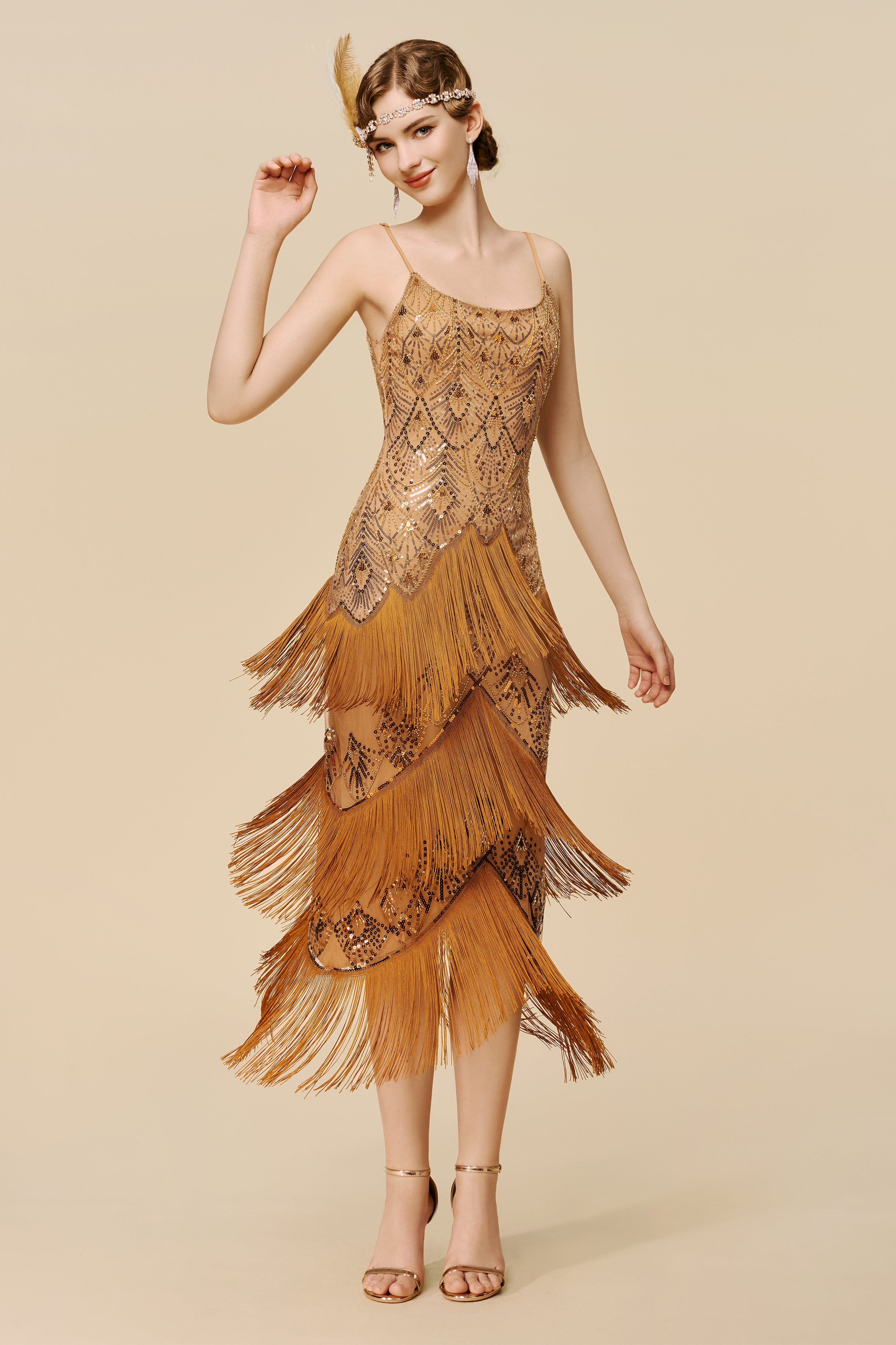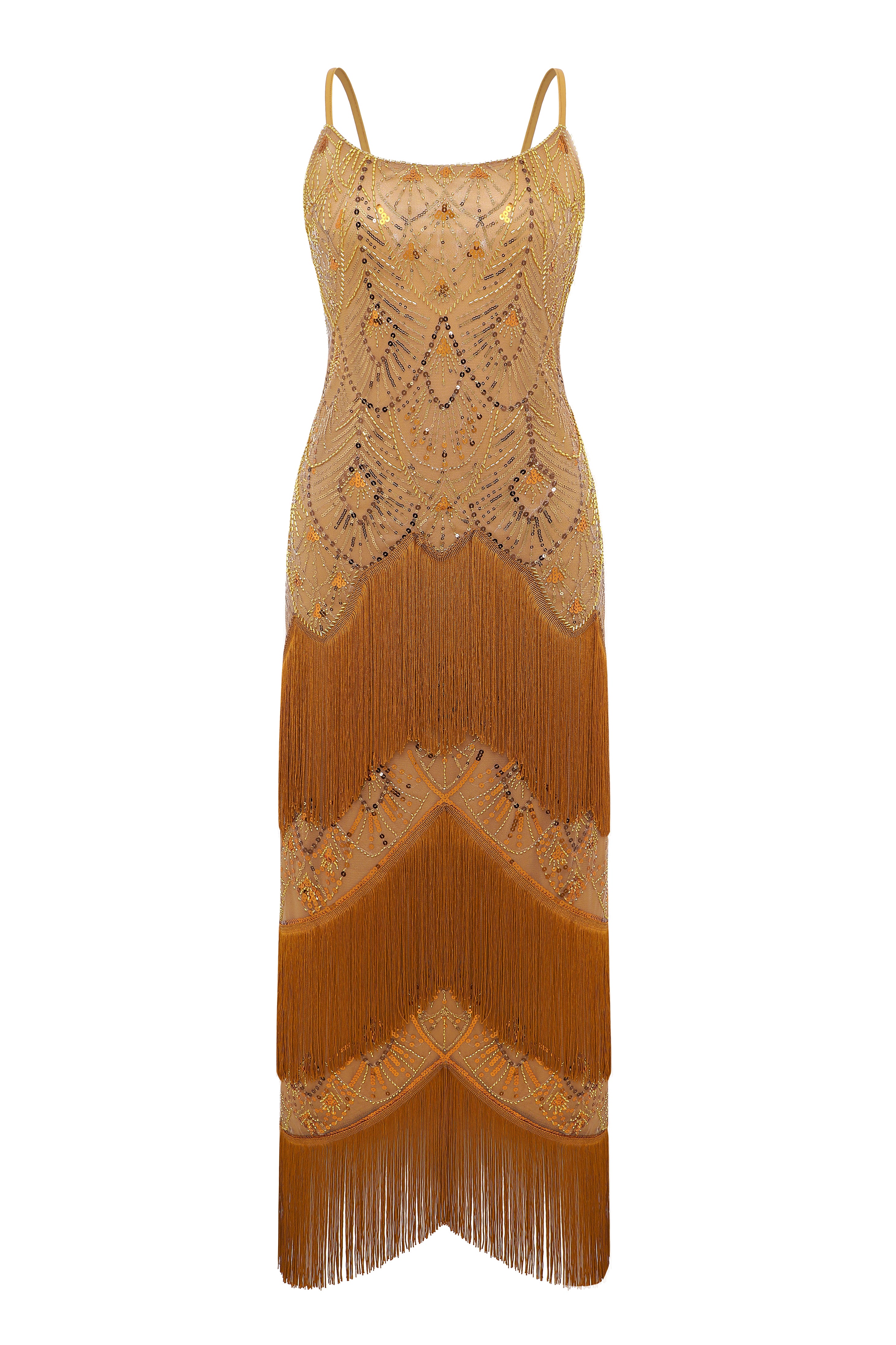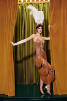 This flapper dress was imagined as a cascade of light in motion. The golden sequins form scalloped patterns that recall the grandeur of Art Deco theaters, shimmering like stage curtains under the glow. From the waist downward, sharp chevron fringes fall in tiered precision, each layer designed to strike with rhythm and lengthen the form. Instead of drama through color, the power here lies in radiance—an opulent interplay of light, texture, and movement.