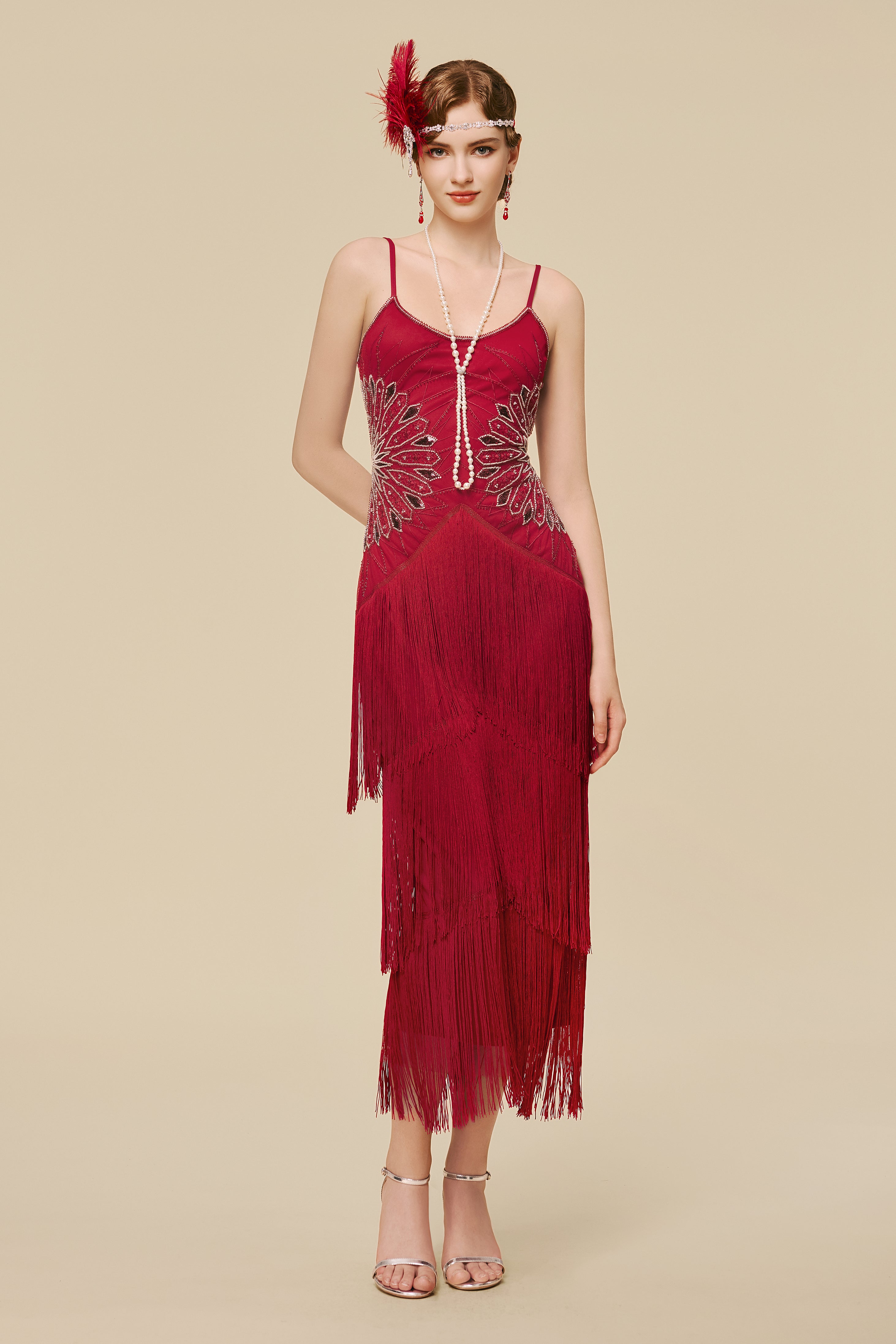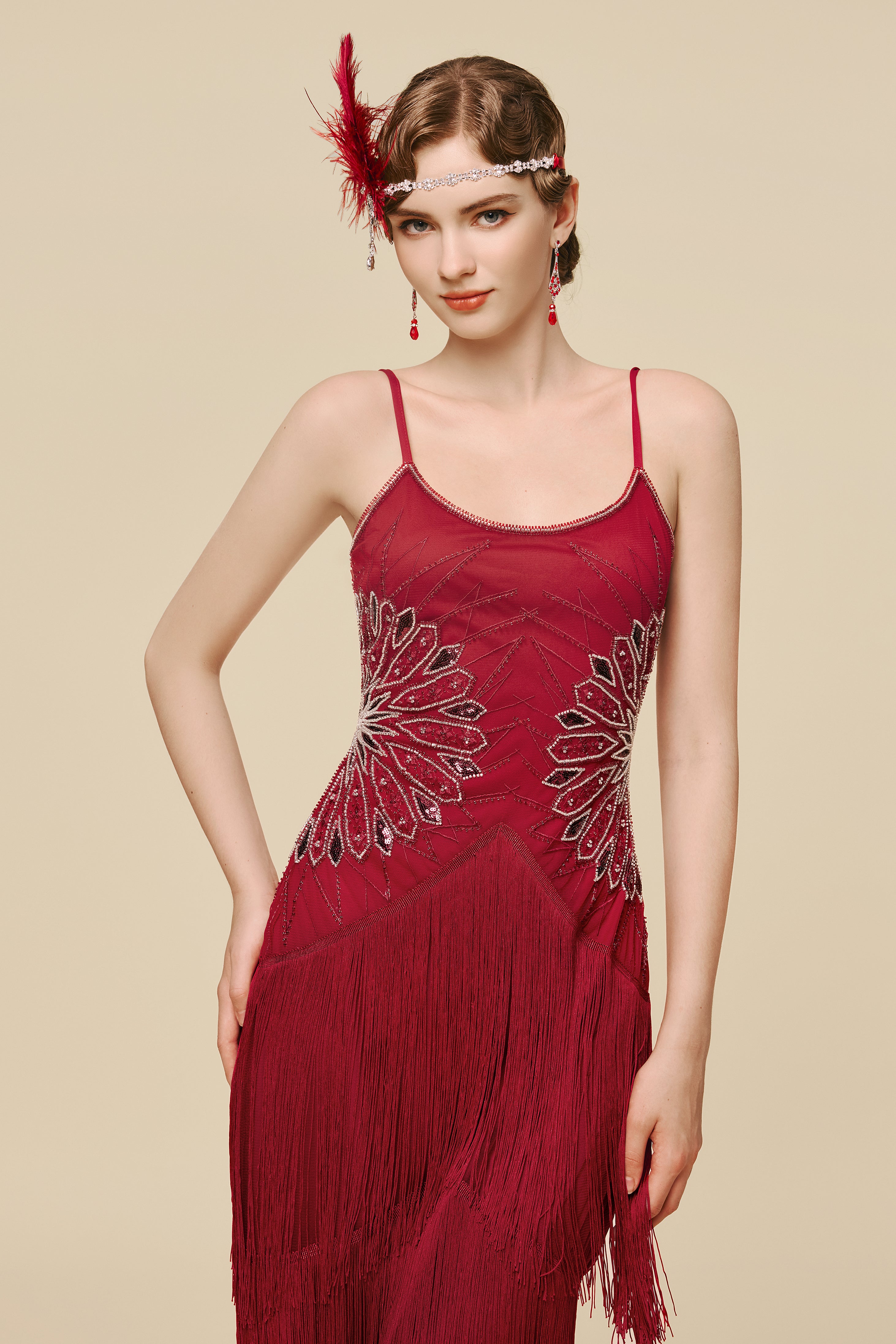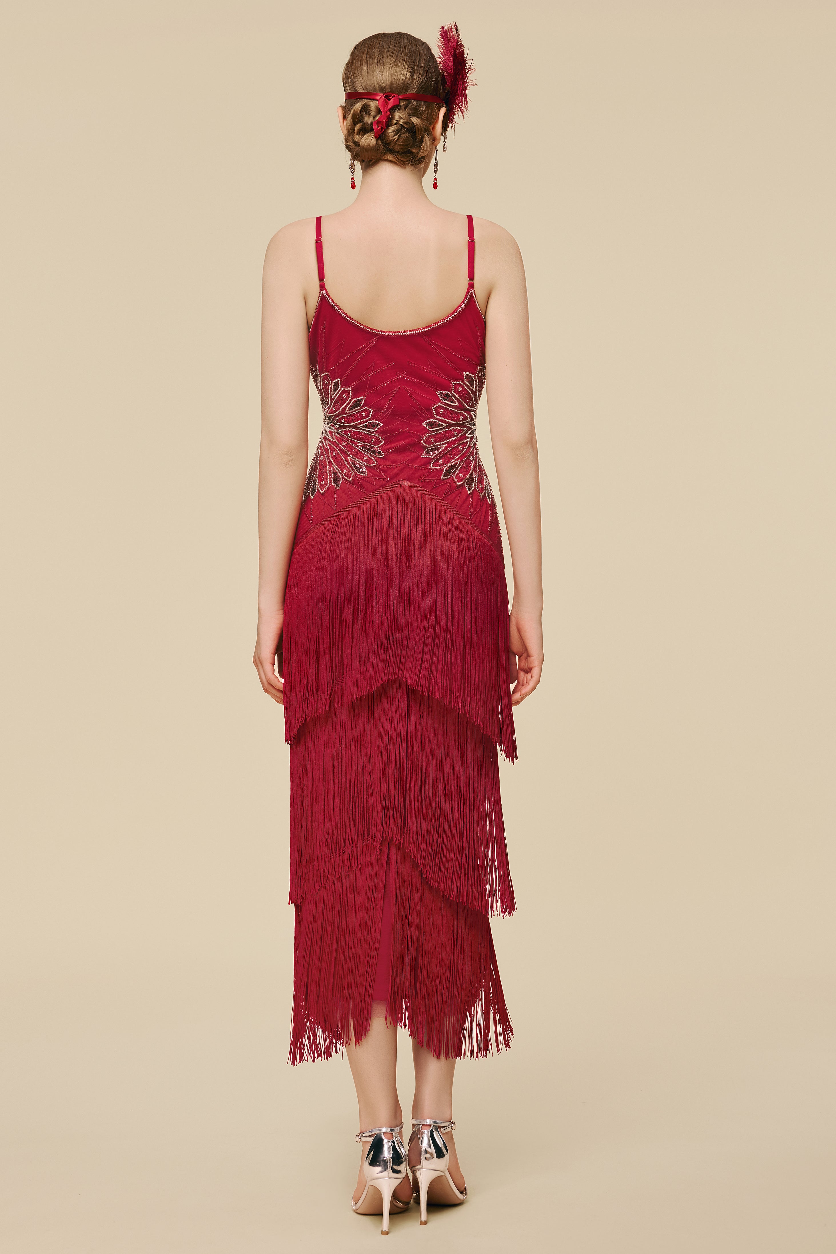 Designed in a sleek, lengthening silhouette, this gown frames the body with shimmering Art Deco fan beadwork that draws the eye to the waist and gently sculpts the figure. Tiered fringe cascades with fluid softness, creating graceful movement from every angle. With its blend of fluid motion and luminous detail, it creates a presence that feels effortlessly captivating the moment you step into the room.