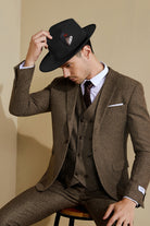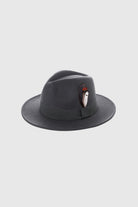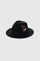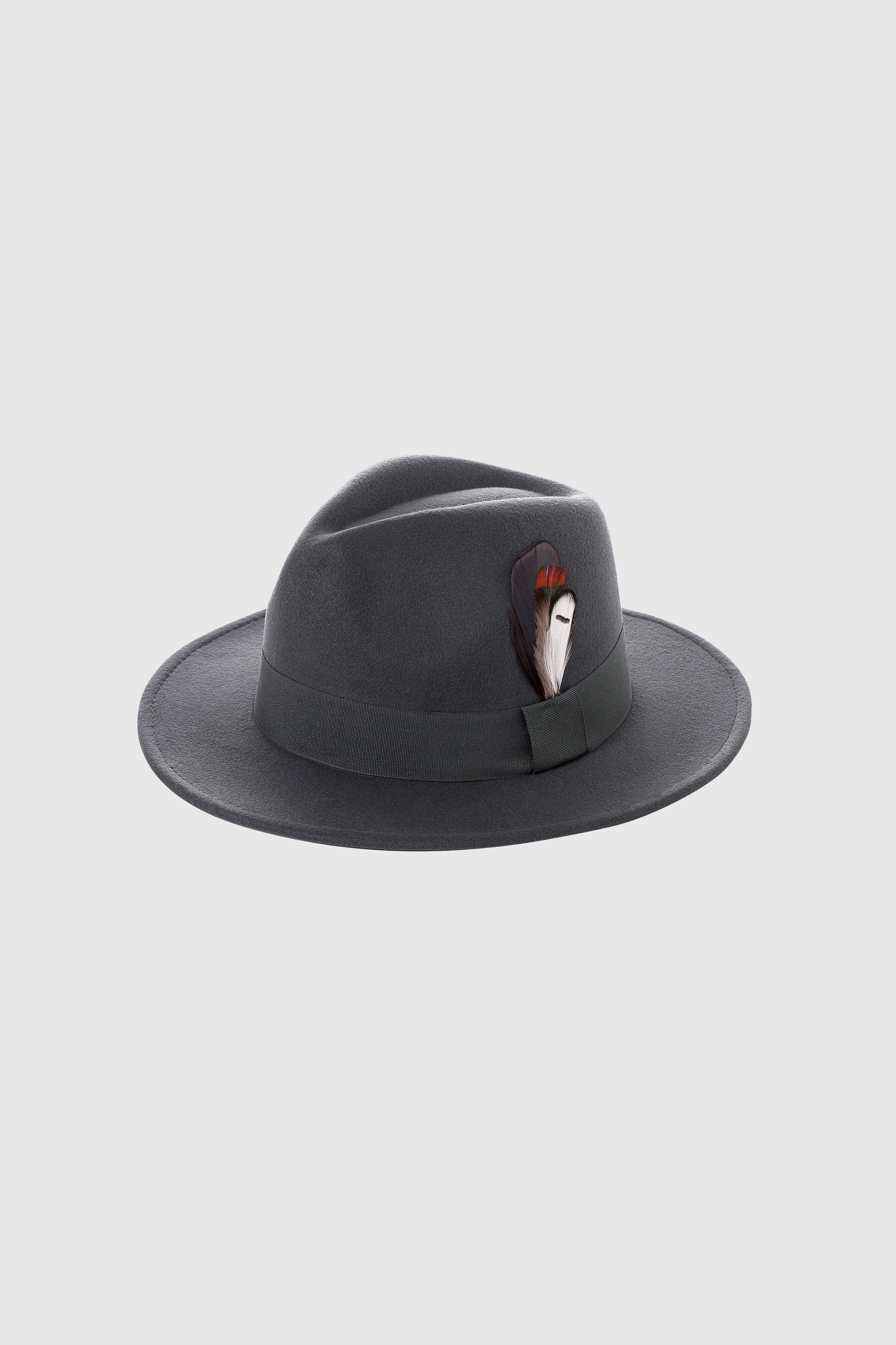 This hat features a structured silhouette crafted from a soft polyester-cotton blend, accented with a smooth grosgrain band and removable layered feathers for a refined, distinctive look.