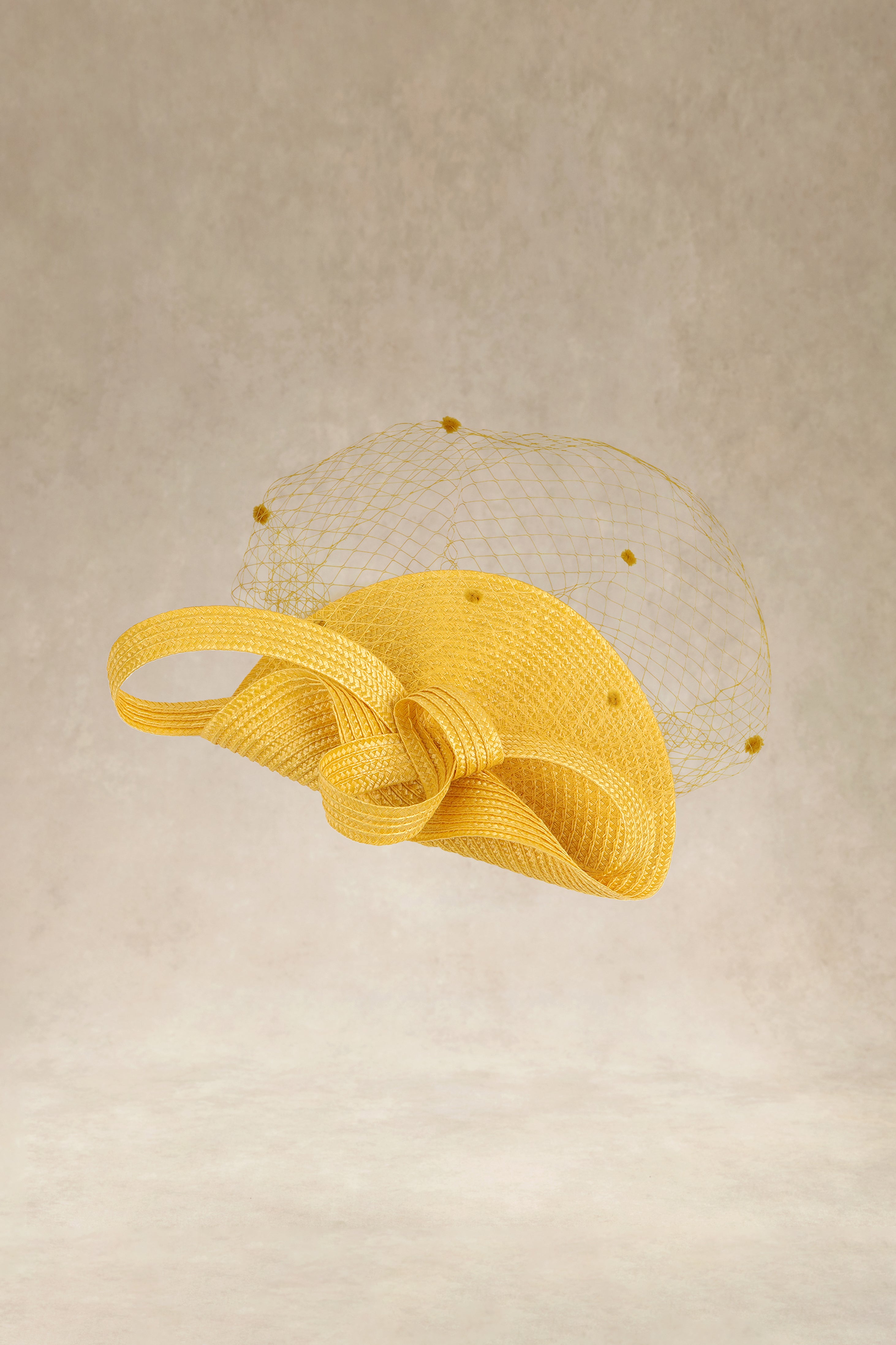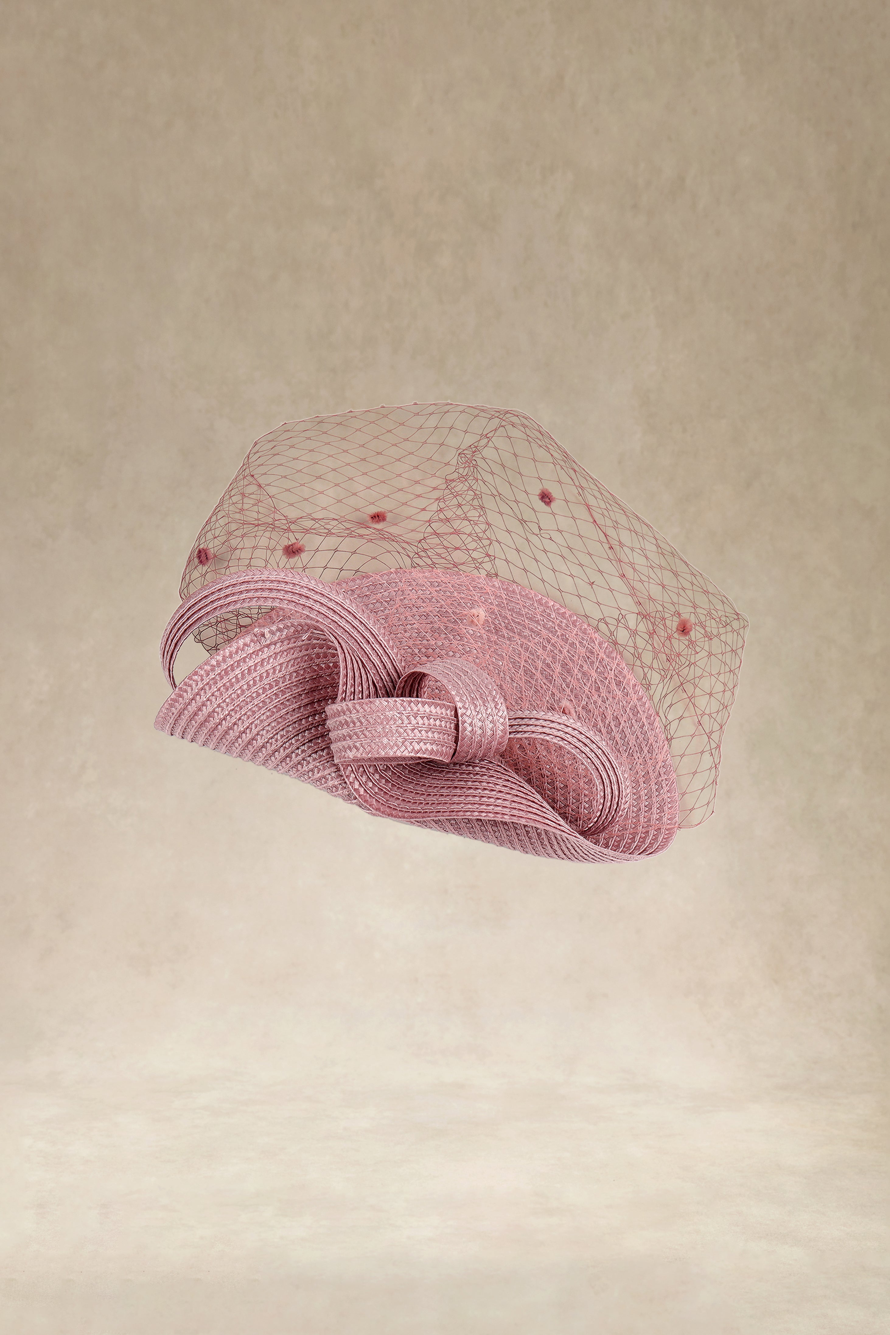 This race day fascinator features a sculpted ribbon design, adorned with a light half veil and delicate fluffy accents, exuding timeless elegance and vintage charm.