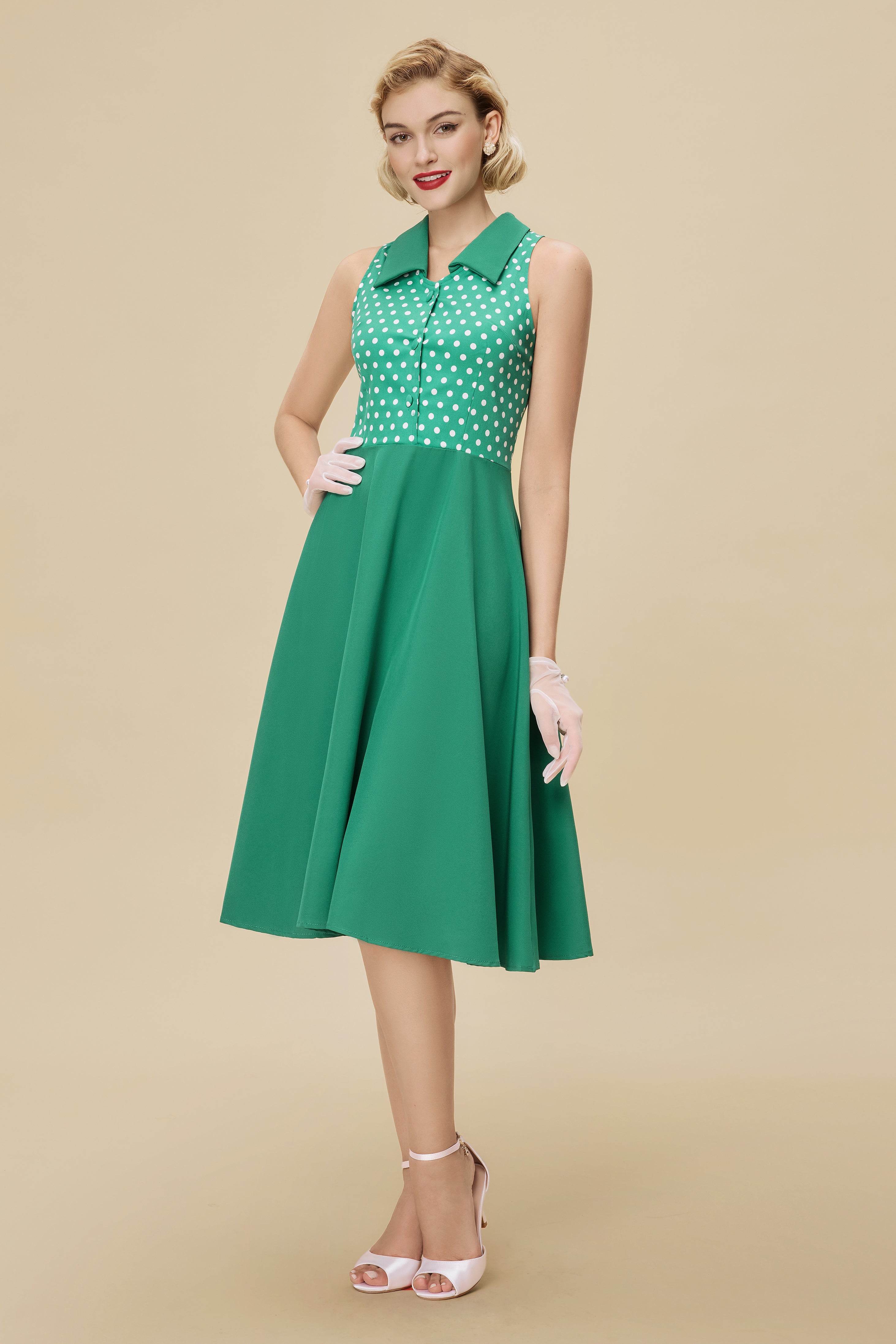 A playful nod to vintage charm, this sleeveless swing dress pairs a lively polka dot bodice with a flowing solid skirt. The wide pointed collar and button-front detail add a touch of retro sophistication.