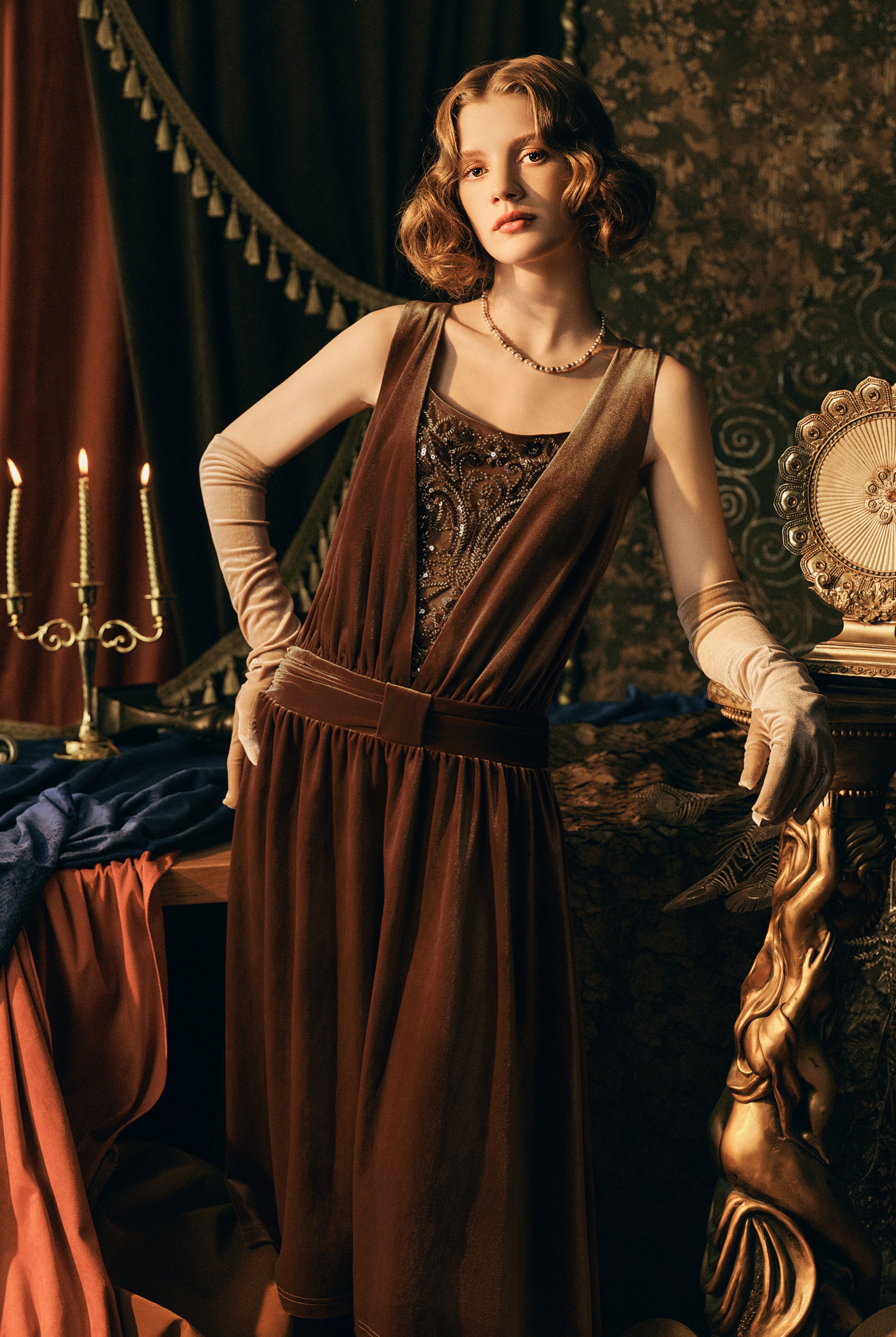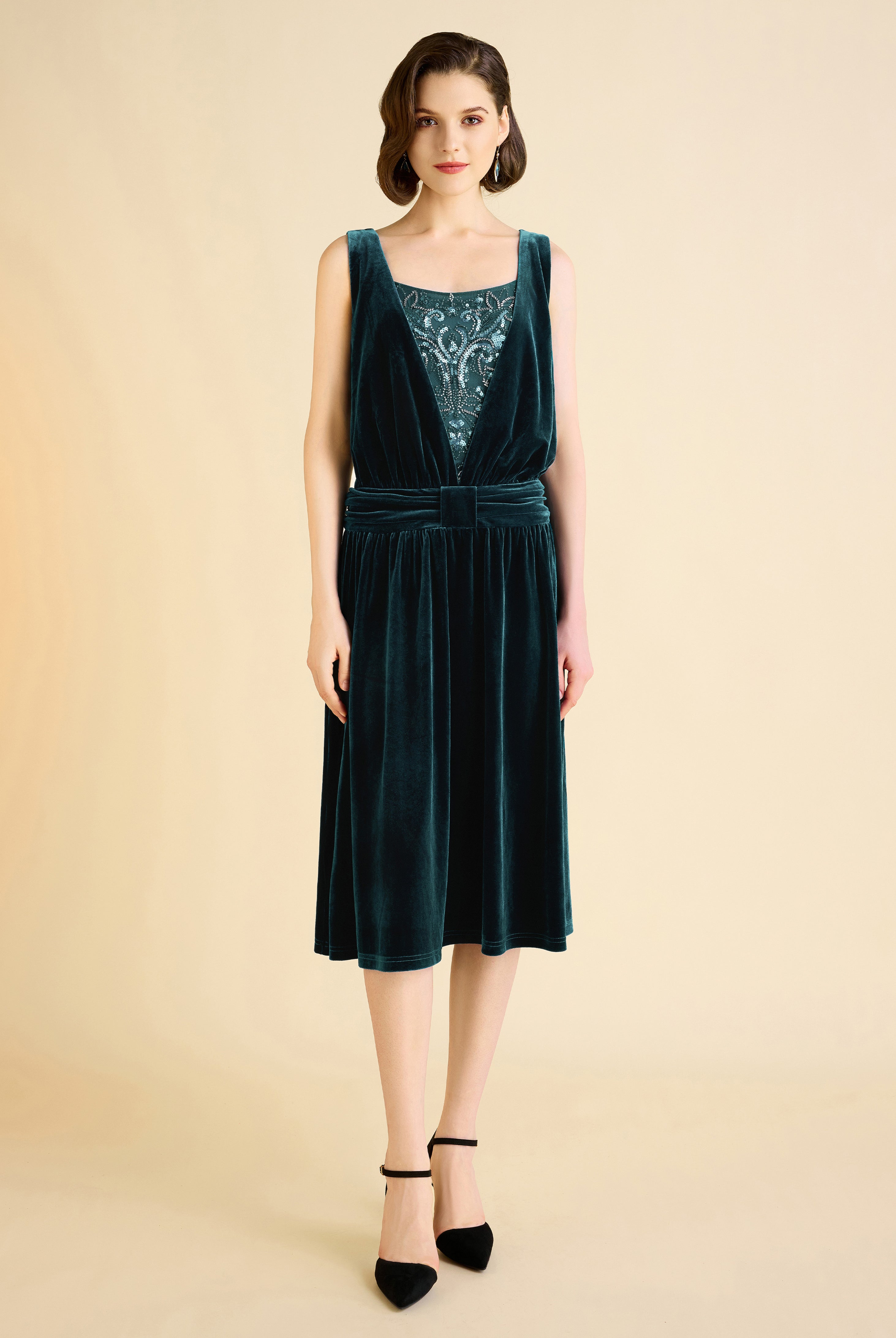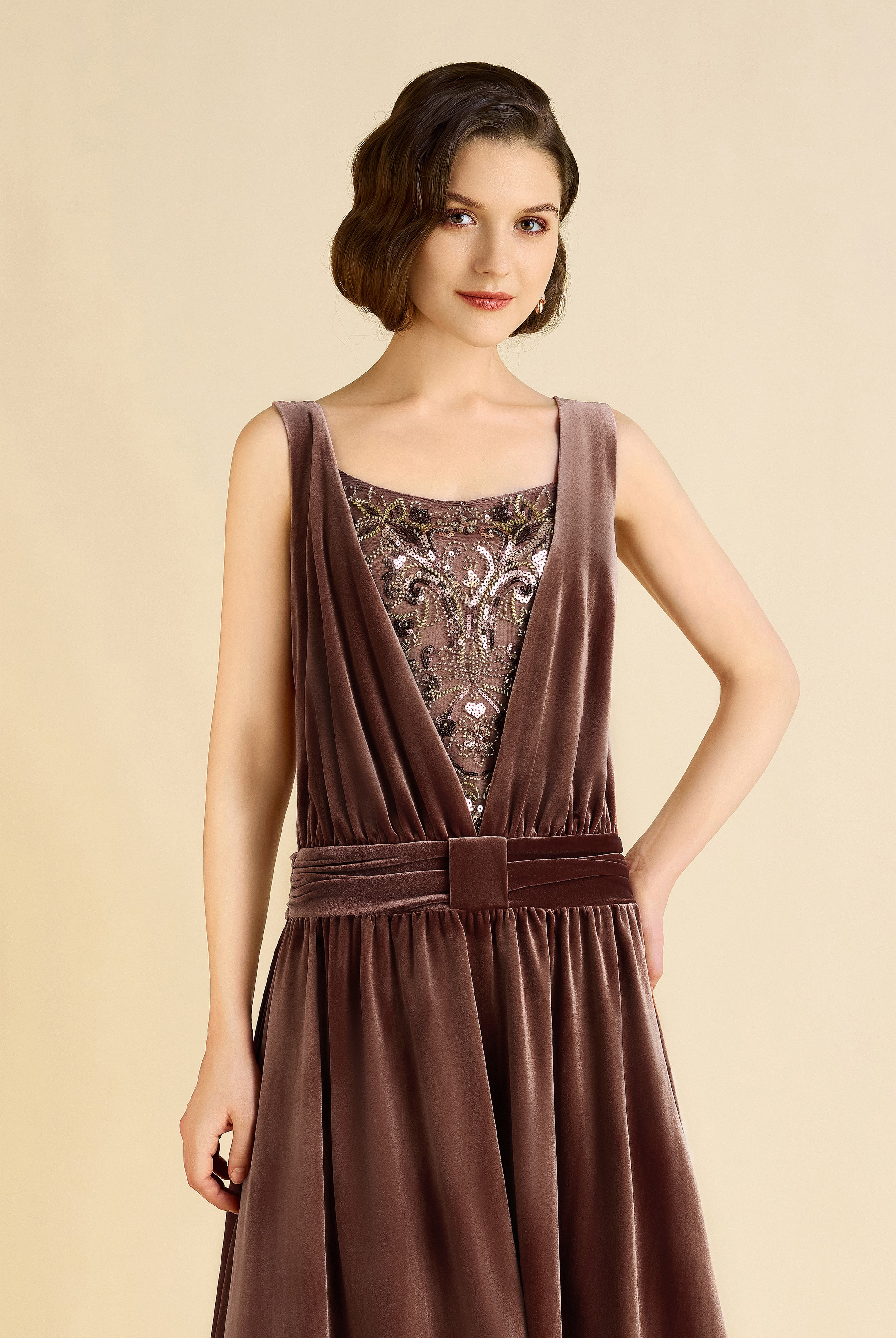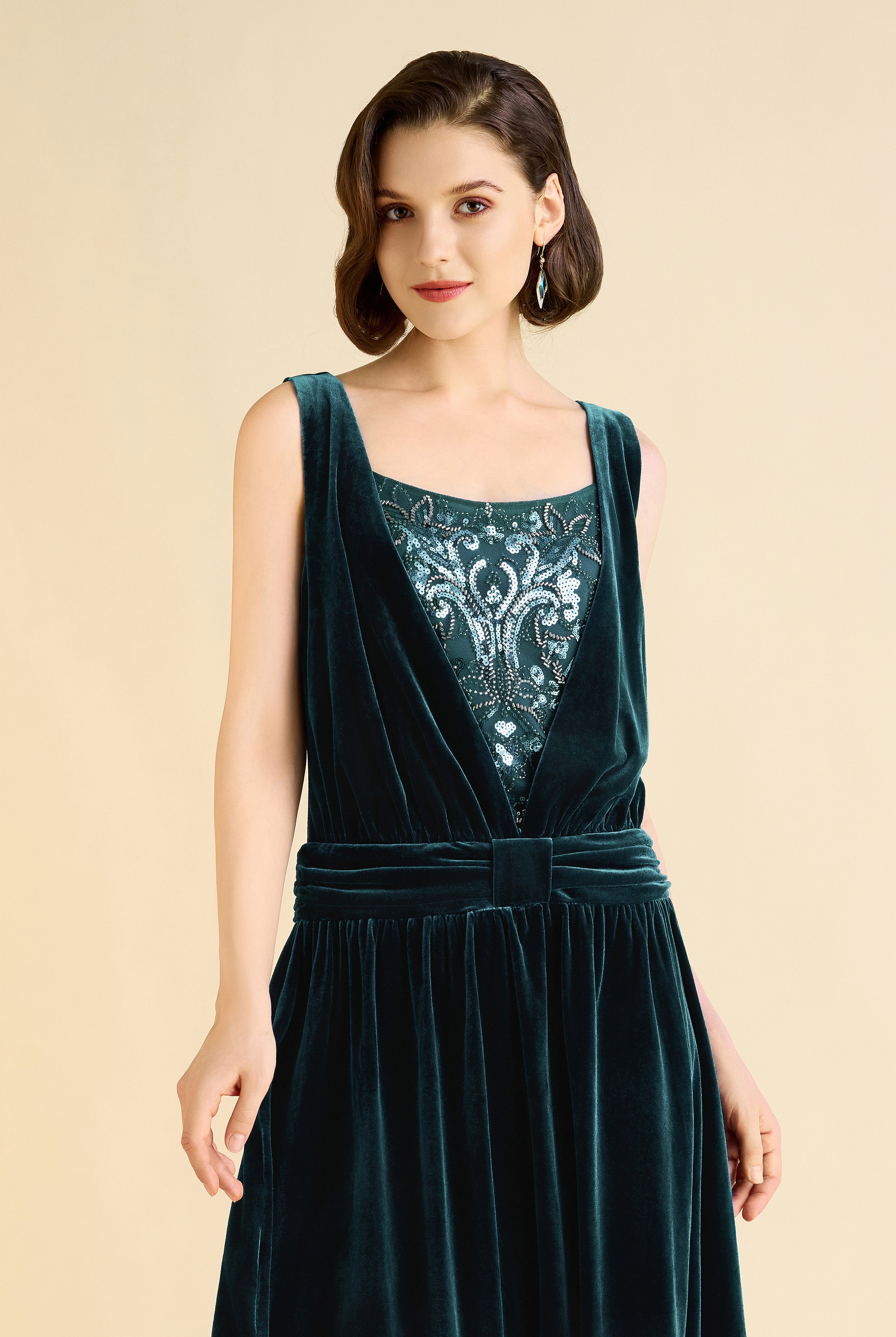 Vintage Velvet Pleated Waist Belt Evening Gown