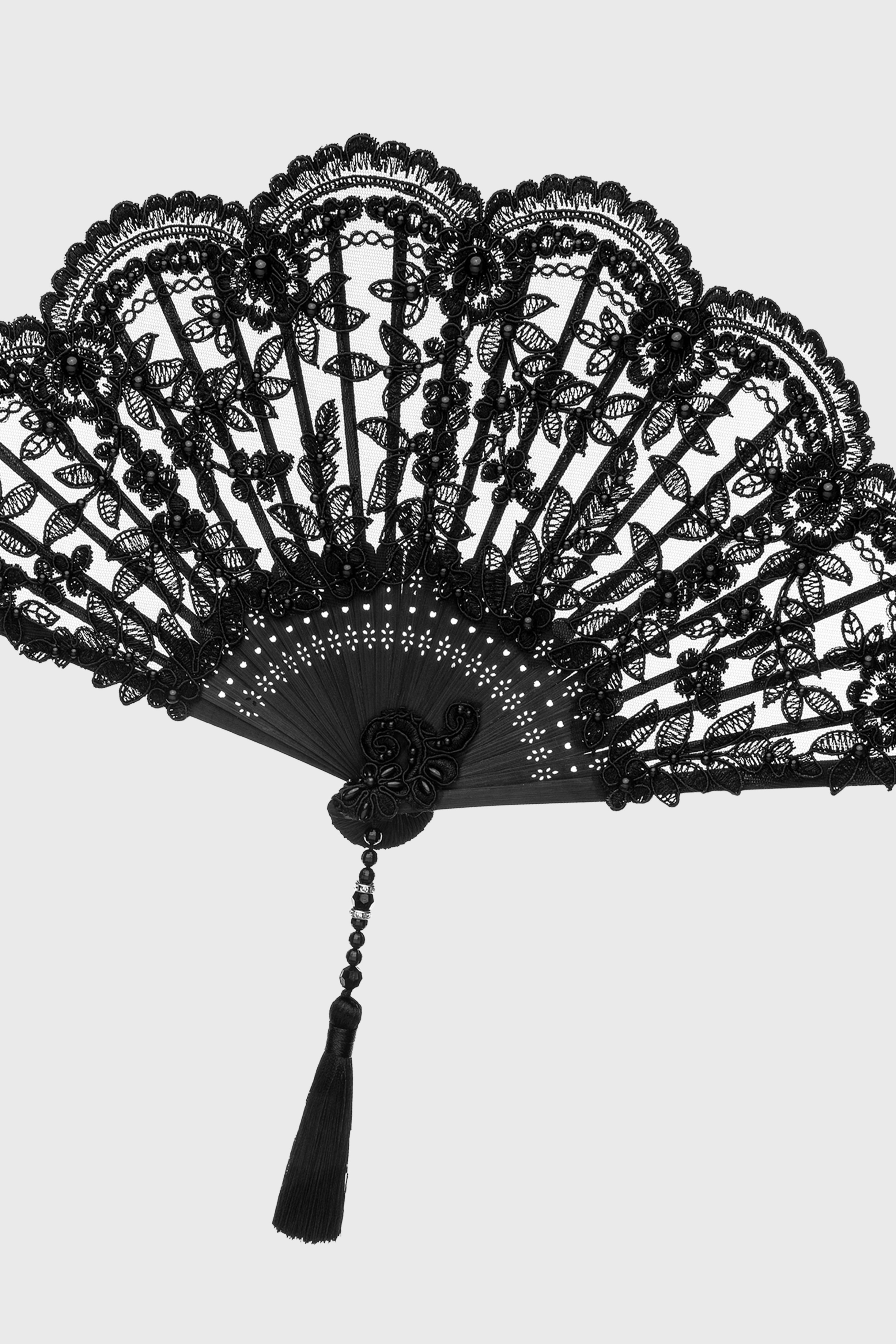 Beautifully crafted with delicate lacework and scalloped edges, this fan brings sophistication and charm. The intricate design is paired with a decorative tassel for added refinement.