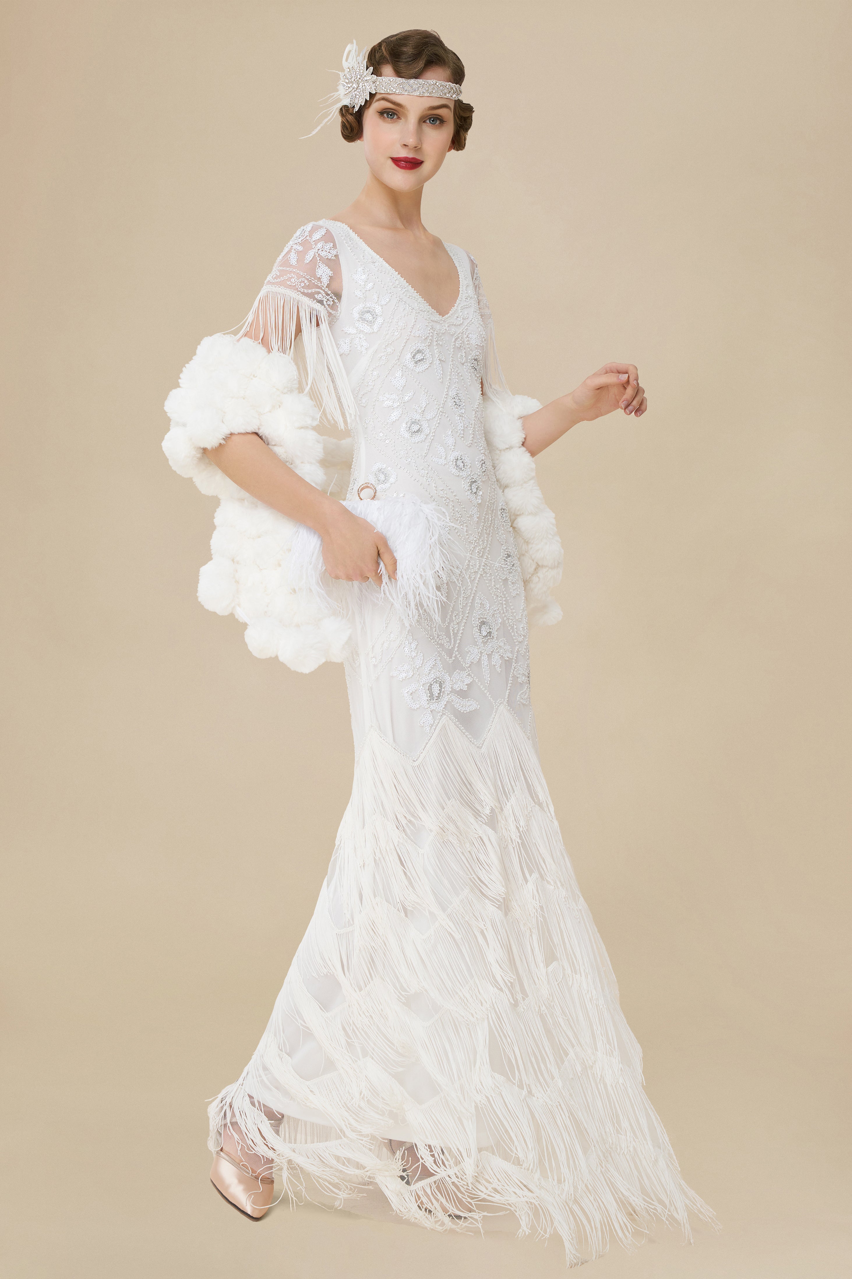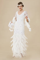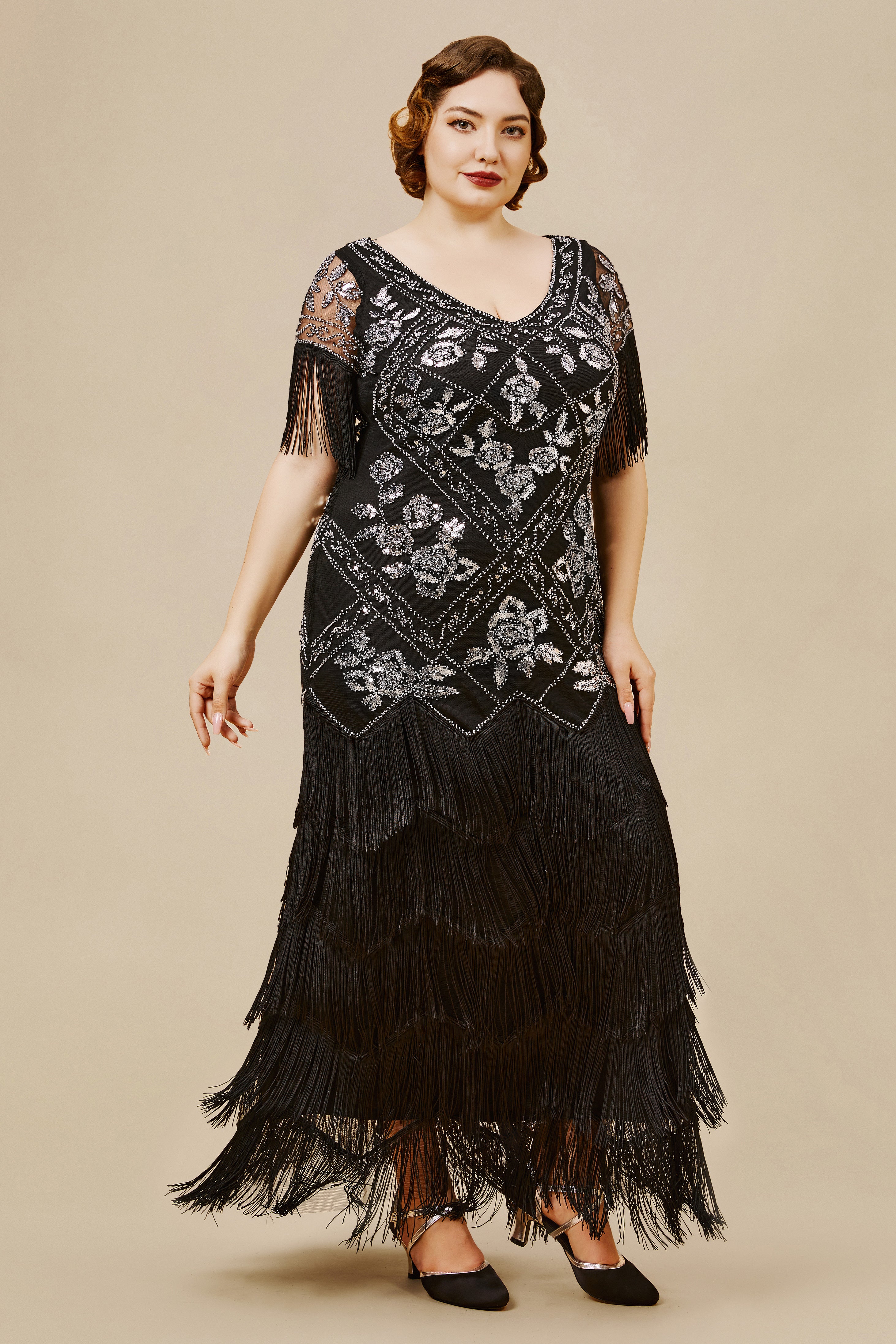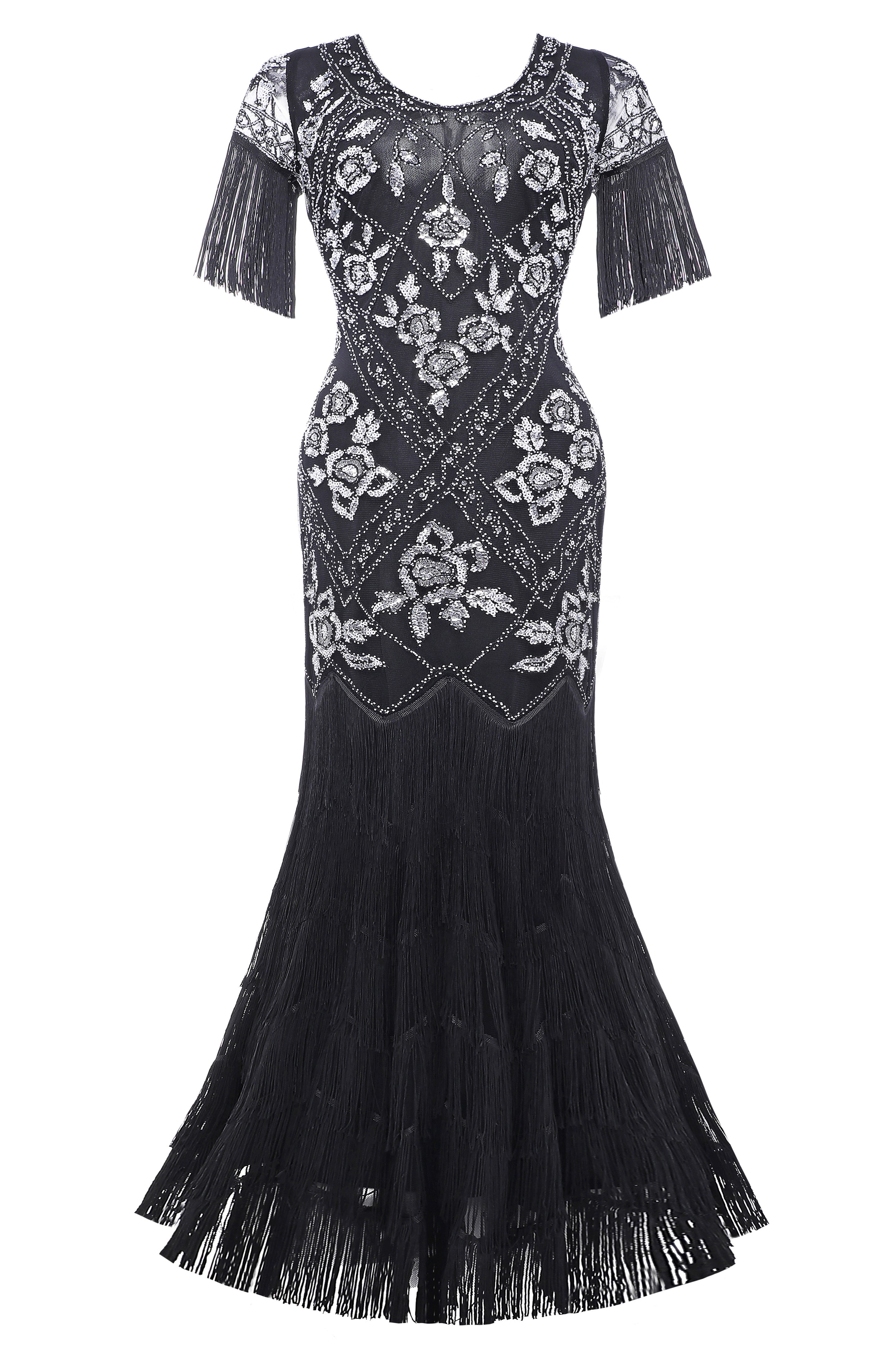 The eyecatching bold v-neck and tulle coverage design create a unique style for your vintage look. Elegant floor-length dress adorned with shimmering sequins and beading.
