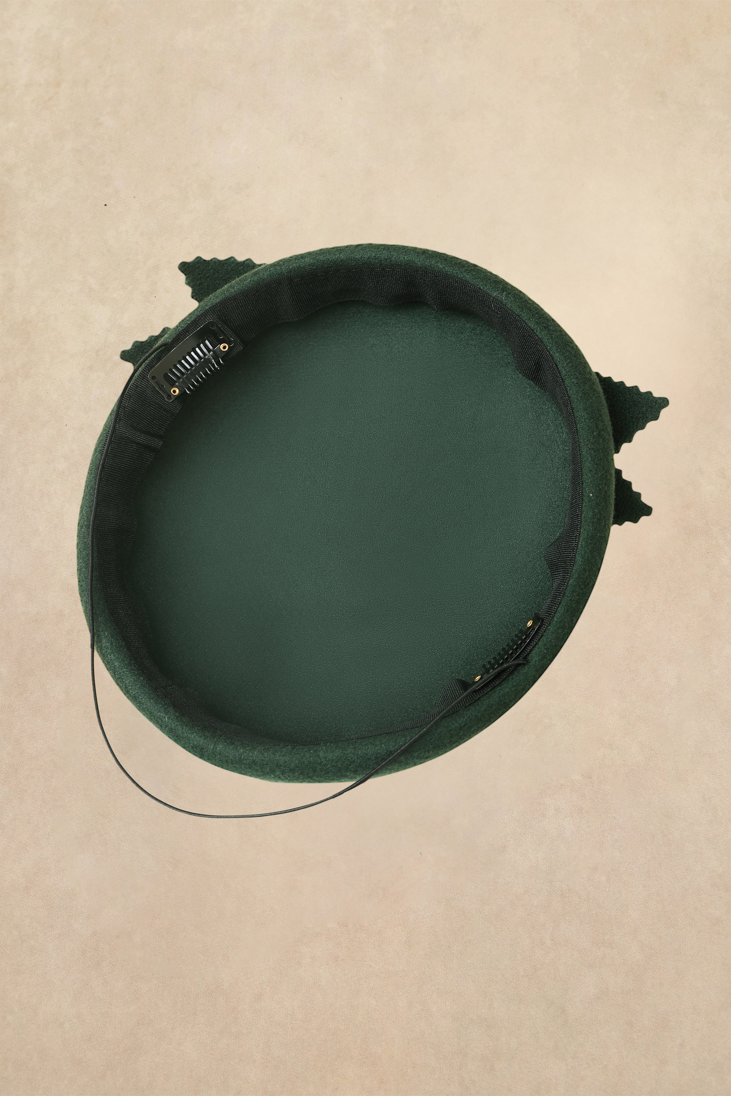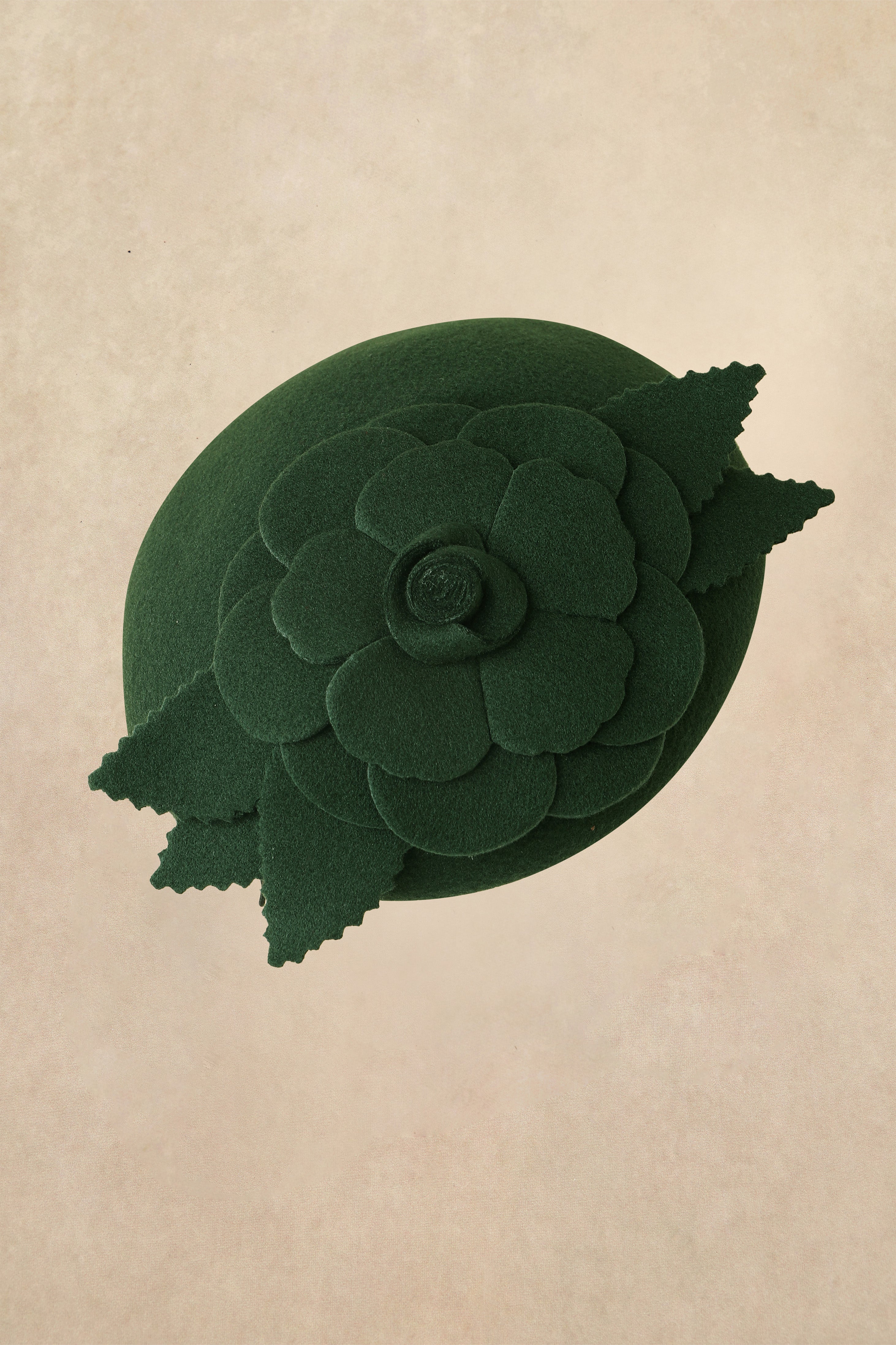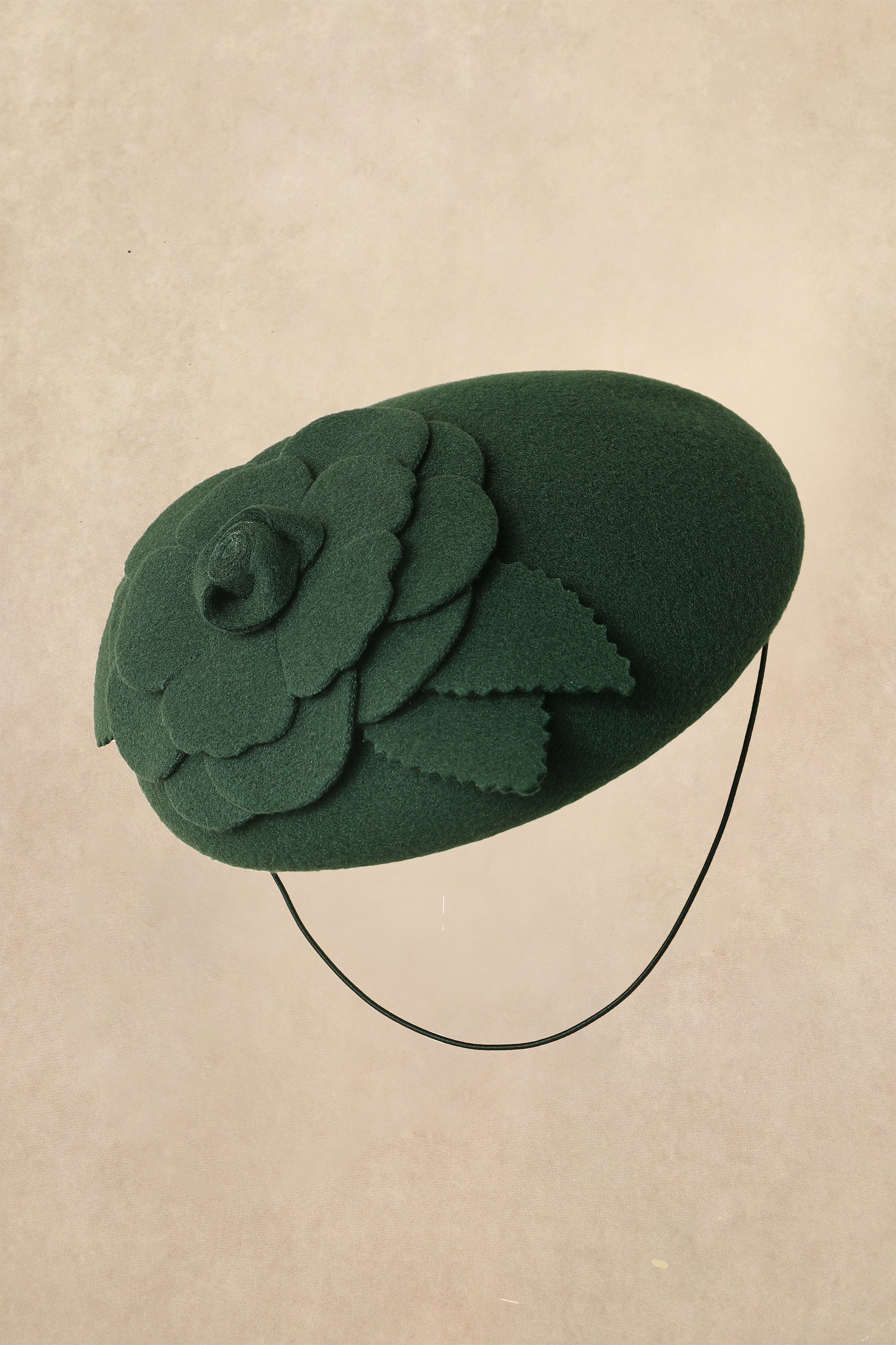 This vintage-inspired fascinator features a classic pillbox silhouette—a compact, rounded felt base that sits neatly on the head with no visible brim. Adorned with a lush cluster of layered felt flowers and serrated leaf details, it balances soft romanticism with structured old-world elegance.