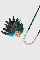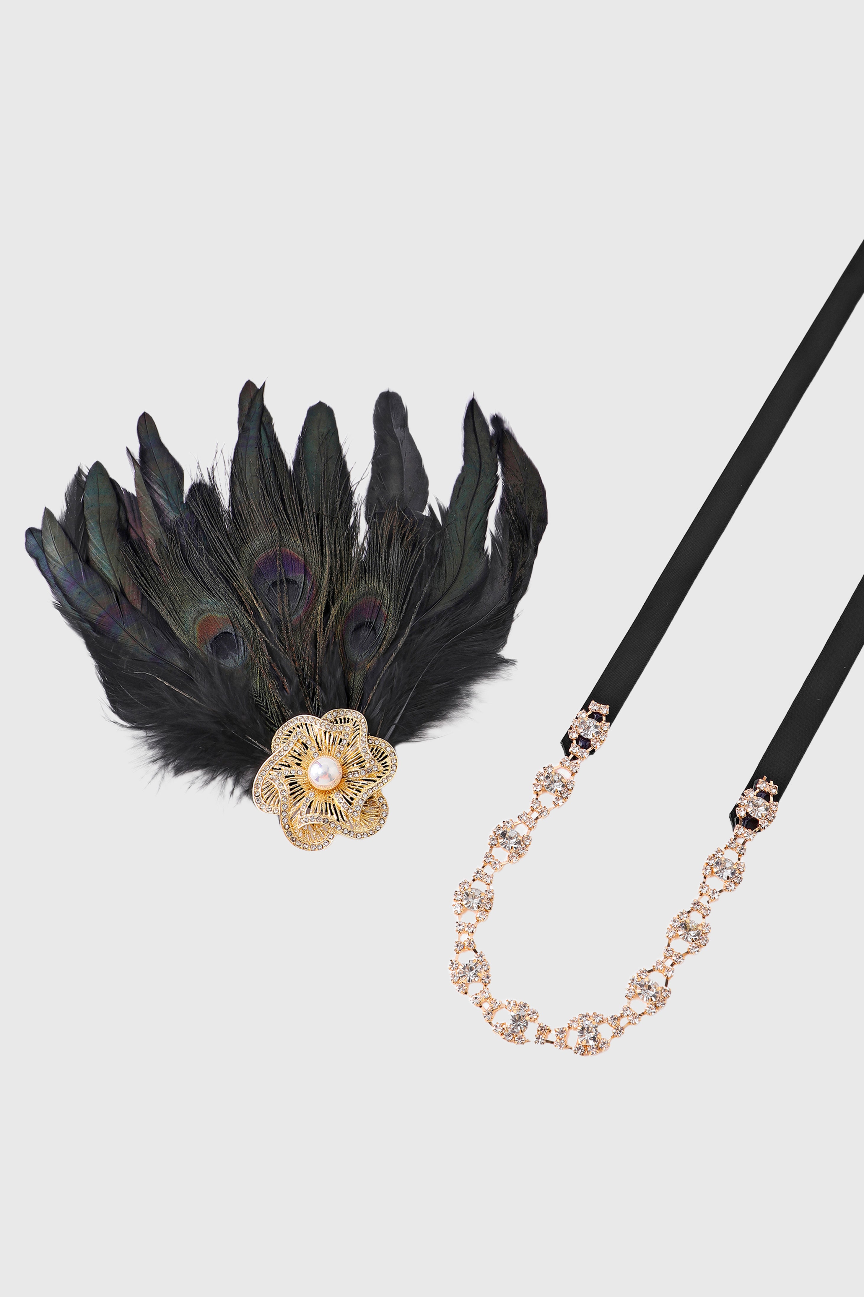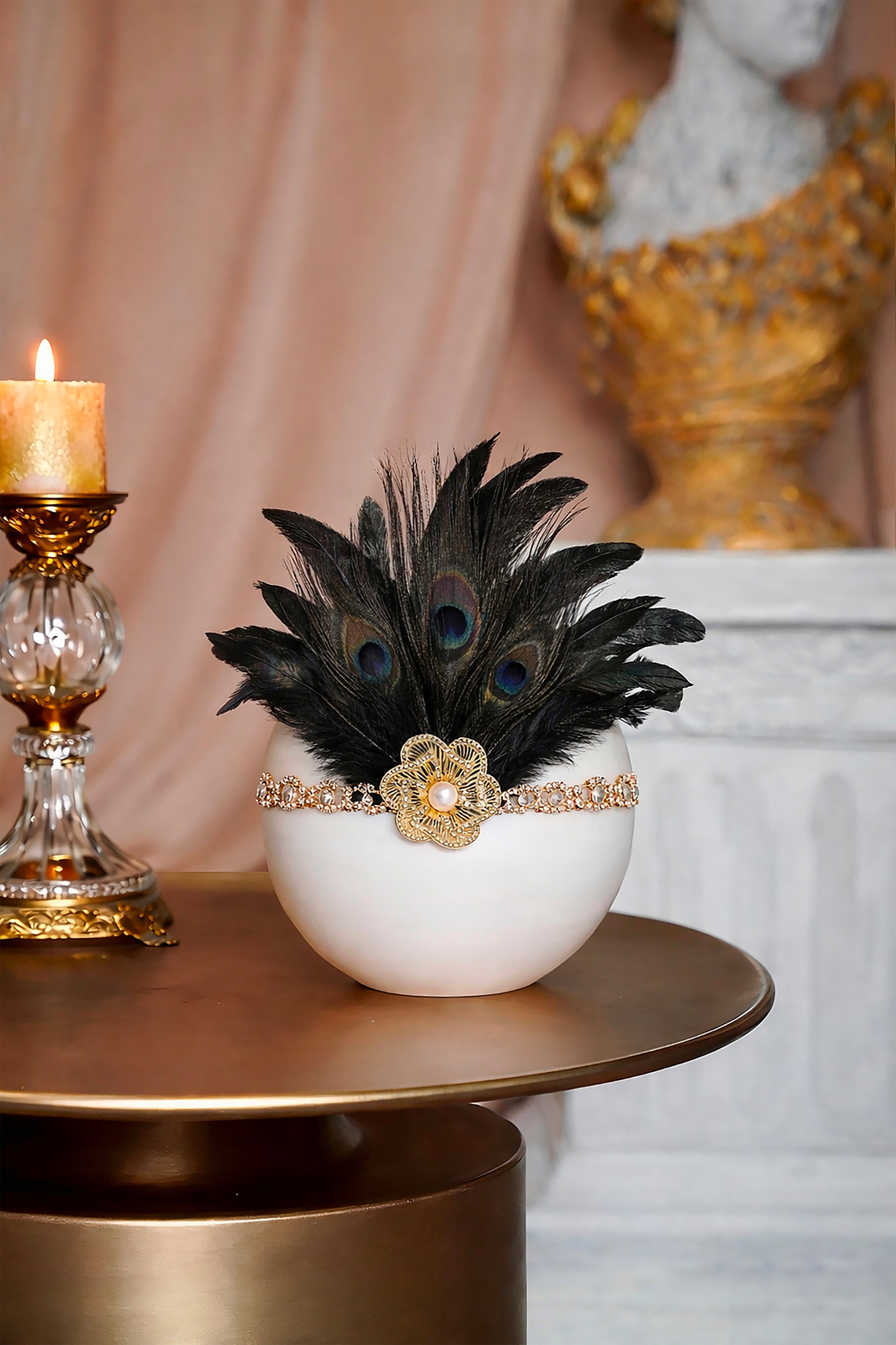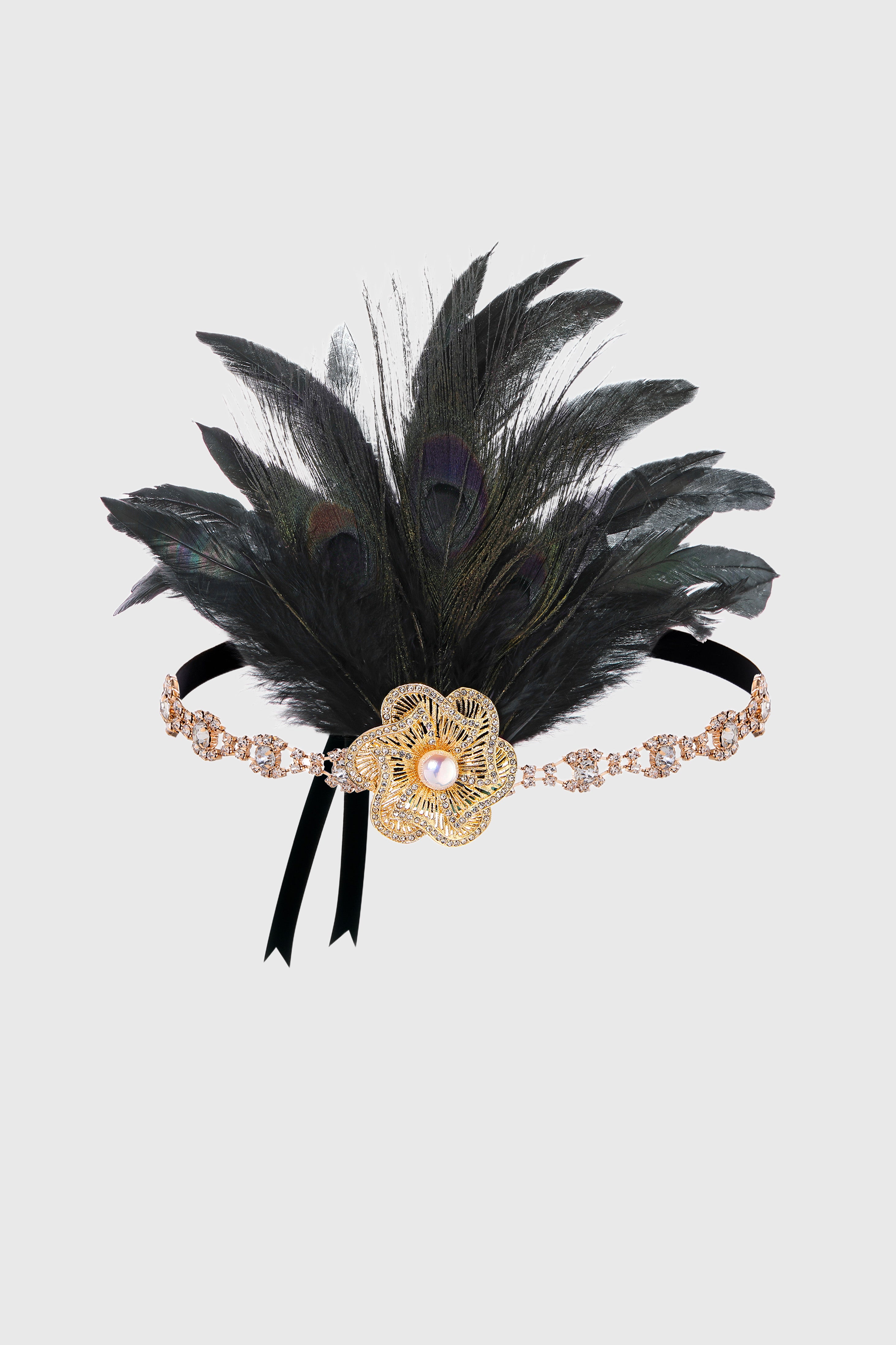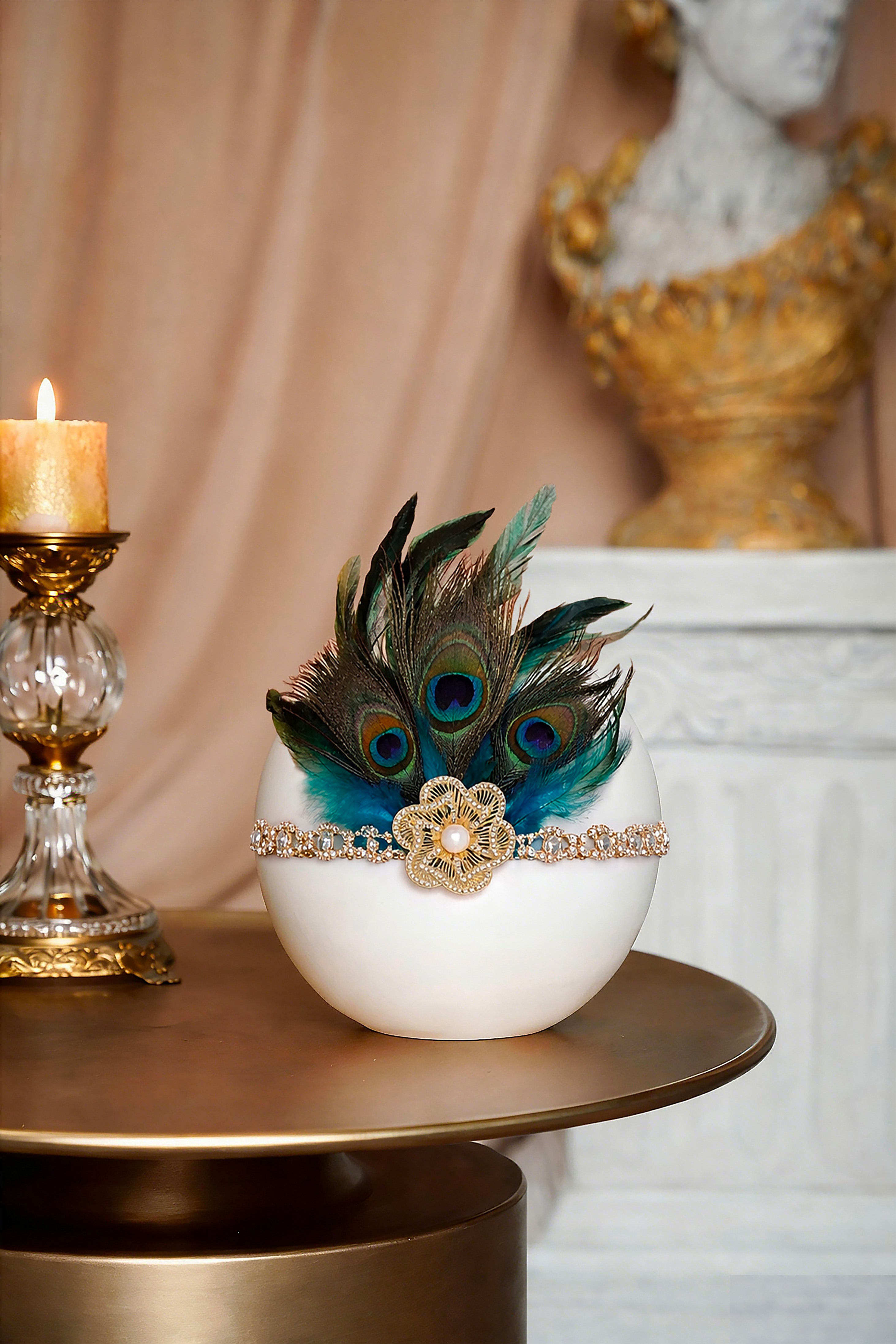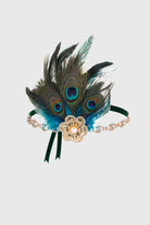 This elegant headpiece pairs dramatic peacock feathers with a delicate crystal chain band, finished with a pearl-adorned floral accent. Secured with a soft ribbon tie, it brings 1920s flapper glamour to weddings and special occasions.