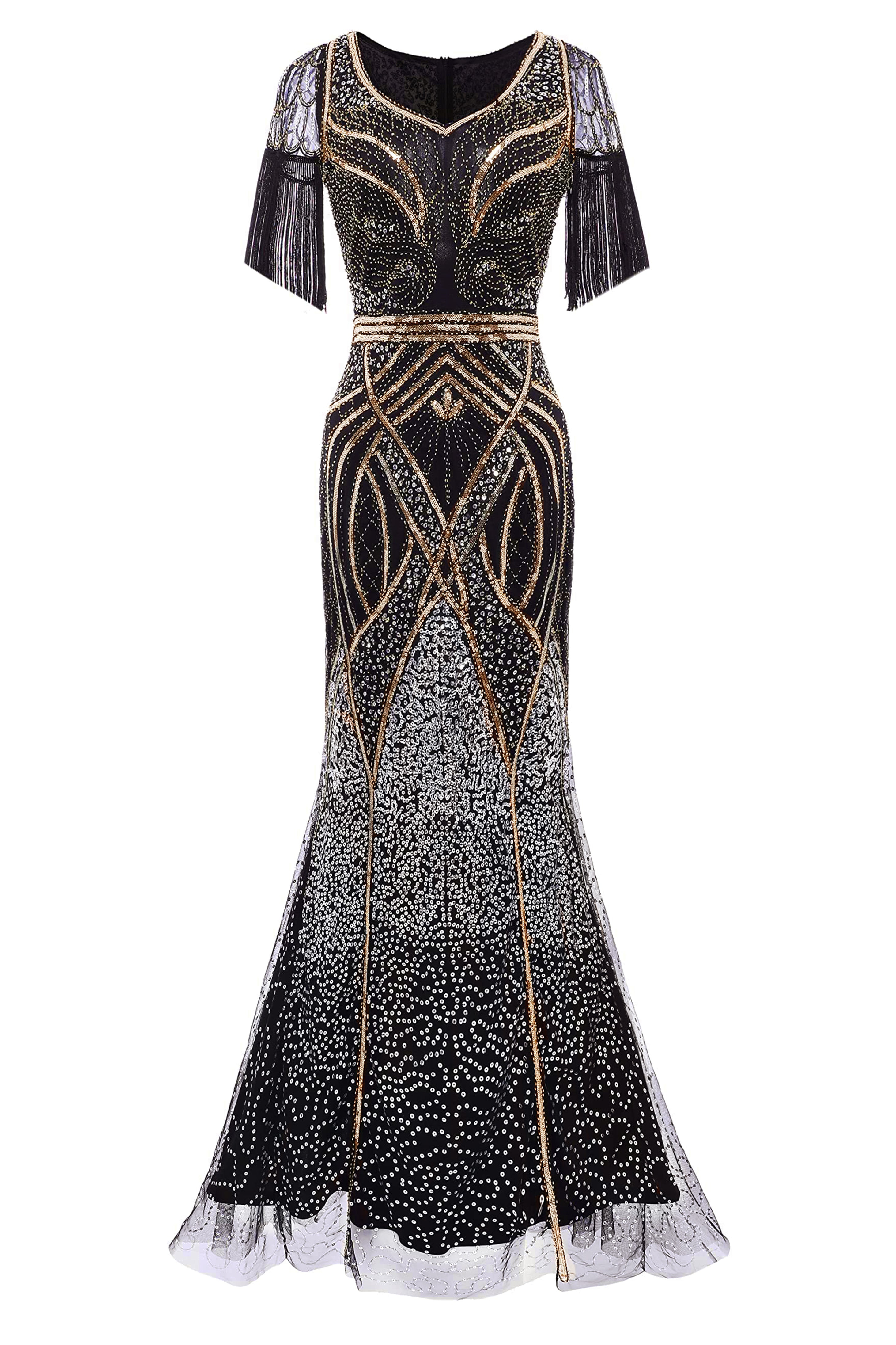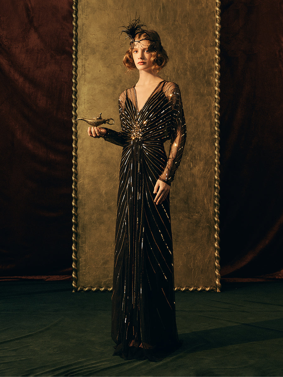 Glittering Sheer-Sleeve Sequined Evening Gown