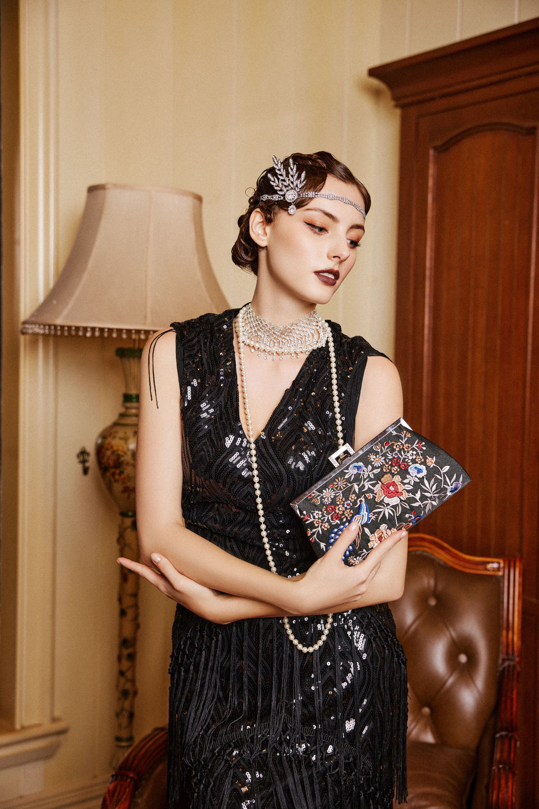 During this period, women actively sought greater recognition and opportunities in various aspects of life, including the workplace, politics, and social interactions. The fashion trends of the 1920s reflected this aspiration for progress and empowerment. Accessories such as long strands of pearls, beaded handbags, and distinctive jewelry emerged as symbols of the evolving woman: self-assured, refined, and poised to engage with the world. Each strand of pearls adorning a flapper’s dress and every feathered headpiece moving gracefully to the rhythm of jazz represented a woman embracing modernity and redefining societal norms.