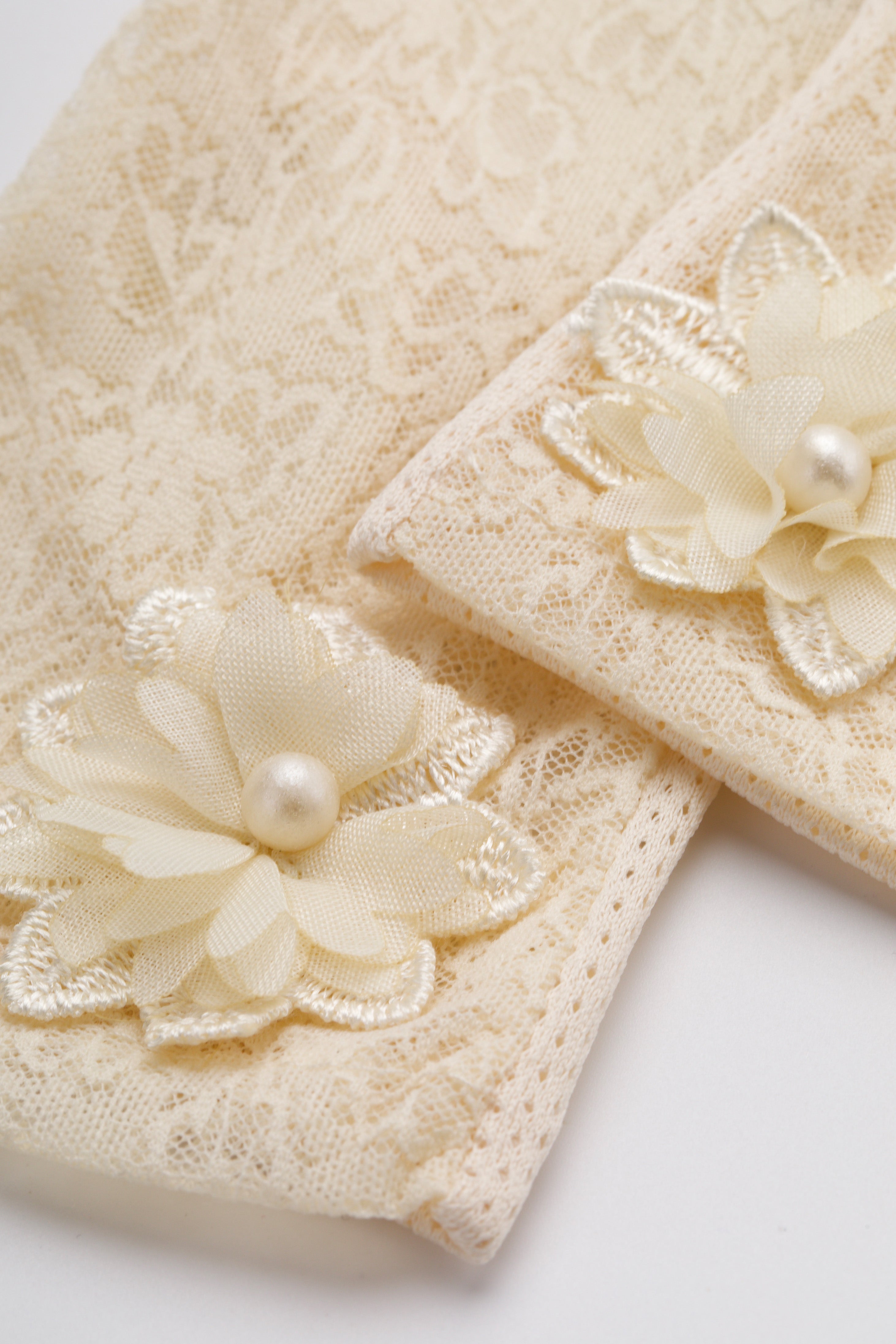 Featuring exquisite floral lace detailing and a delicately designed flower embellishment with a pearl center, they exude vintage elegance while remaining modern and refined.