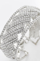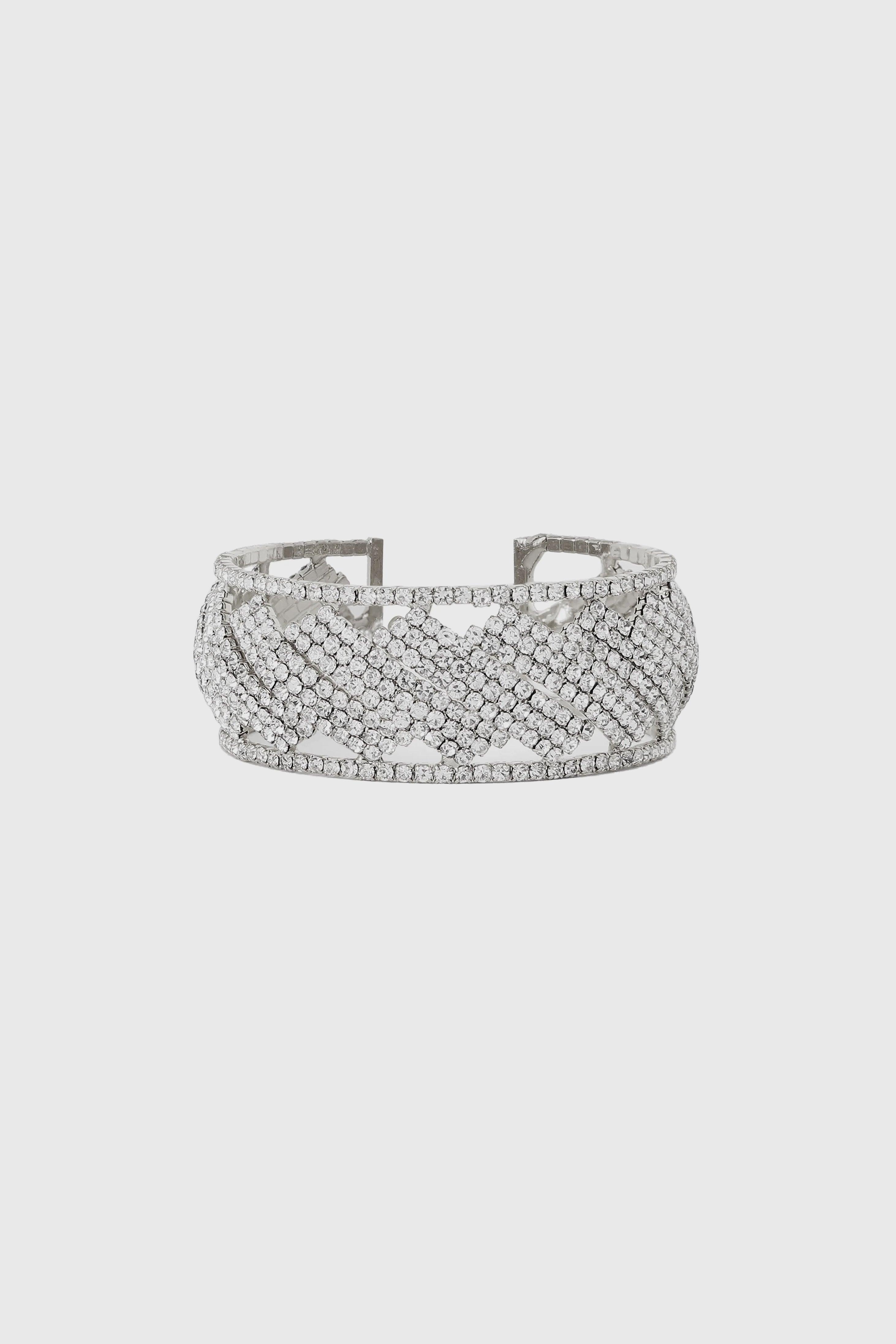 This bracelet features a bold wide cuff silhouette, fully encrusted with crystals in a diagonal wave pattern for maximum brilliance.
