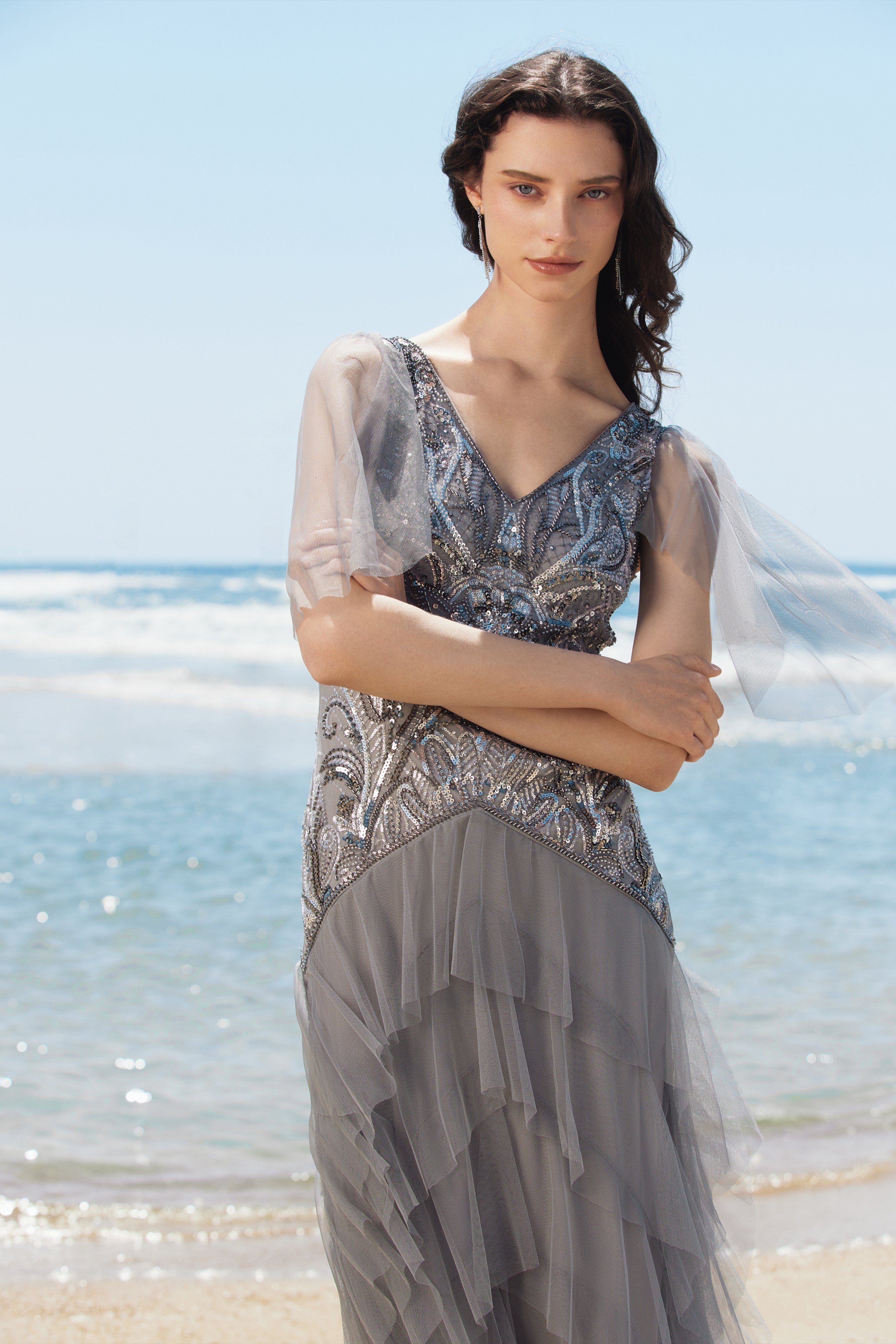 Beaded Sequin V-Neck Mini Dress