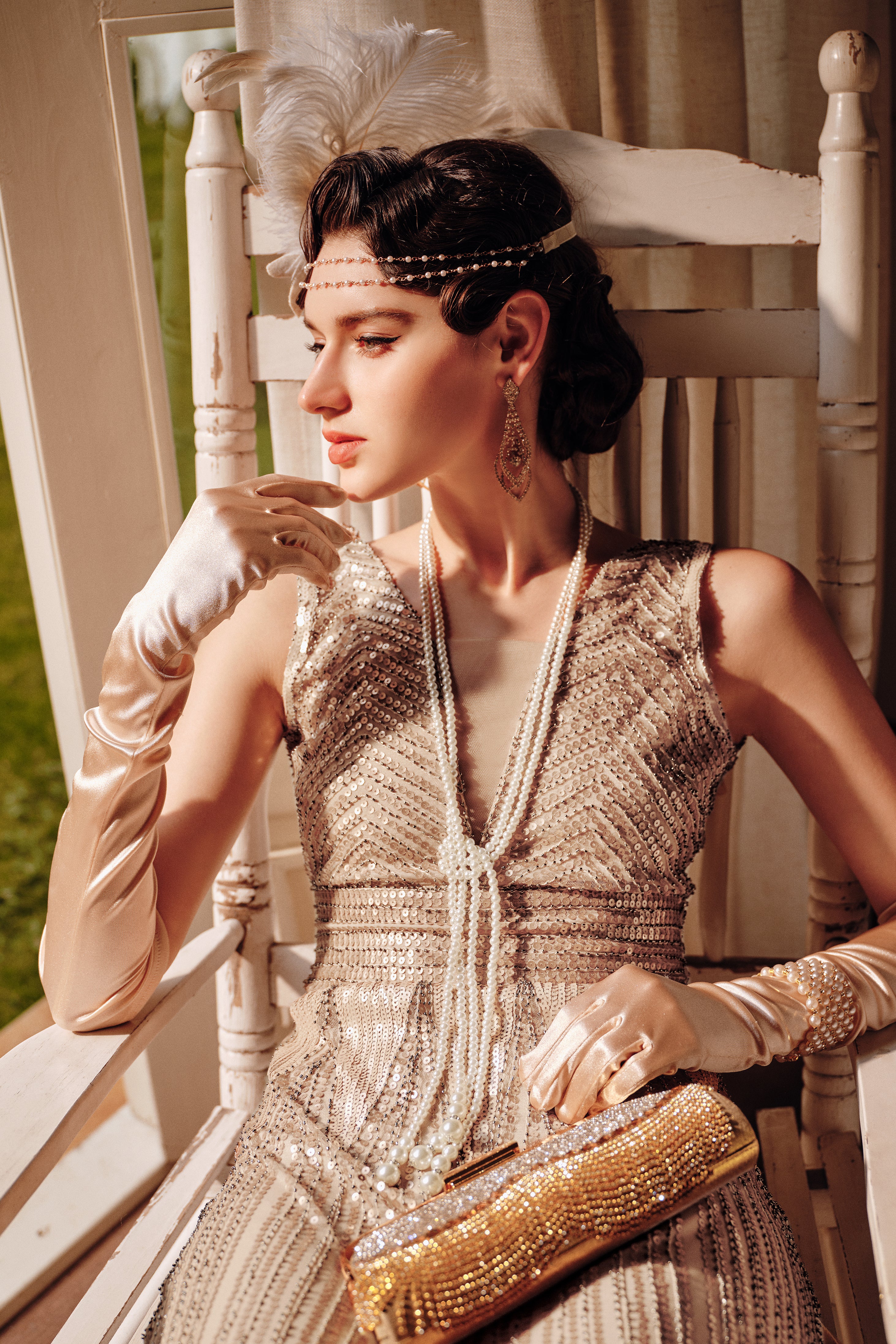 The elbow length satin gloves, which perfectly create an elegant and sophisticated Gatsby style, suit for all kinds of fancy flapper outfits.