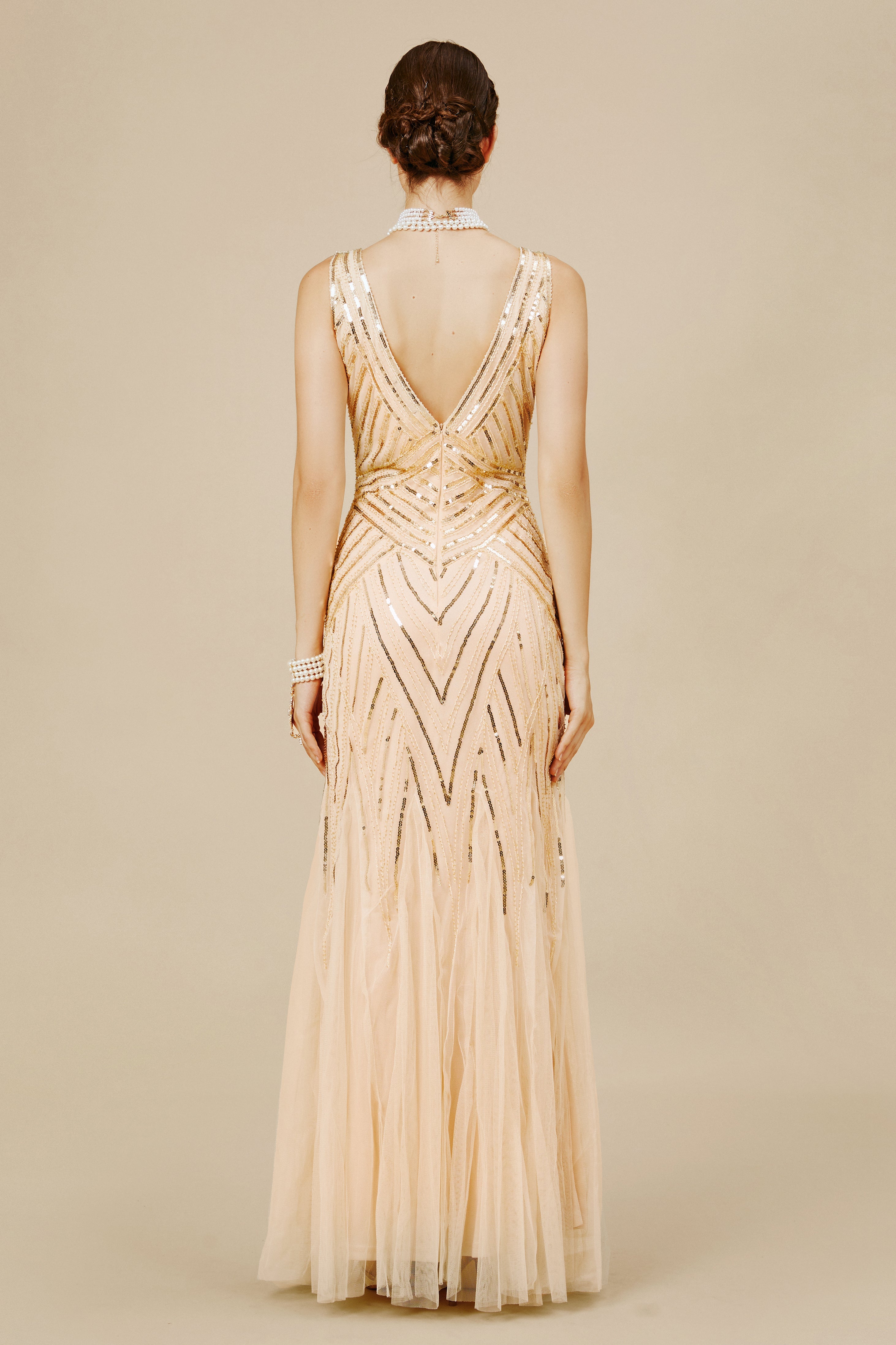This elegant dress is classic vintage look for a modern woman. The eyecatching design features art deco print and unique vintage style which bring you back to the roaring twenties.